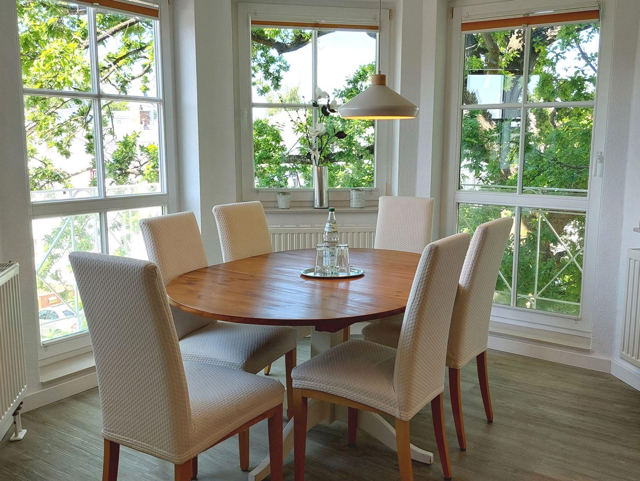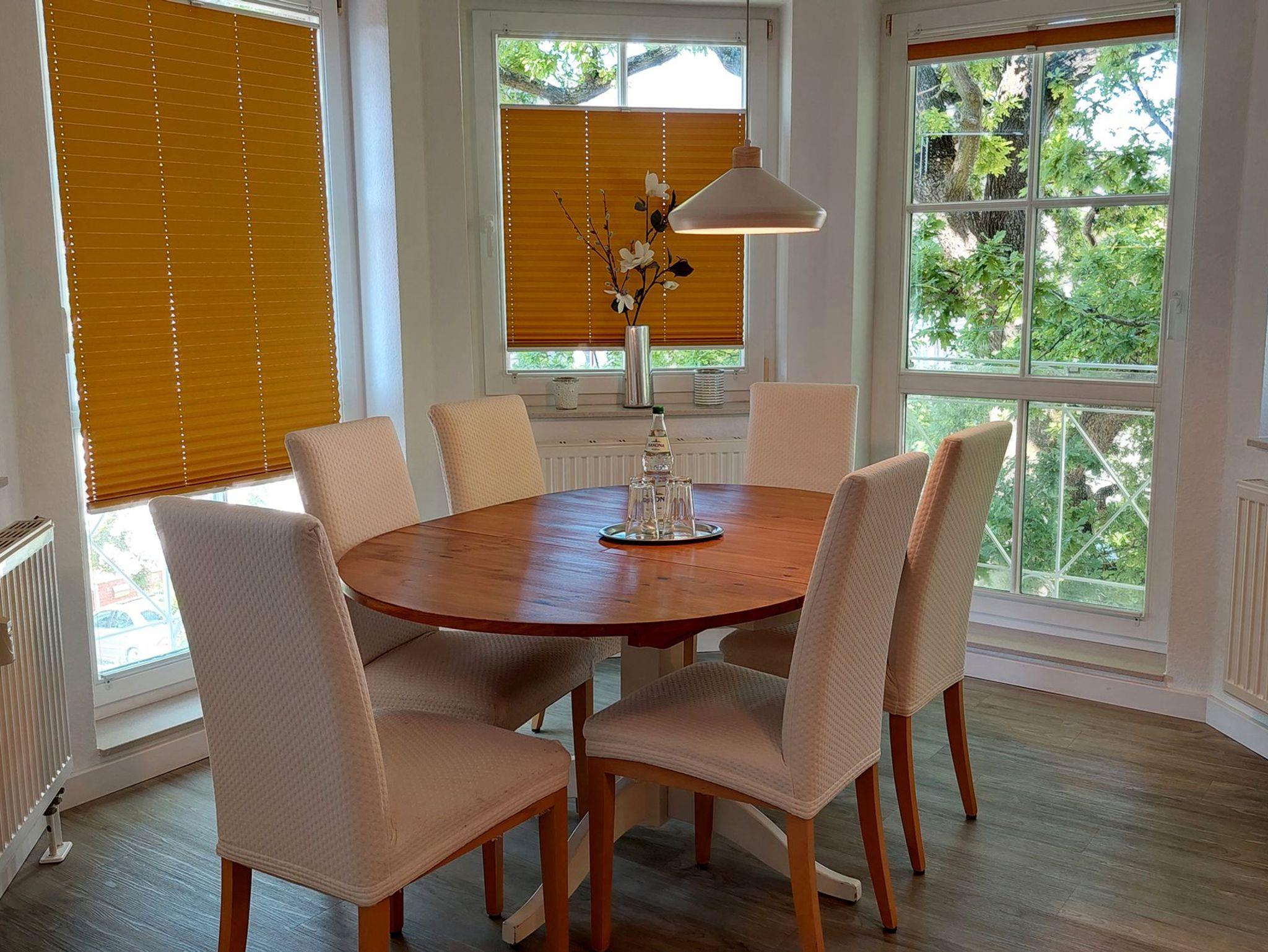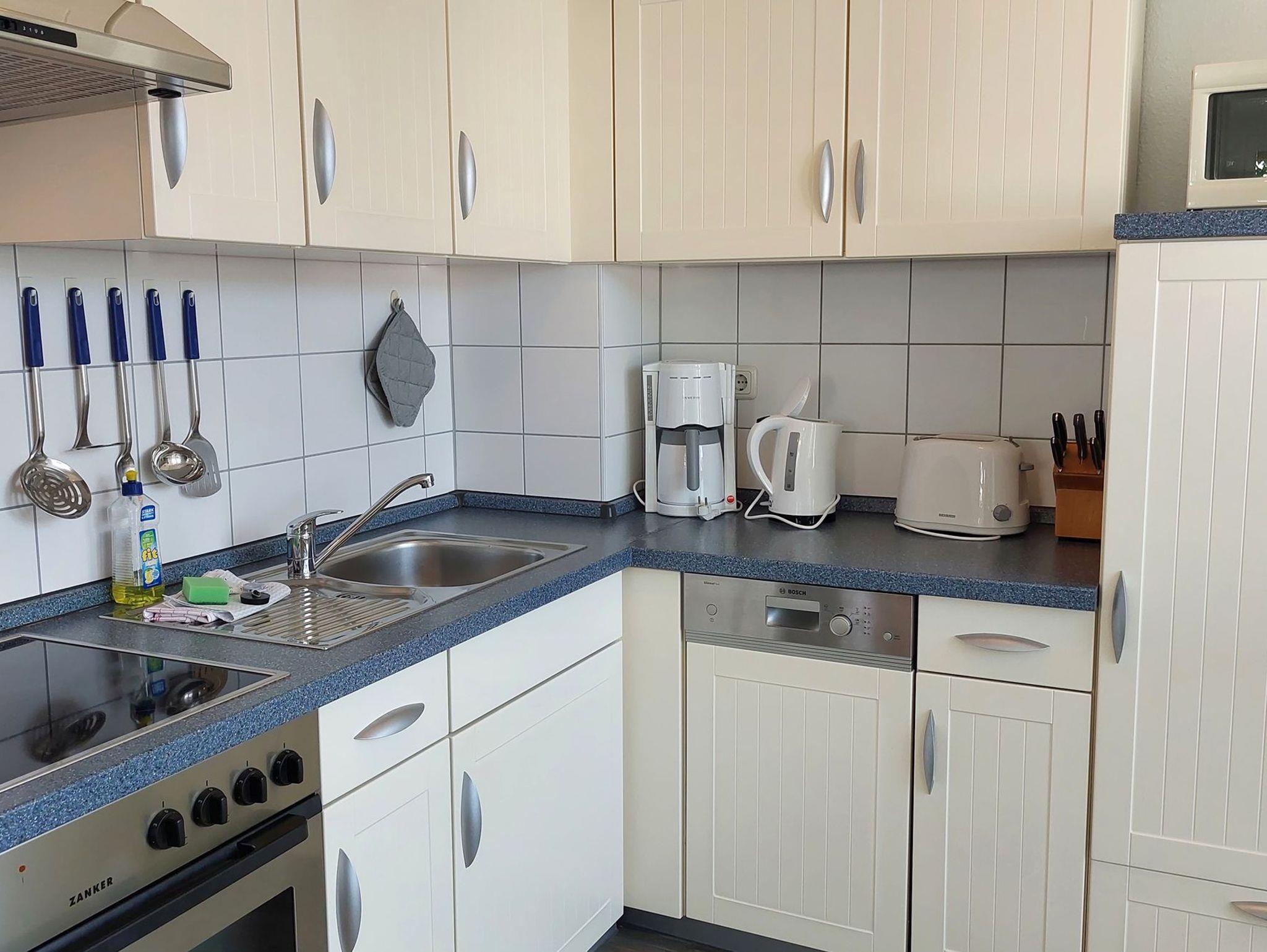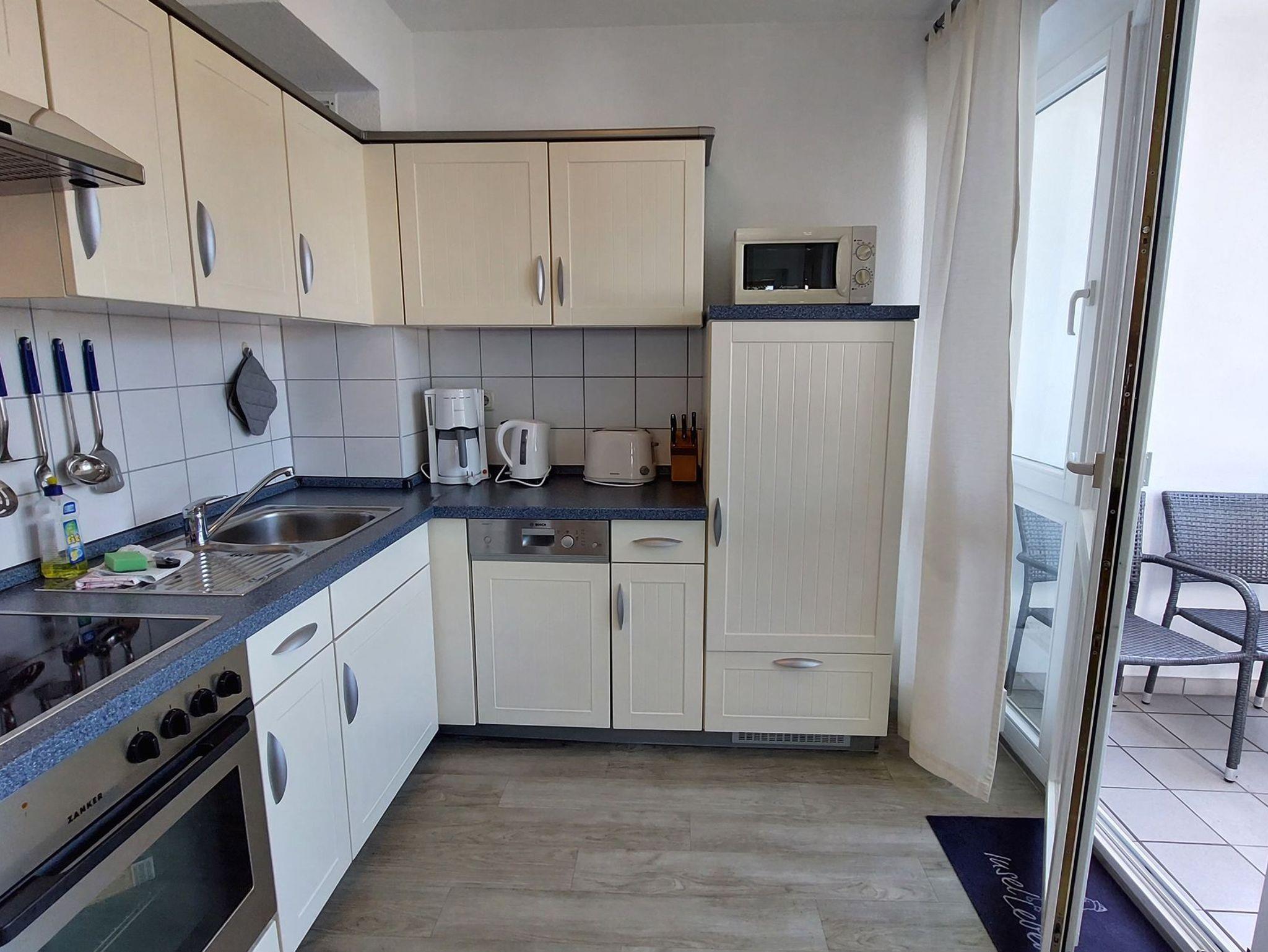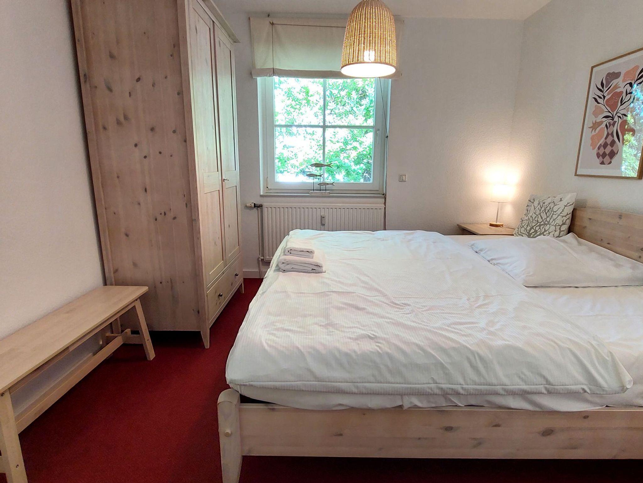 Die Wohnung teilt sich auf in Wohnraum mit Erker und Balkonzugang sowie komplette Küchenzeile, ein Badezimmer, eine zweite Naßzelle, zwei Schlafräume, Flur und Abstellkammer. Im Wohnraum finden Sie neben der Sitzgruppe mit Schlafsofa noch einen separaten Essplatz. Ein Flachbildfernseher mit Radiofunktion und einen Blue-ray-Player gehören zur Ausstattung. Das 1,60 m breite Schlafsofa bietet Schlafgelegenheit für die 5. und 6. Person. Die beiden Schlafräume sind jeweils mit Doppelbett (1,80 m und 1,60 m) und Kleiderschrank ausgestattet. Das Badezimmer verfügt über Waschtisch, Dusche und WC. Die Küchenzeile beinhaltet u.a. einen Geschirrspüler, Cerankochfeld, Backofen, Mikrowelle, Kaffeemaschine, Wasserkocher und Toaster. Alle Gäste können einen kostenfreien schnellen WLAN-Zugang (150 MBit) nutzen.