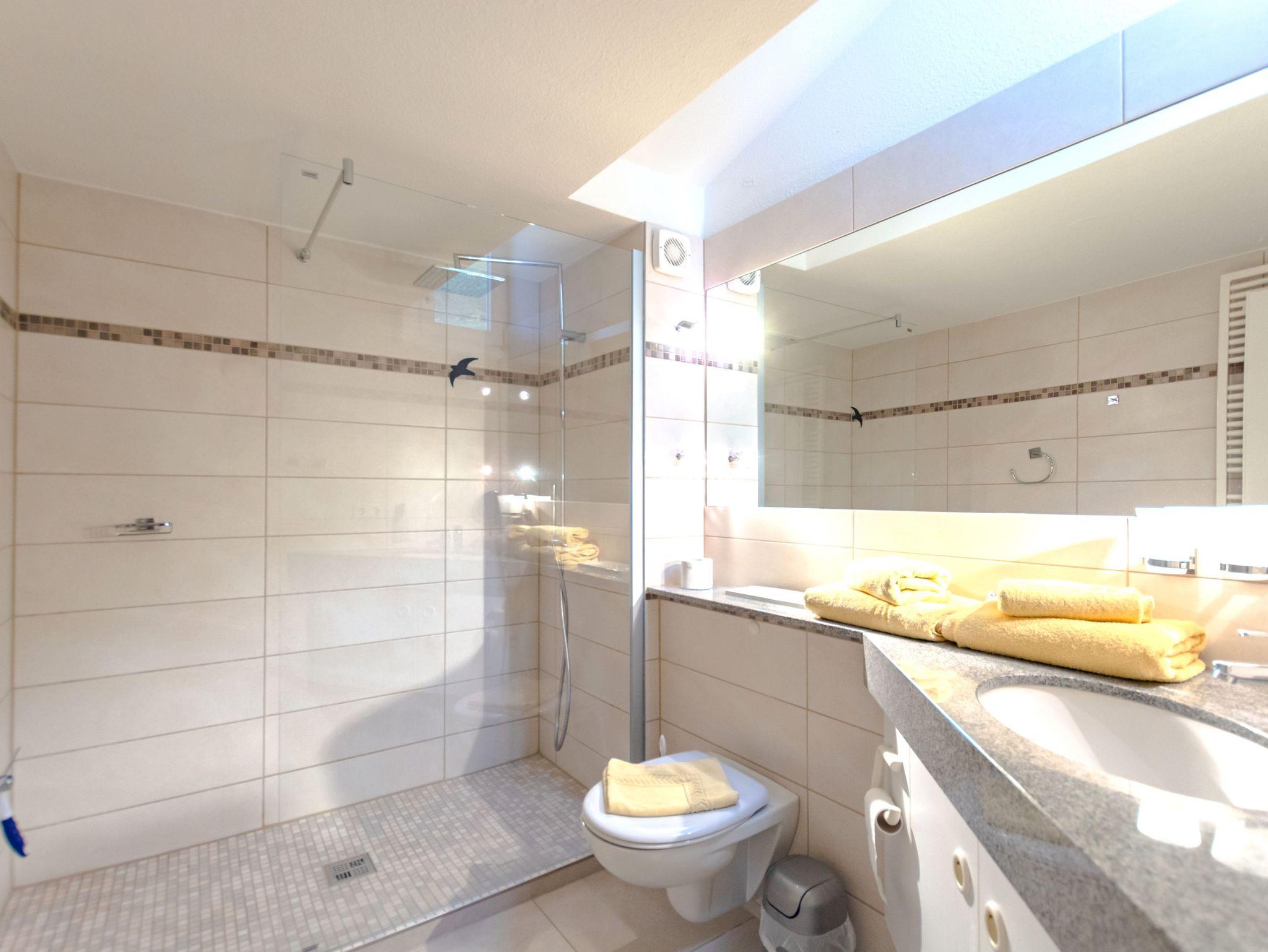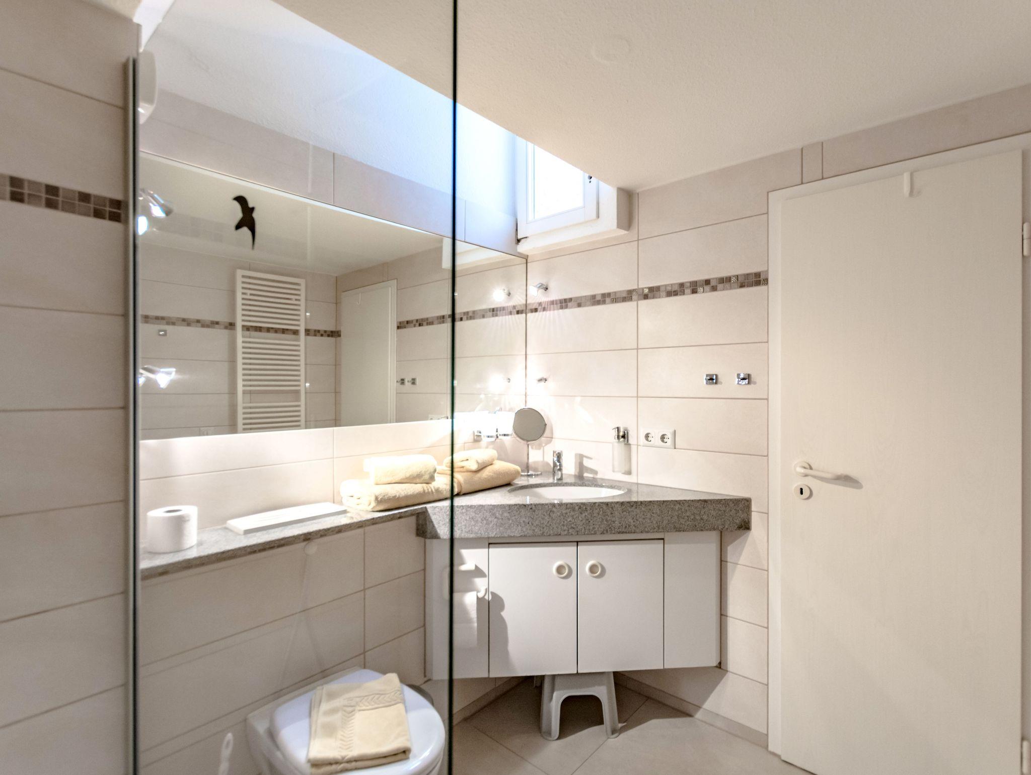 Das Badezimmer verfügt über eine Dusche, Fußbodenheizung und ein Fön ist ebenfalls vorhanden.