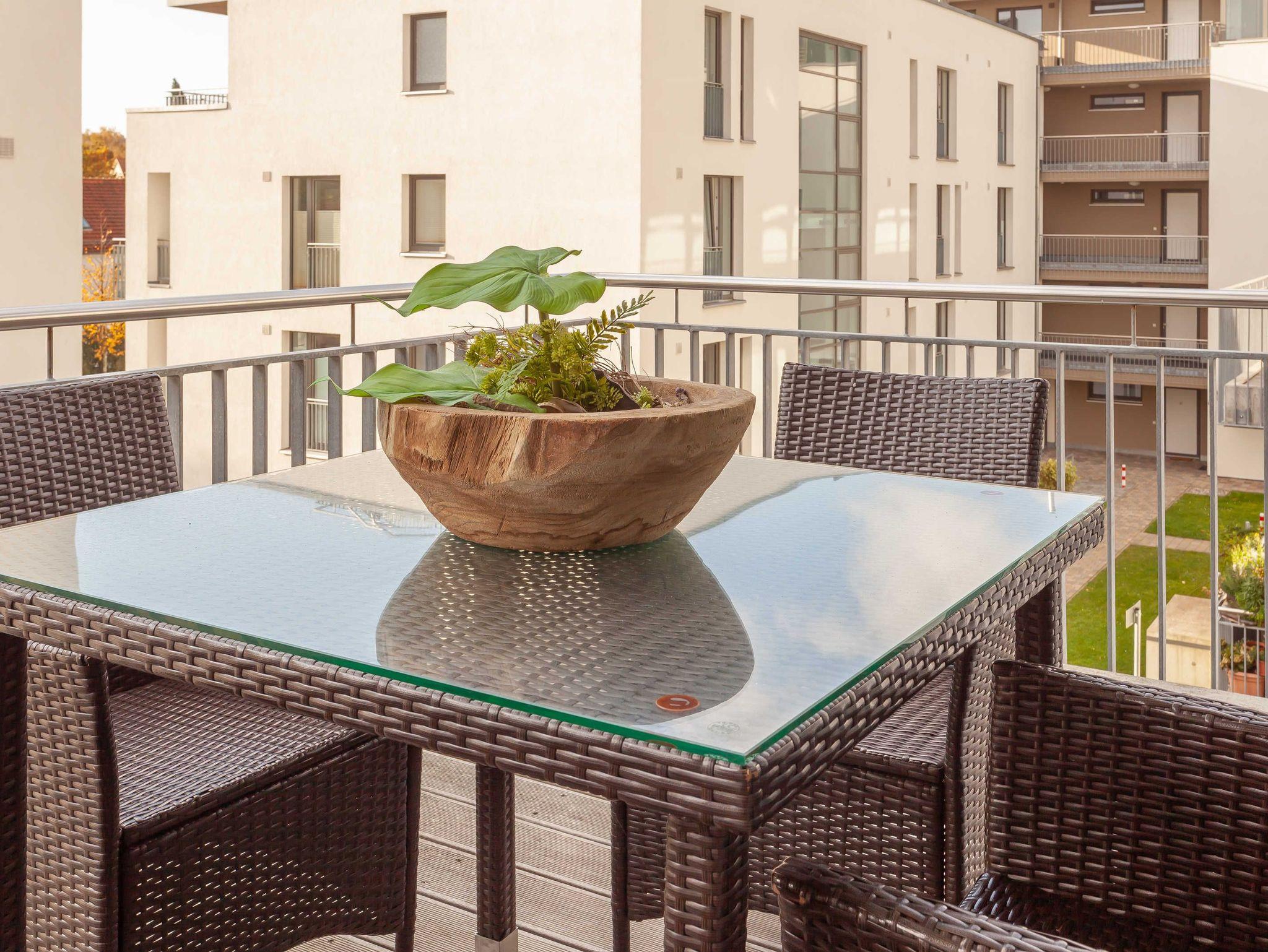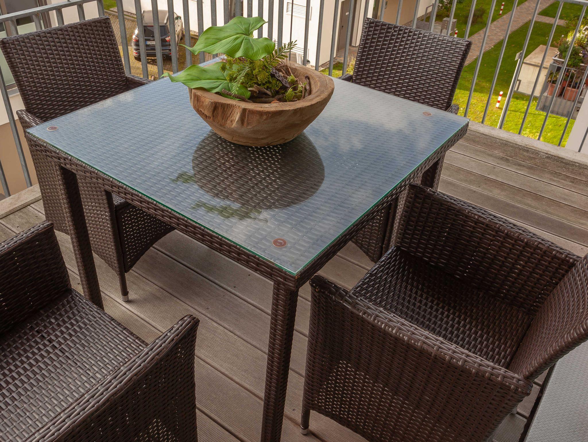 Vom Wohnbereich aus gelangen Sie auf den Balkon mit Holzoptik-Fussboden sowie mit einer 4er-Sitzgruppe mit Tisch, in Rattanoptik gehalten. Besonders zur wärmeren Jahreszeit genießt der Gast seine Zeit hier im Freien, aber aufgrund der Südlage kann man auch schon im Frühjahr oder noch bis in den goldenen Herbst Urlaubszeit draußen genießen.