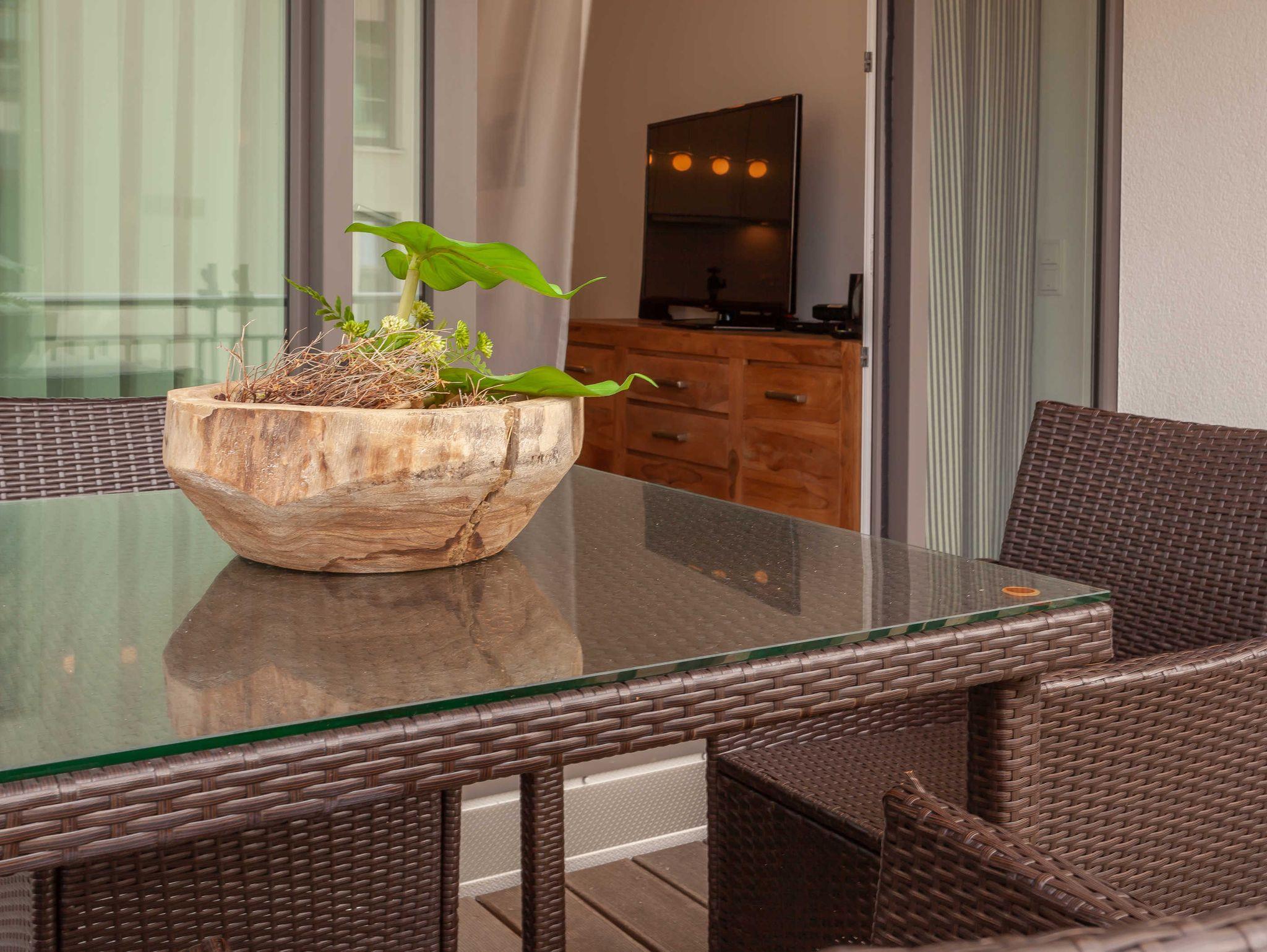 Vom Wohnbereich aus gelangen Sie auf den in Rattanoptik möblierten Balkon. Besonders zur wärmeren Jahreszeit können Sie Ihre Zeit hier im Freien genießen, aber aufgrund der Südlage kann man auch schon im Frühjahr oder noch bis in den goldenen Herbst Urlaubszeit draußen genießen.