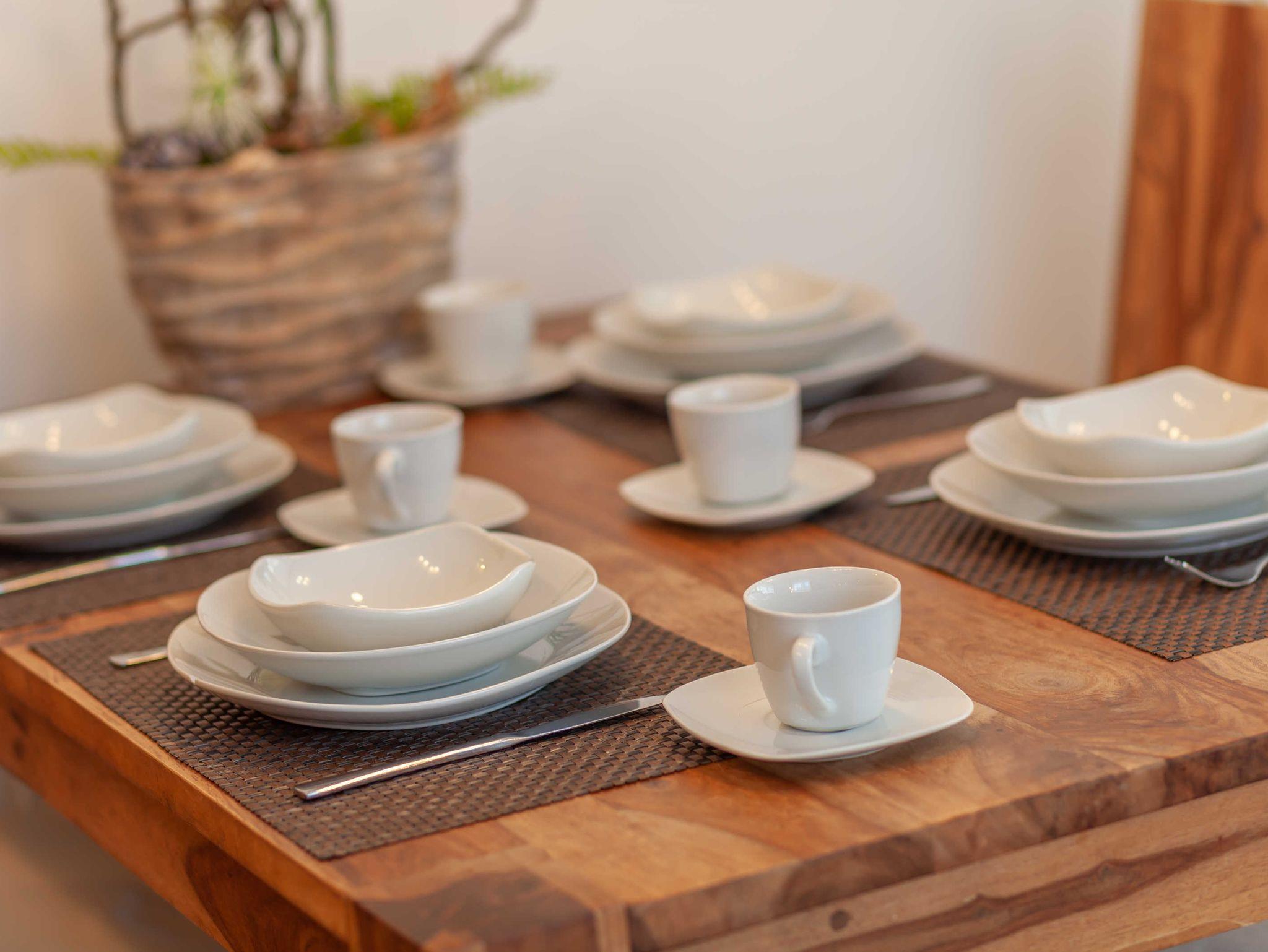 Der schicke Essbereich mit Tisch und 4 Stühlen ist ebenfalls in dieses moderne Wohnkonzept integriert.