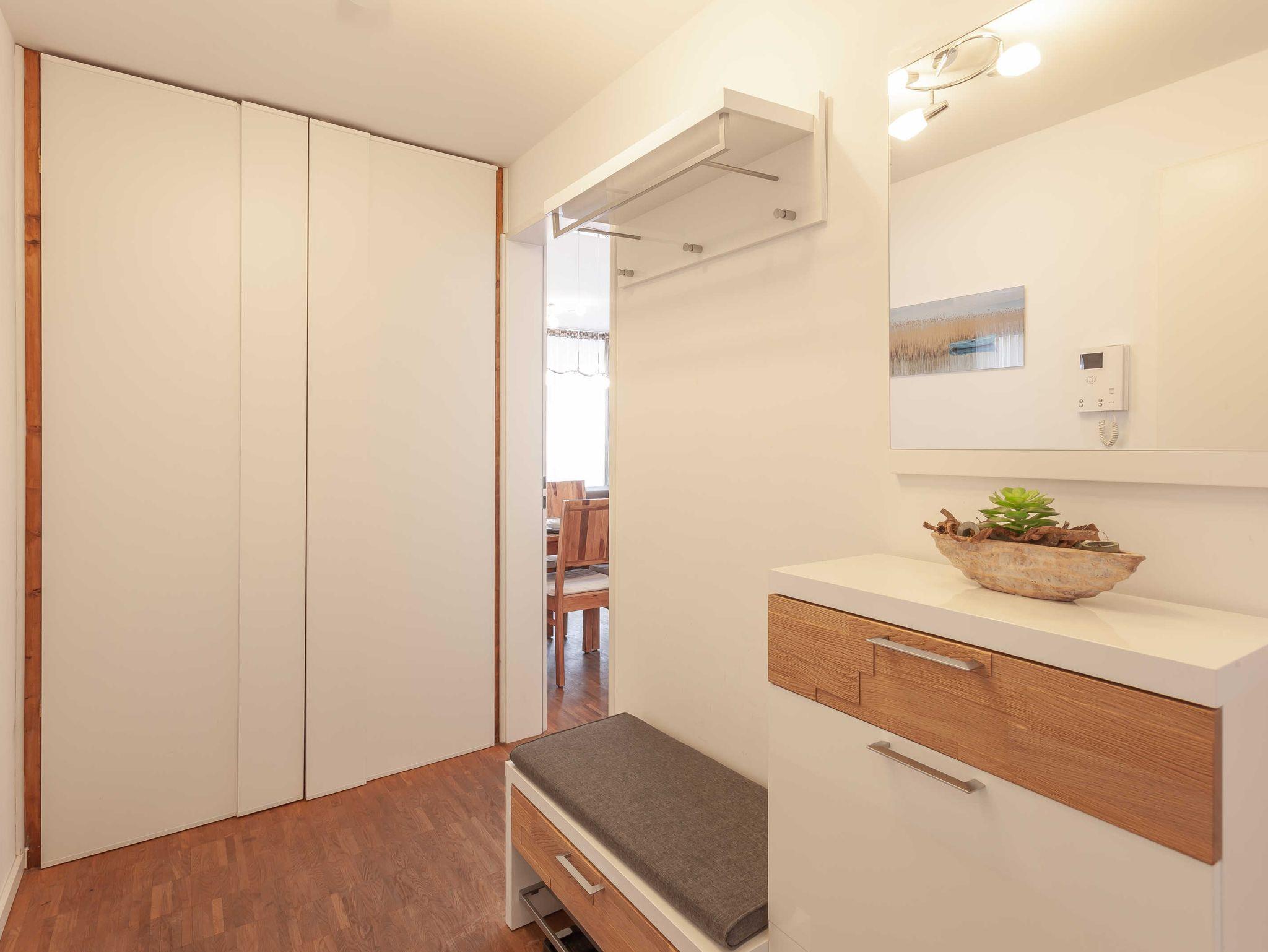 Das hochwertig und modern eingerichtete Appartement Strandläufer in der 2. Etage im DünenResort Binz, das gerade 2022 teilrenoviert wurde, erreichen Sie bequem mit dem Fahrstuhl. Nach dem Betreten des ca. 60 qm großen Appartements, gelangen Sie in einen hellen und freundlichen Flurbereich mit praktischem großen Einbauschrank und Kommode, sowie Sitzbank.