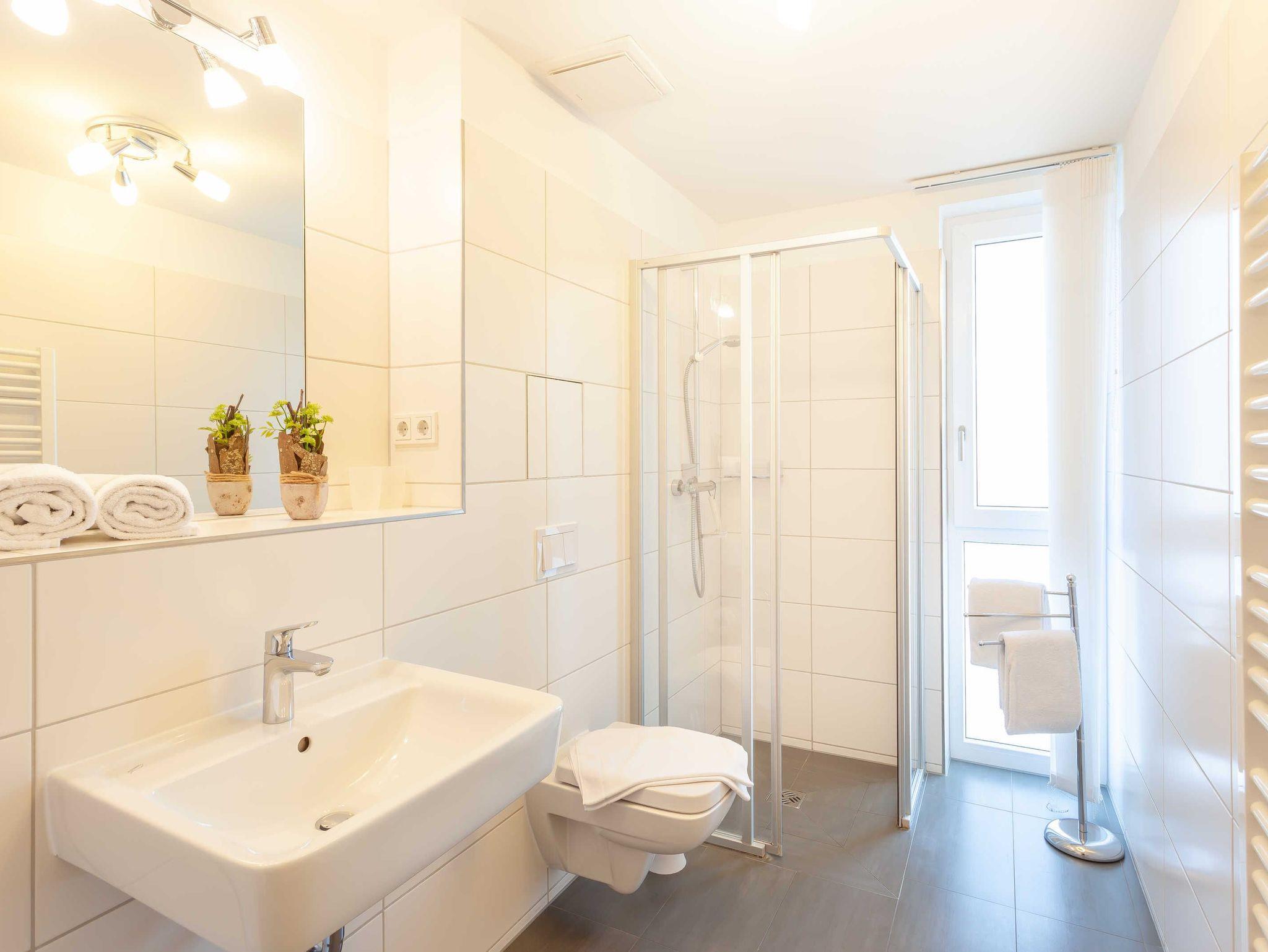 Im hellen, großzügigen Wohlfühl-Badezimmer mit großem Außenfenster finden Sie eine bodentiefe und barrierefreie Dusche sowie eine Waschmaschine. Das Bad ist modern gestaltet und es ist einfach eine Wohltat, sich hier aufzuhalten.