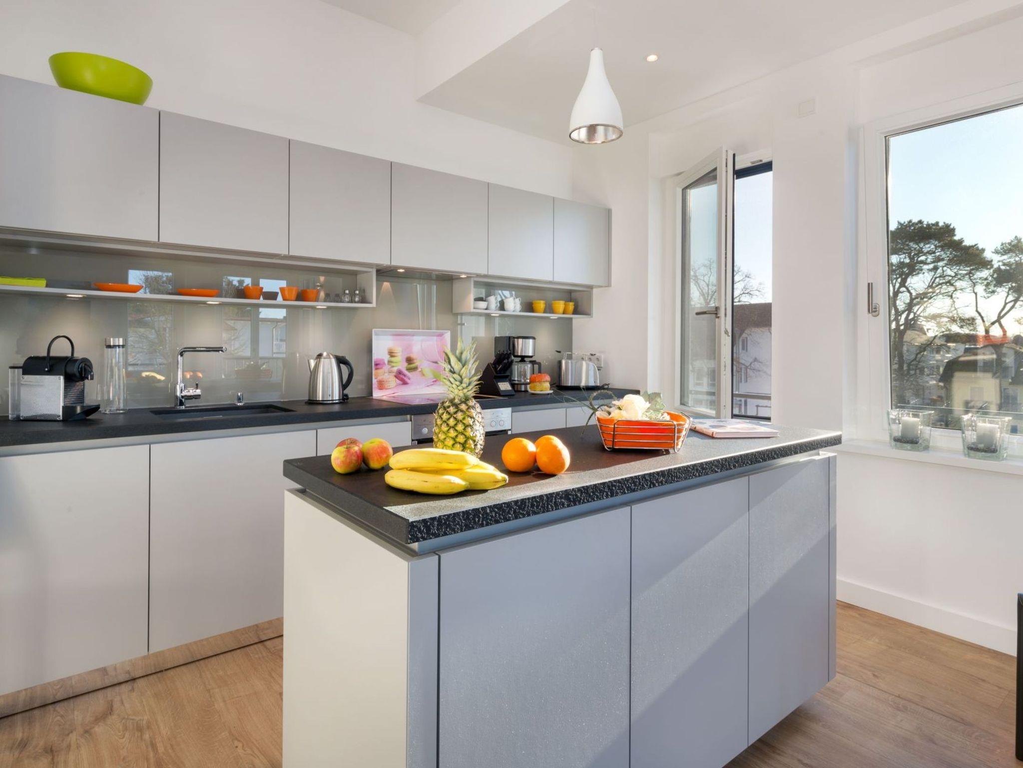 Küche mit Cerankochfeld, Mikrowelle, Geschirrspüler und Espressomachine,
