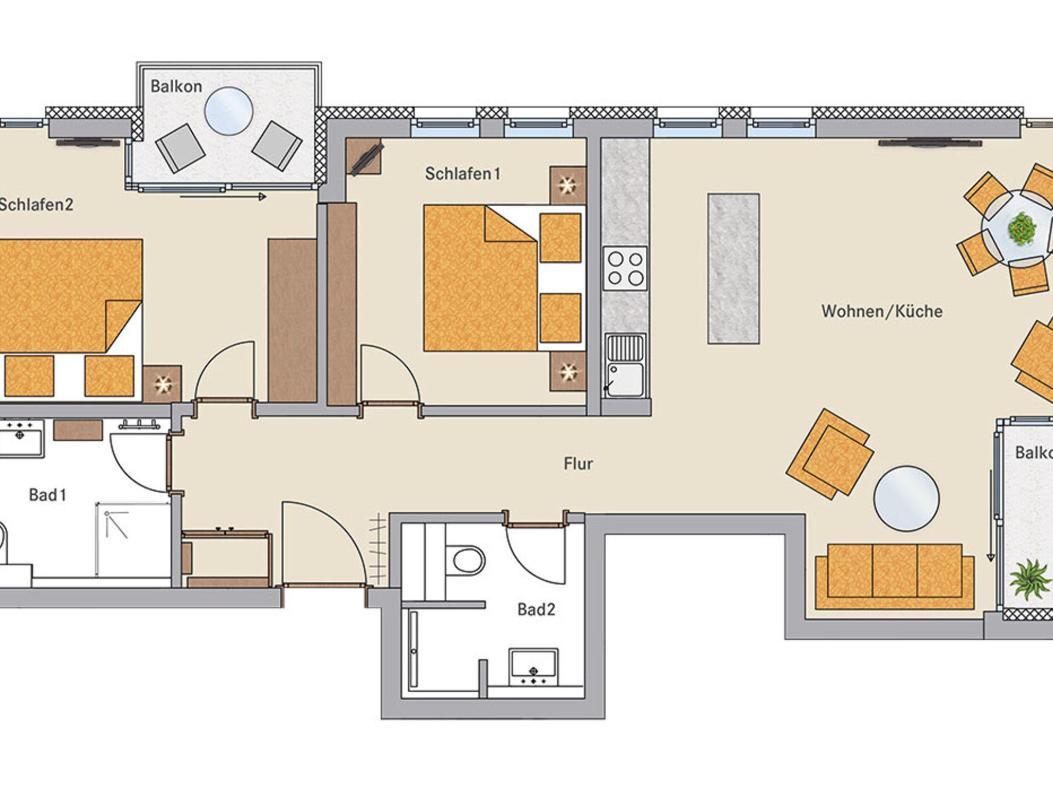 Sie wohnen in lichtdurchfluteten Luxus-Appartements die über große Balkone oder Terrassen verfügen. Die großzügigen Appartements verfügen häufig über 2 Bäder. Weiterhin erwarten Sie vollausgestattete Küchen mit Markengeräten, anspruchsvolles Interieur in den Wohnzimmern mit WLAN, Stereoanlagen und HDTV.