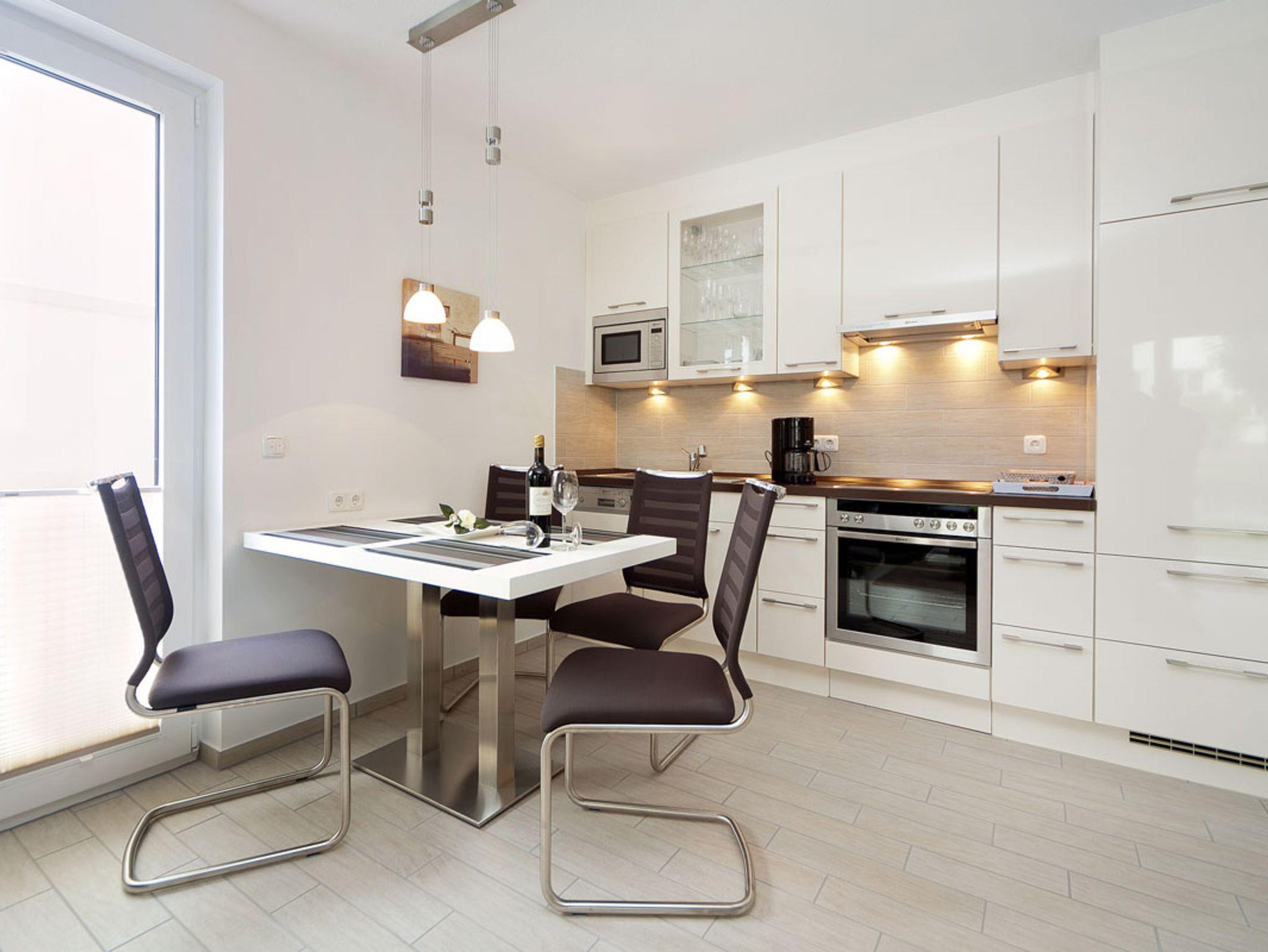 Küche mit Cerankochfeld, Mikrowelle und Geschirrspüler,