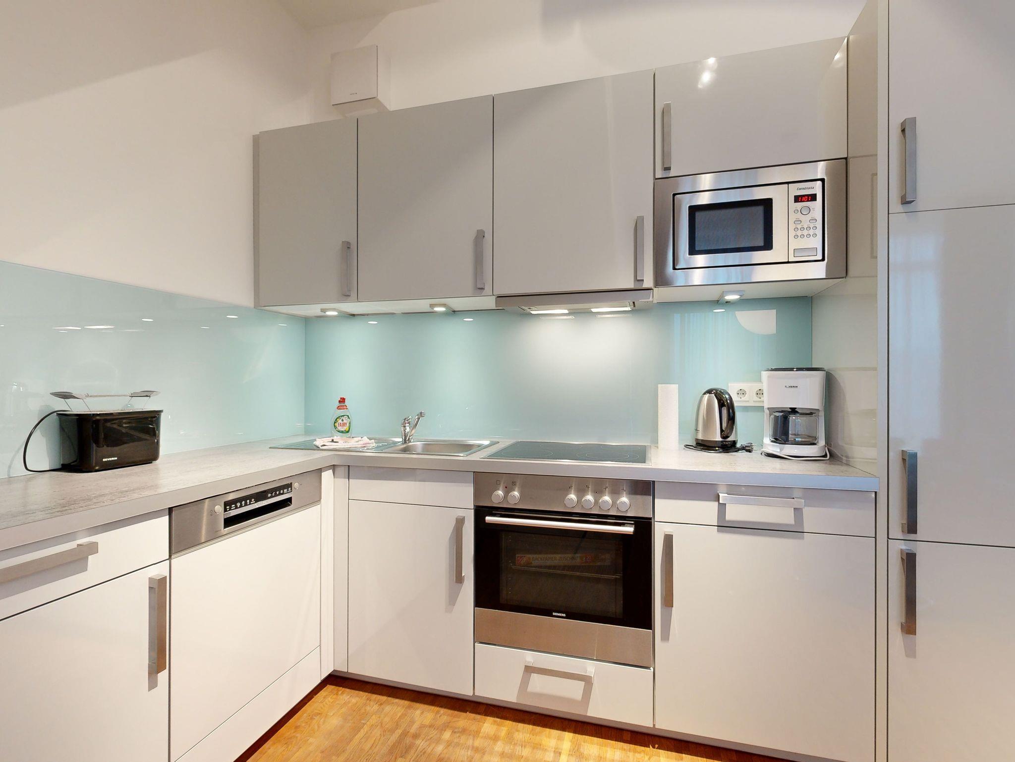 Küche: Moderne Küchenzeile mit Ceran-Herd, Backofen, Spülmaschine, Mikrowelle, Eierkocher, Wasserkocher, Kaffeemaschine, Toaster, Bügeleisen und -brett