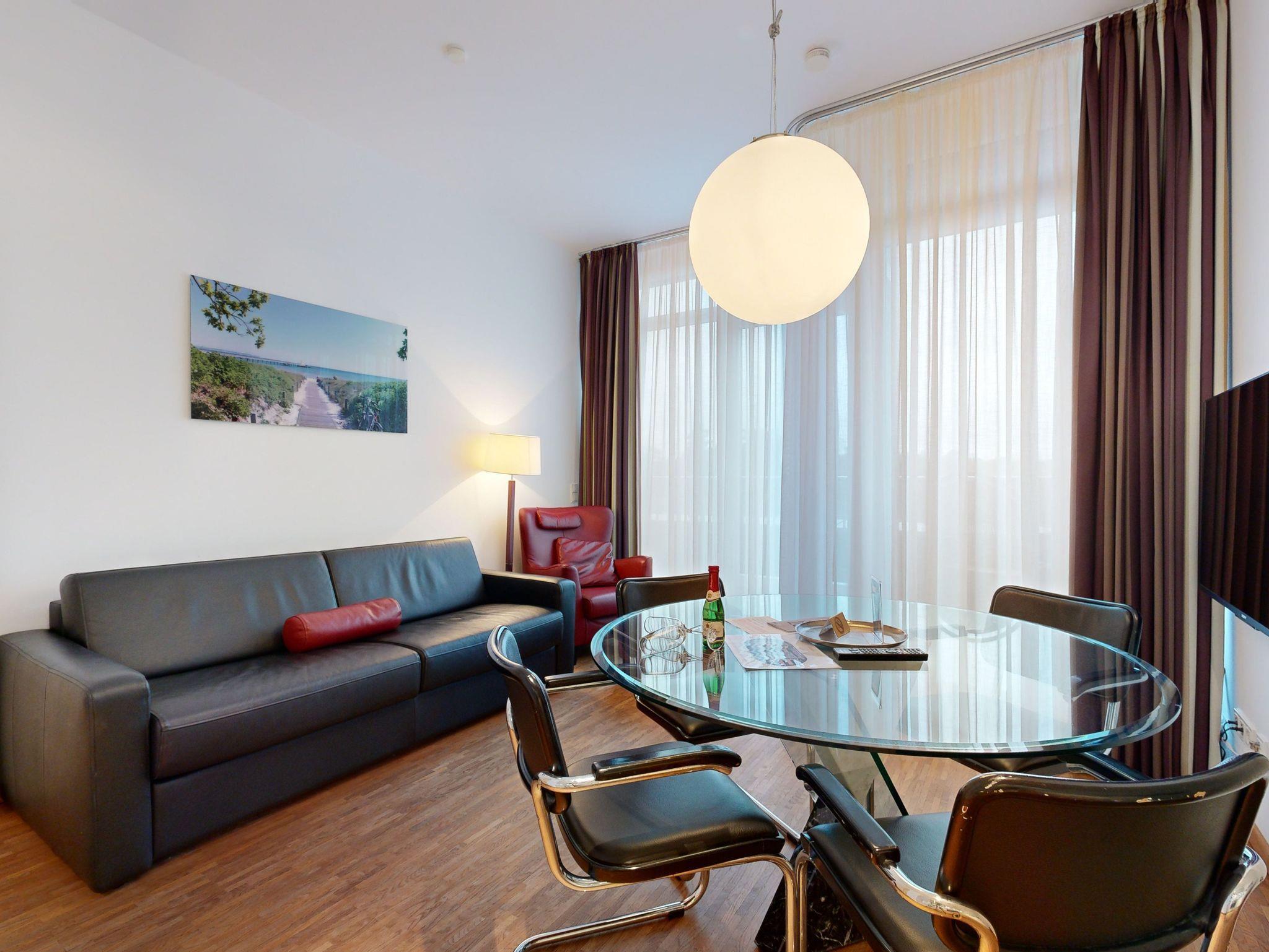 In dem Objekt gibt es großzügige Ferienwohnungen mit 1 und 2 Schlafzimmern, teilweise mit Sauna. Tiefgaragenplätze, Fahrradkeller und Aufzug im Haus.