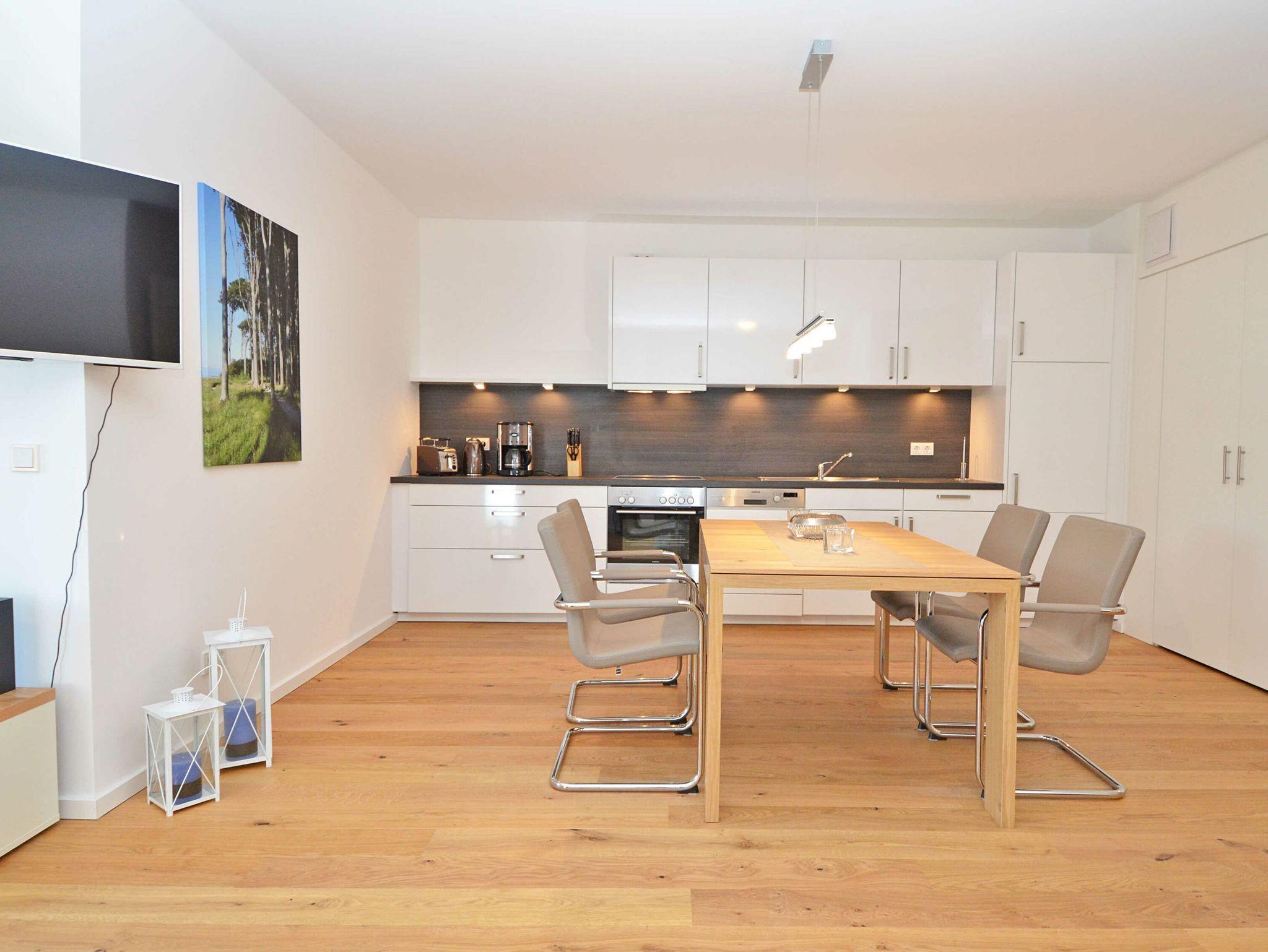 Dieses 68 m² große und sehr geschmackvoll eingerichtete 2-Raum-Appartement im 3. Obergeschoss bezaubert u.a. mit einem Kamin und seitlichem Meerblick vom möblierten Balkon.