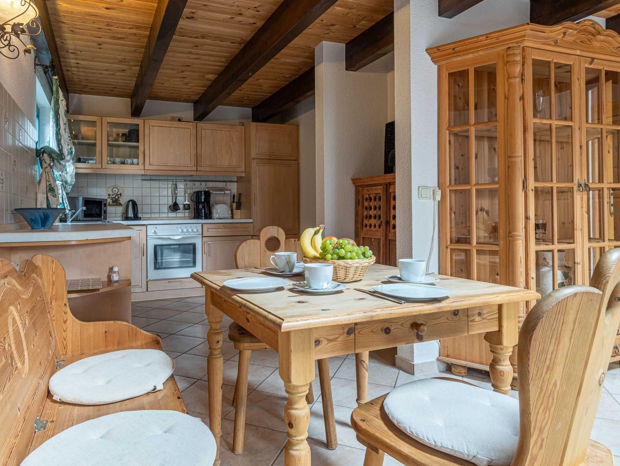 Die Ferienwohnung Katja bietet auf 55 qm Platz für bis zu 3 Personen. Der Wohnbereich im Erdgeschoß verfügt über eine Schlafcouch für 2 Personen, TV und einen Essplatz. Die angrenzende Küche ist ausgestattet mit Herd, Backofen, Kühlschrank, mit Tiefkühlfach, Geschirrspüler, Kaffeemaschine, Toaster, Wasserkocher.