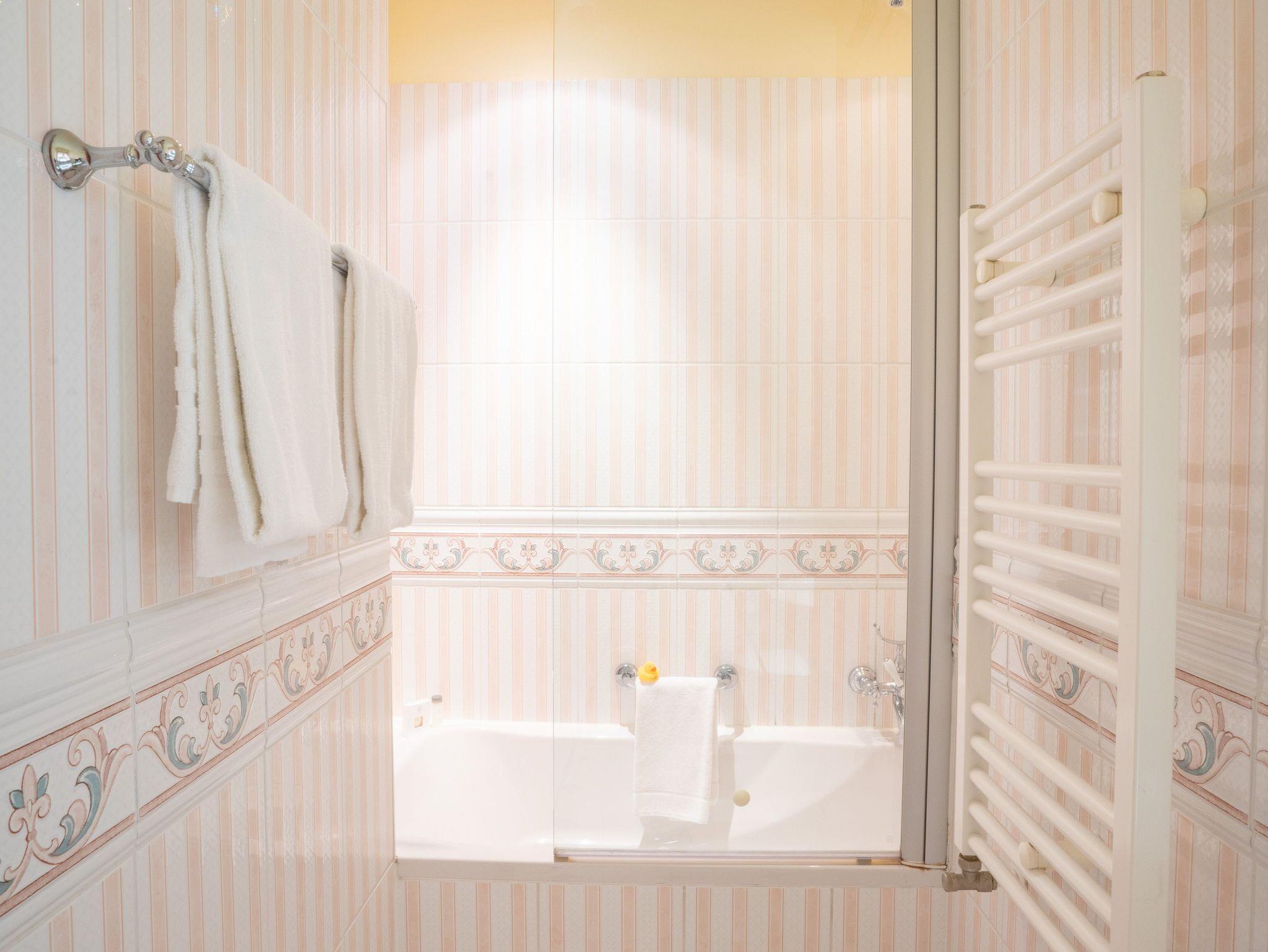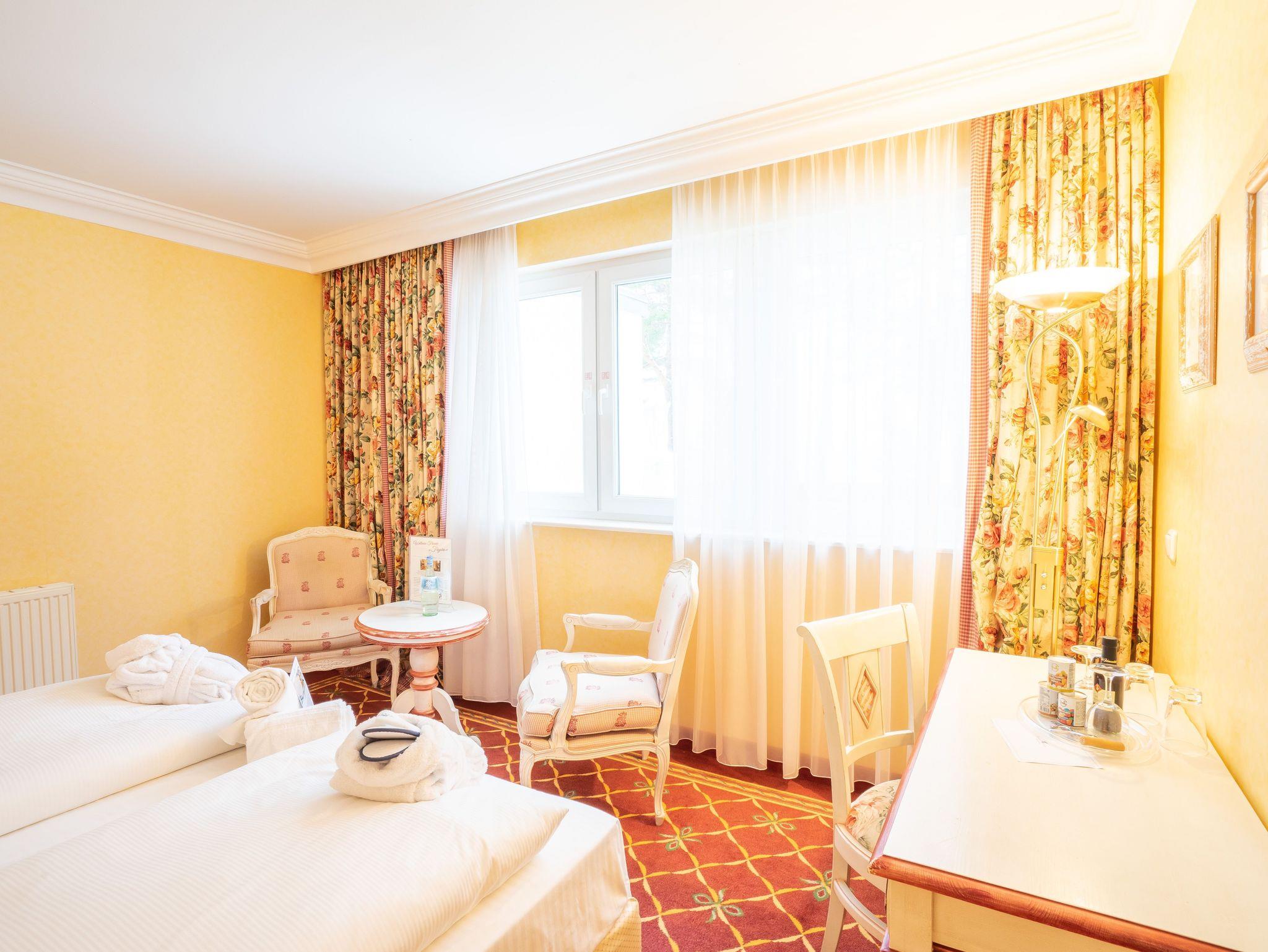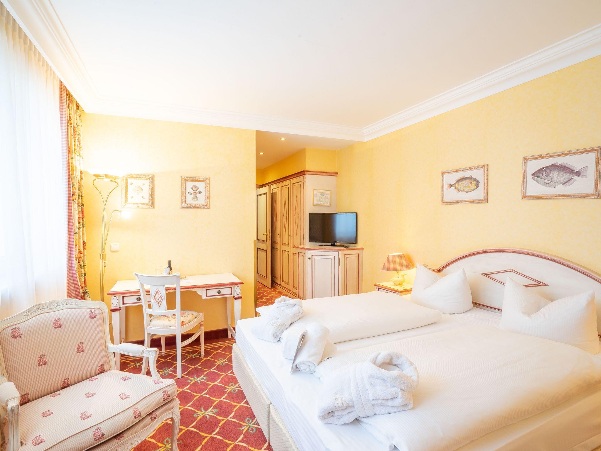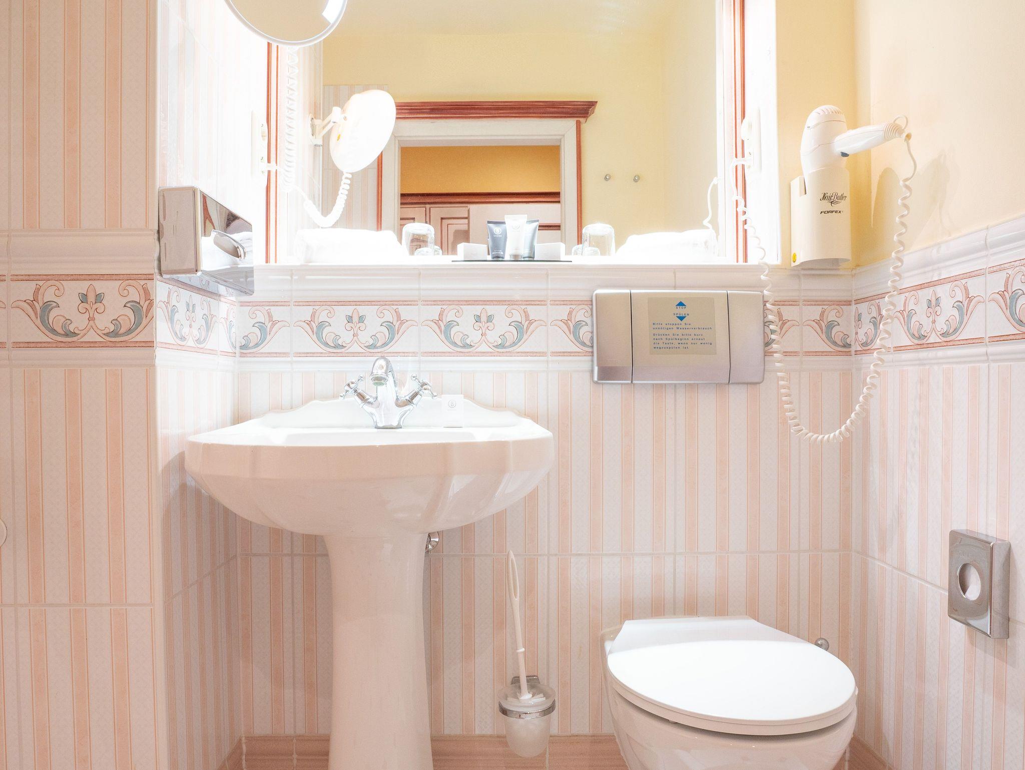 Alle Zimmer und Suiten mit Dusche bzw. Badewanne/WC, Fön, Bademäntel, Farb-TV, Durchwahltelefon, Minibar und Safe.
