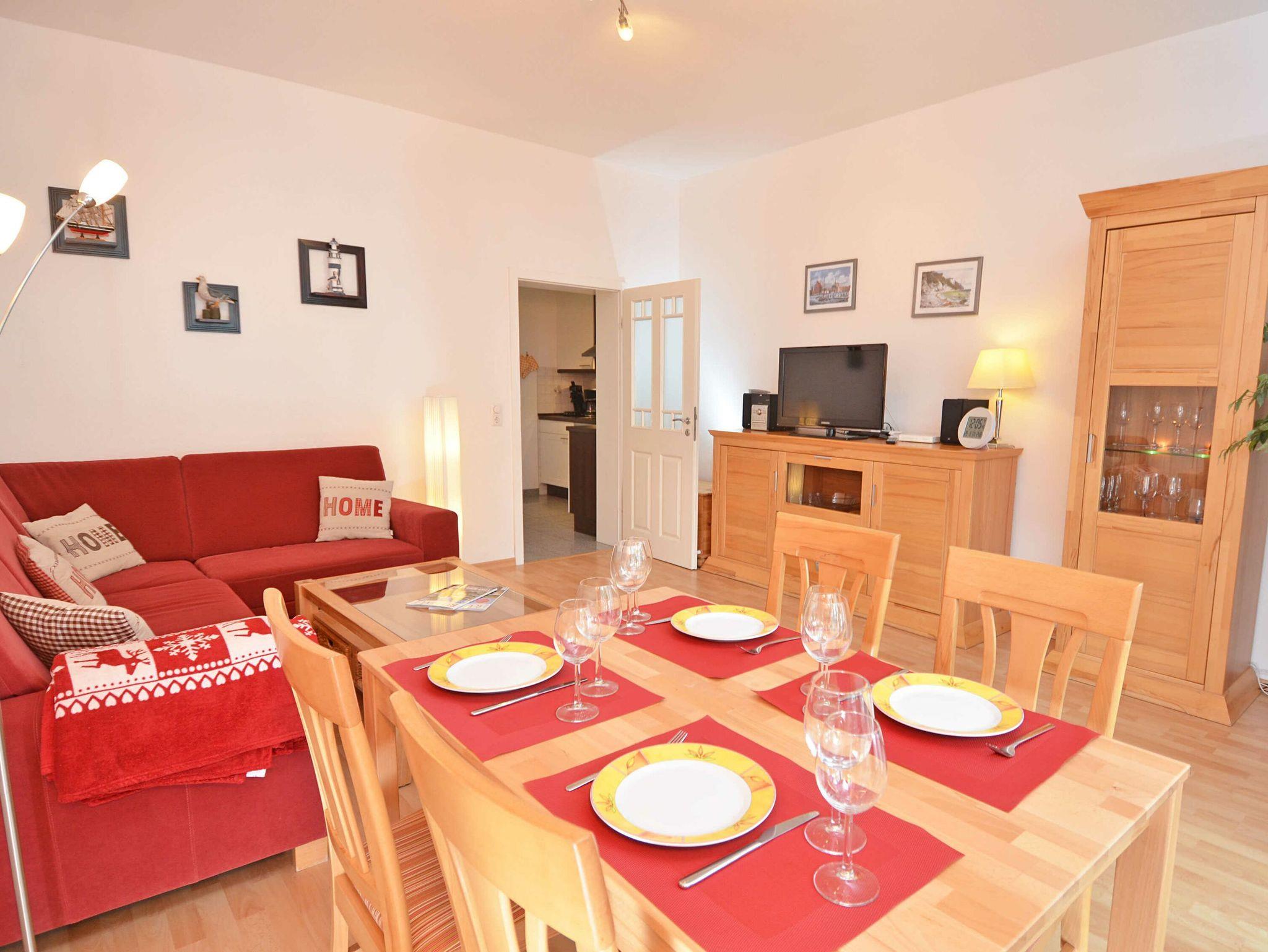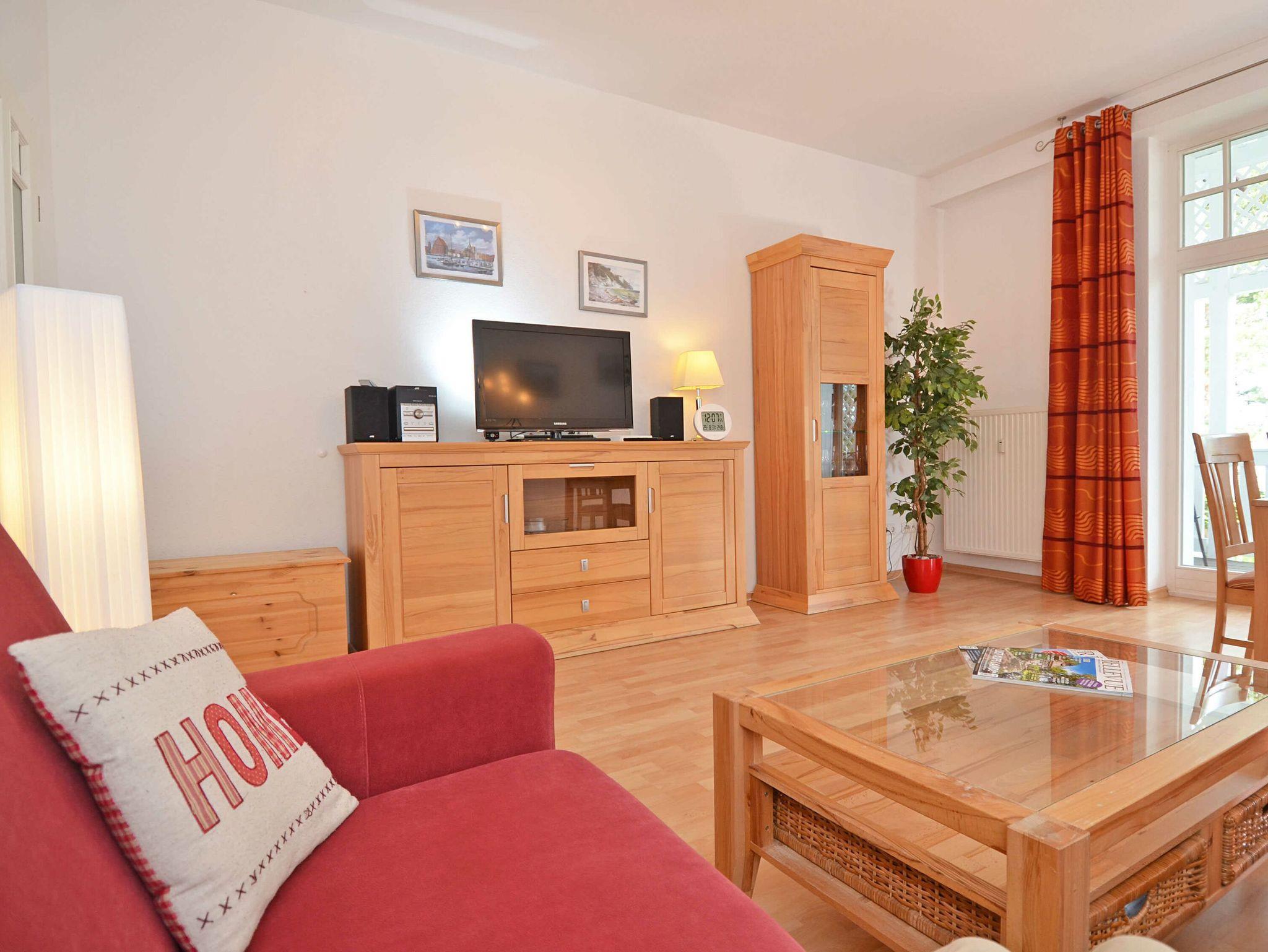 Der helle, freundlich eingerichtete Wohnraum verfügt über einen großen Esstisch für 4 Personen, eine bequeme Schlafcouch, eine Schrankwand mit beleuchteter Vitrine sowie LCD-TV und Radio/CD/DVD-Player. Bücher sowie diverse Spiele für Jung und Alt lassen keine Langeweile aufkommen. Vom Wohnraum aus gelangen Sie auf die große Loggia, die einen spektakulären Blick auf die Ostsee sowie die Strandpromenade bietet.