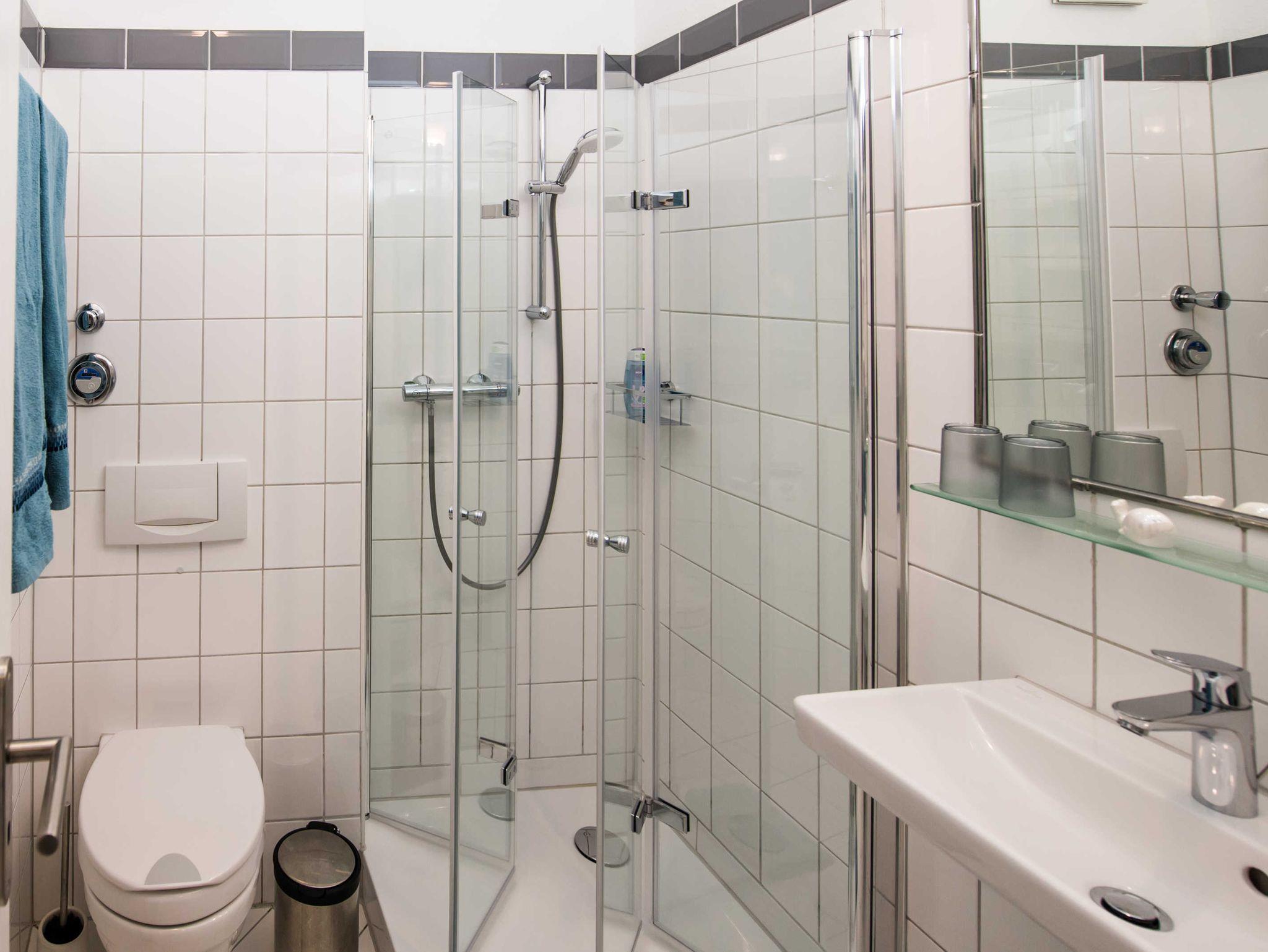 Das Bad ist mit Dusche und WC ausgestattet. Kinderbett und Kinderhochstuhl bitten wir separat mitzubuchen. Ein kostenloser Parkplatz steht direkt am Haus zur Verfügung. Mitgebrachte oder vor Ort ausgeliehene Fahrräder können sicher in einem Abstellraum untergebracht werden.