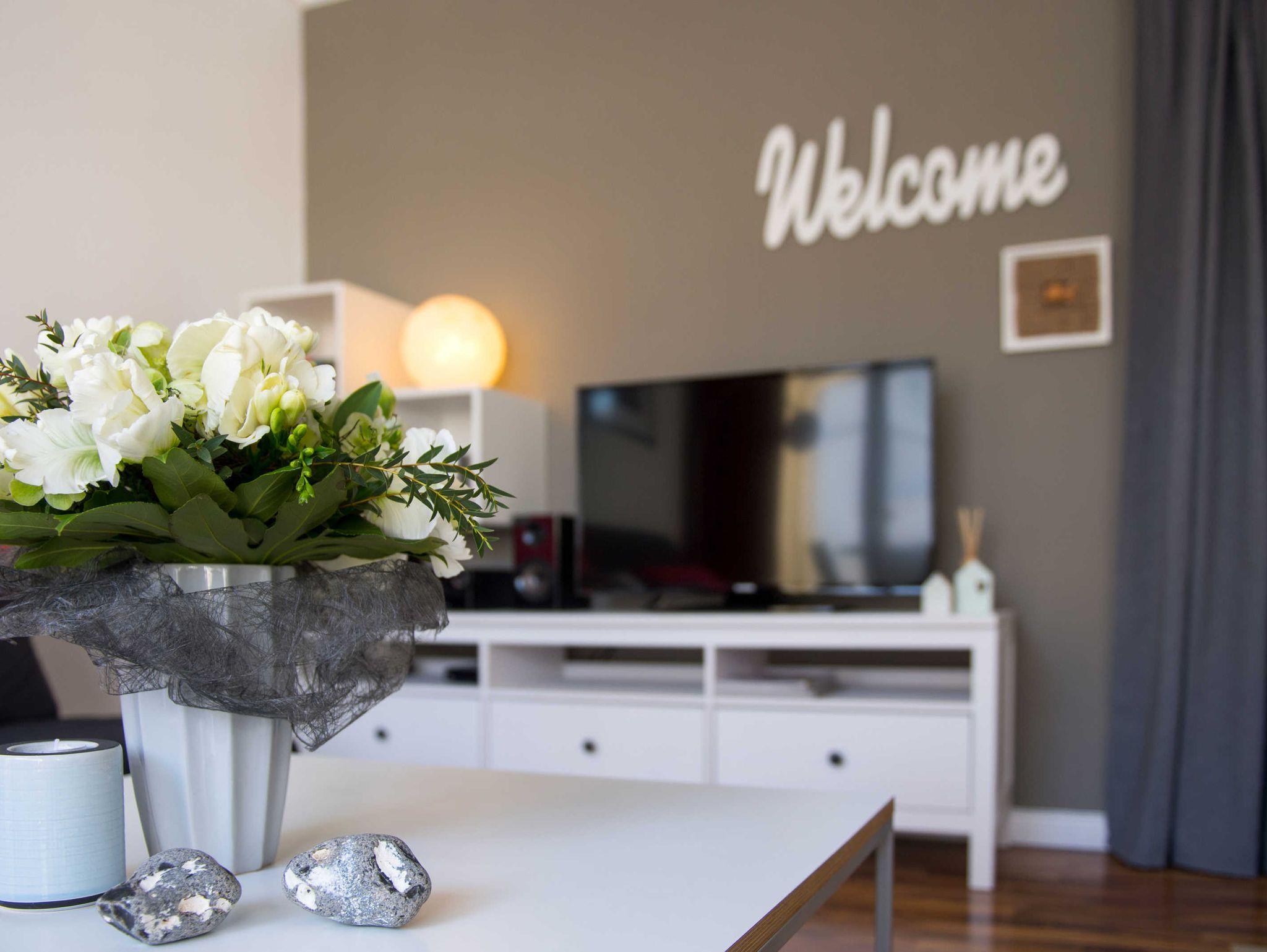 Unsere modern und komfortabel eingerichtete Ferienwohnung im Ostseebad Binz (separater Eingang, 65 qm, 1 Wohnzimmer, 1 Schlafzimmer, 2 Balkone mit Terrassenmöbeln, moderner Schlafcouch, zwei Flachbild-TV, separater Küche, Bad mit Dusche/WC, WLAN, max. 4 Erwachsene) befindet sich im 1. Obergeschoss eines Appartementhauses. Gegen Aufpreis je Gast liegen bei Ihrer Anreise frische Handtücher und Bettwäsche bereit.