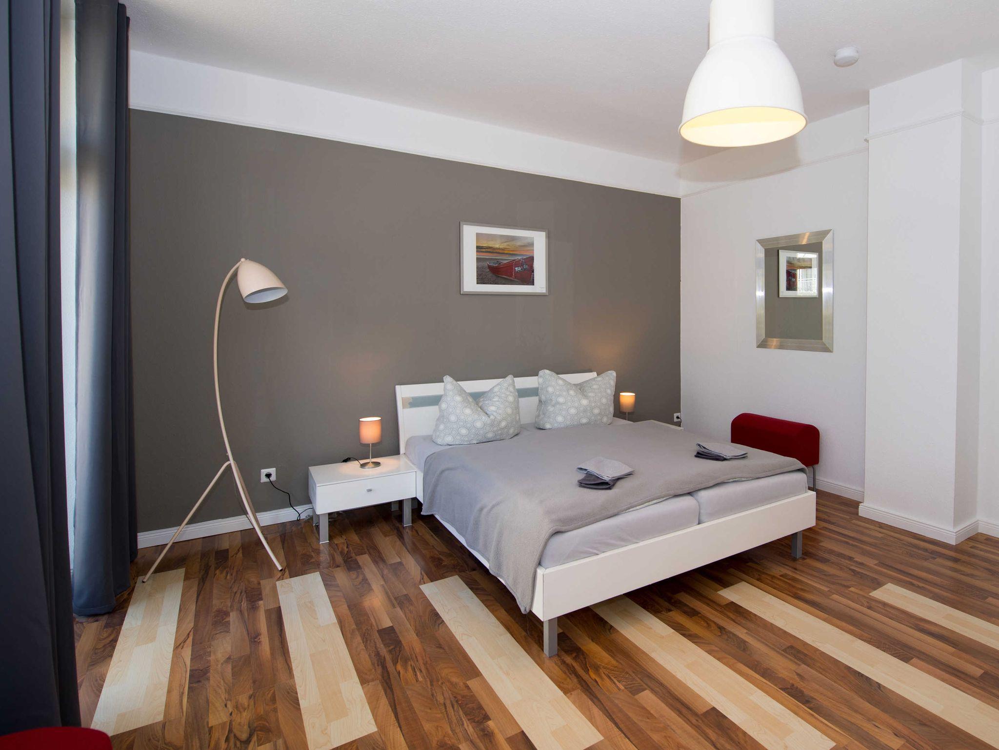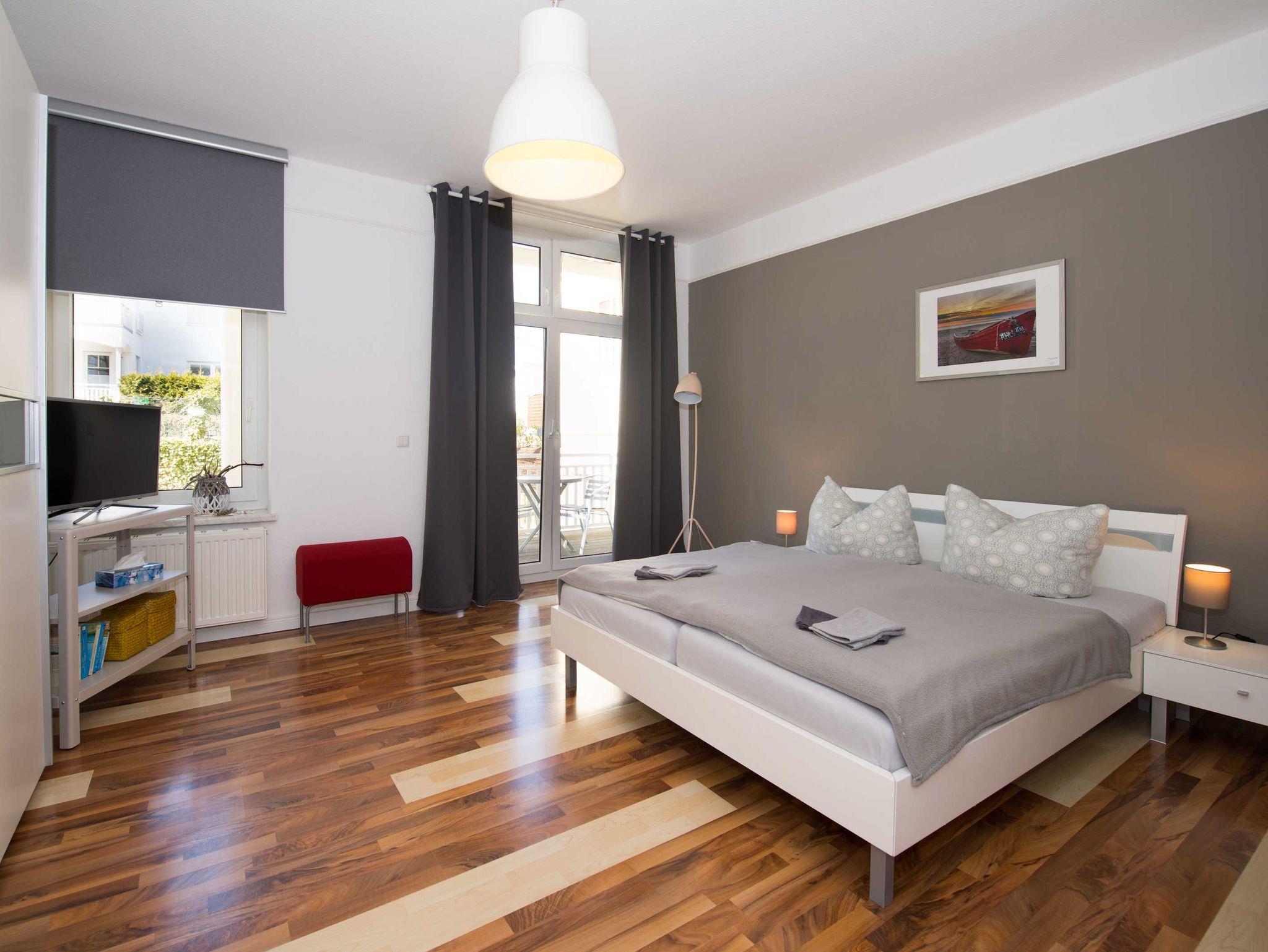 Im großen ruhig gelegenen Schlafzimmer erwarten Sie ein bequemes Doppelbett mit Nachttischen und Leselampen sowie ein Kleiderschrank und ein Flachbild-TV. Vom Schlaf- und vom Wohnraum aus gelangt man auf den schönen Balkon mit Sitzgelegenheiten.