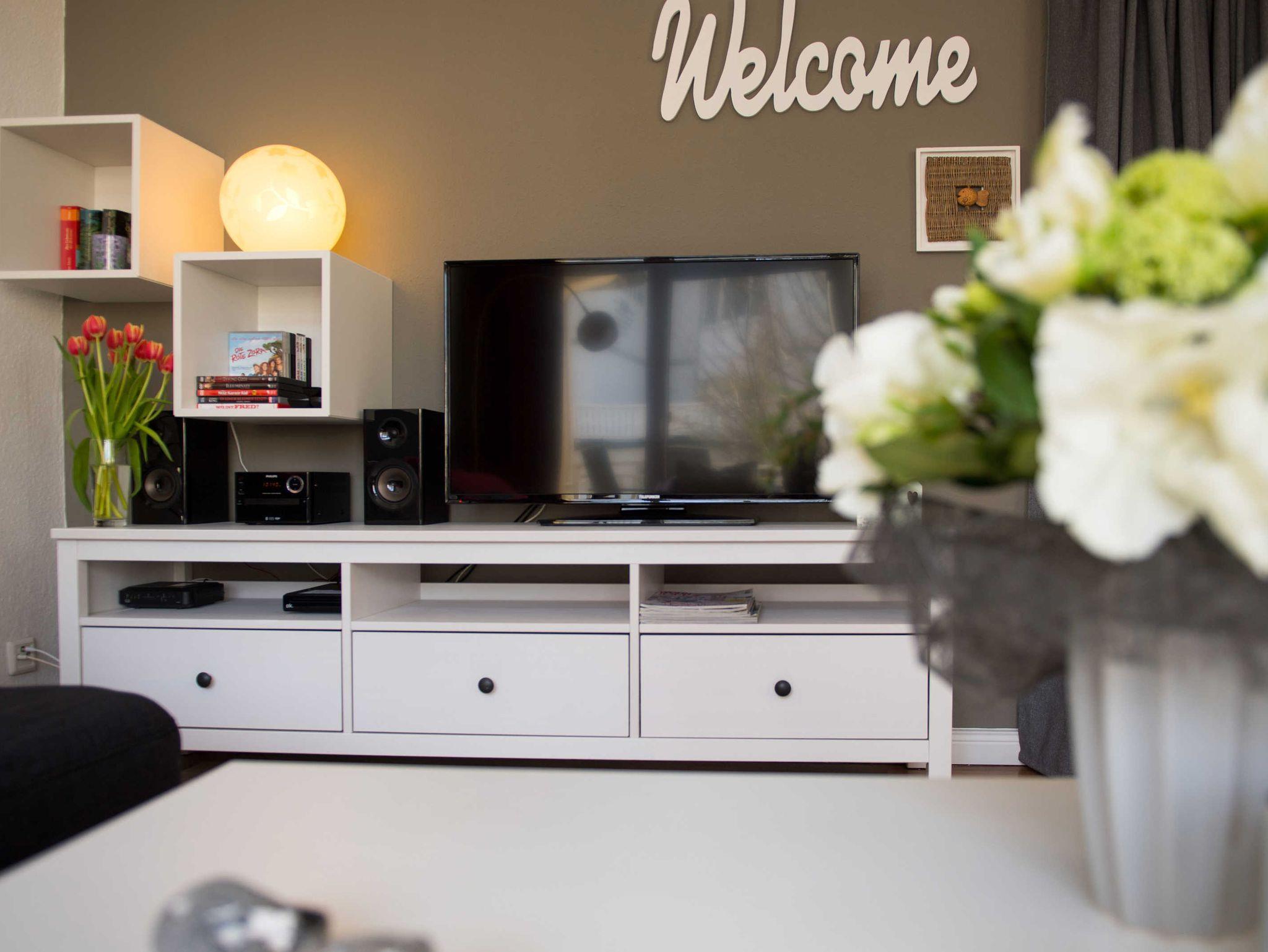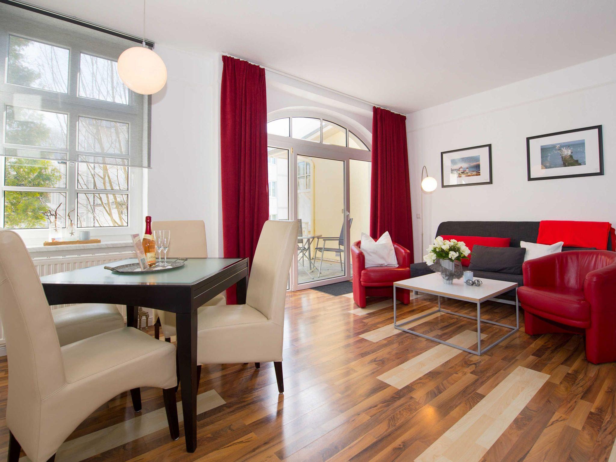 Die Ferienwohnung befindet sich im 1. Obergeschoss eines Appartementhauses und ist 65 qm groß. Sie wurde modern und komfortabel eingerichtet und bietet maximal 4 Erwachsenen Raum für einen erholsamen Urlaub. Über den Flur mit Garderobe gelangen Sie direkt in den Wohnbereich. Im hell und stilvoll eingerichteten Wohnraum stehen eine Schlafcouch, Sessel und Tisch sowie Schränke, Radio und ein moderner Flachbild-TV. In der separaten kleinen Küche stehen Ihnen ein Herd mit Cerankochfeld, Spülmaschine, Mikrowelle, Kühlschrank, Toaster, Kaffeemaschine, ein externer Backofen sowie ein Wasserkocher zur Verfügung.