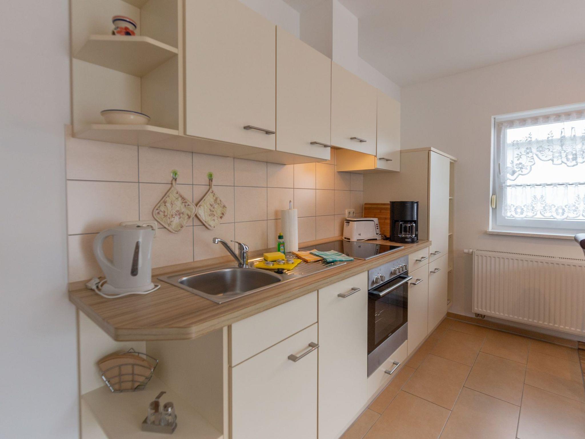 Die Küche ist ausgestattet mit Backofen, Ceranfeld, Geschirrspüler, Kühlschrank, Kaffeemaschine, Toaster, Wasserkocher, ausreichend Geschirr, Töpfe und Pfannen.