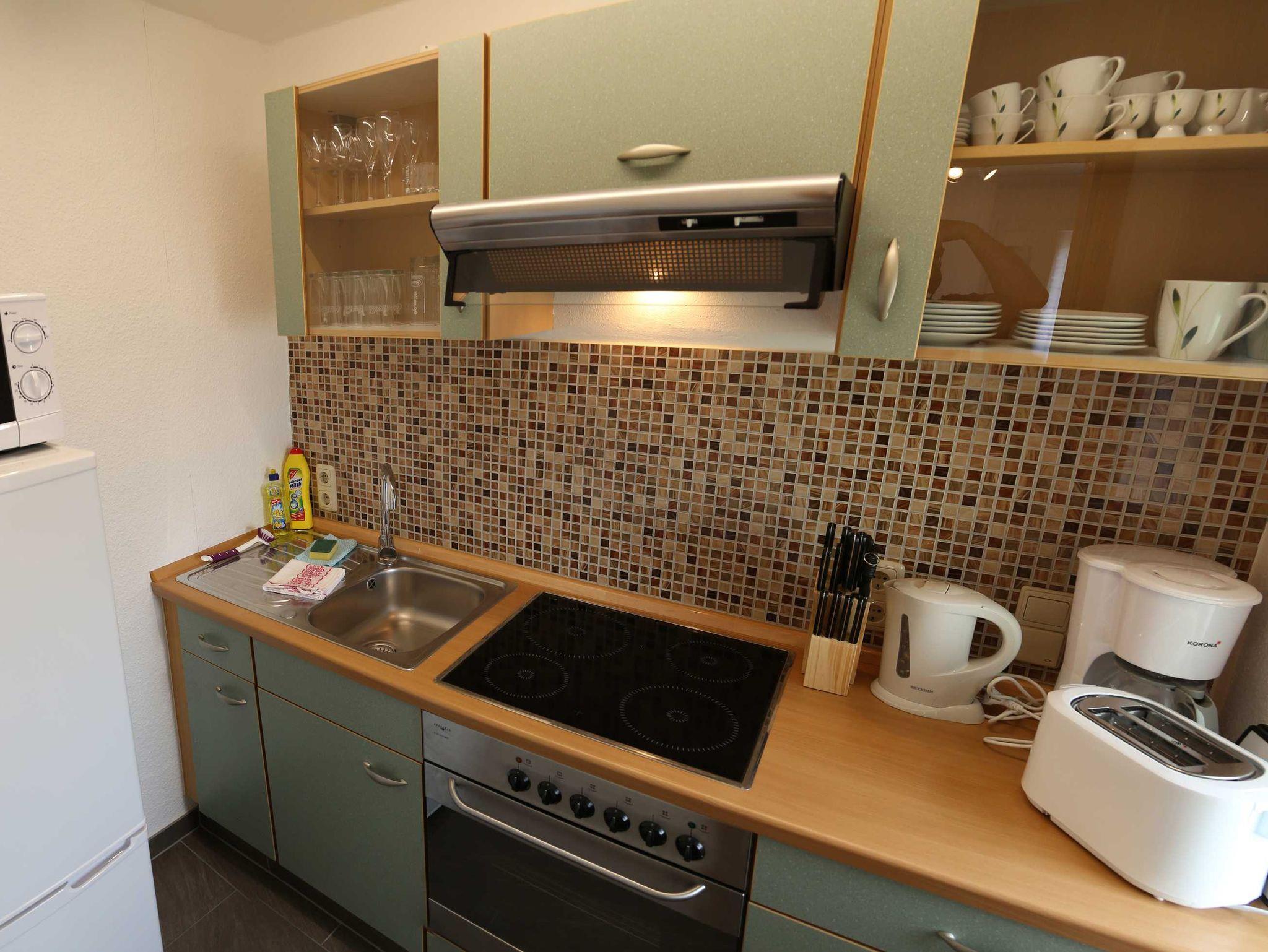 Tisch mit 2 Stühlen, SAT-TV, DU/ WC. Für das Ferienzimmer steht eine Küchenzeile im Flur zur Frühstückszubereitung zur Verfügung.