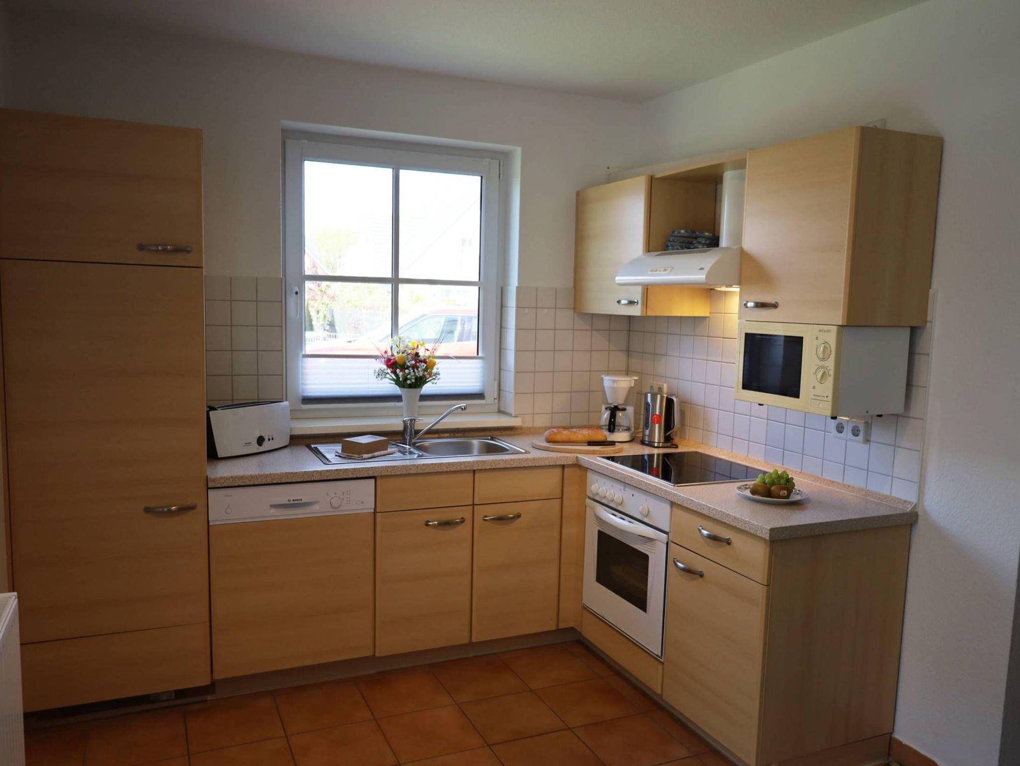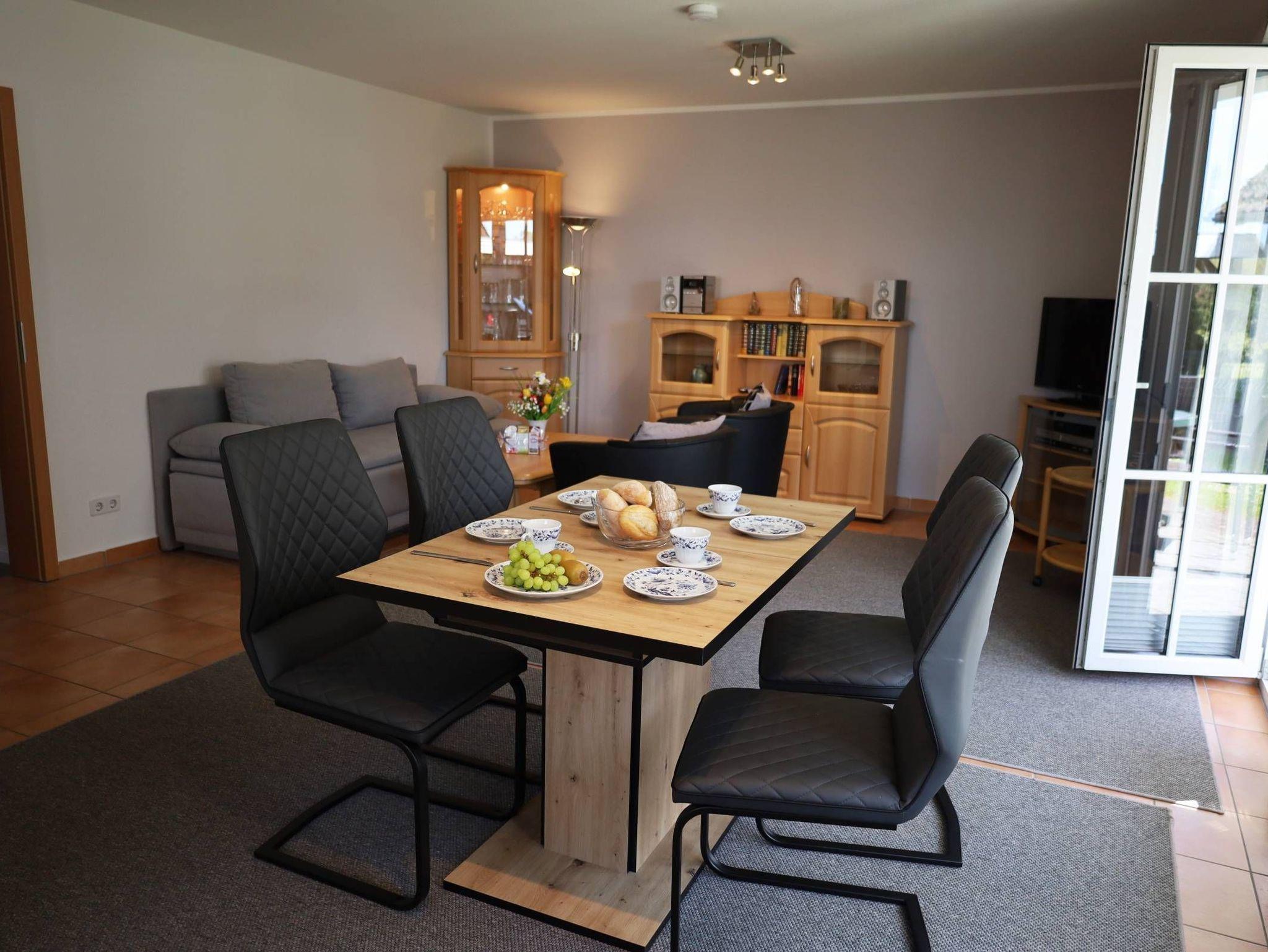 Die ca. 52 m² 2-Raum-Wohnung befindet sich im Erdgeschoß und ist eine Nichtraucherwohnung. Ein großräumiges Wohnzimmer mit gemütlichem Schlafsofa (Aufbettung für die 3. und 4. Person) und Sesseln bietet ausreichend Platz, Flachbildfernseher sowie Hifi-Anlage sind ebenfalls vorhanden.