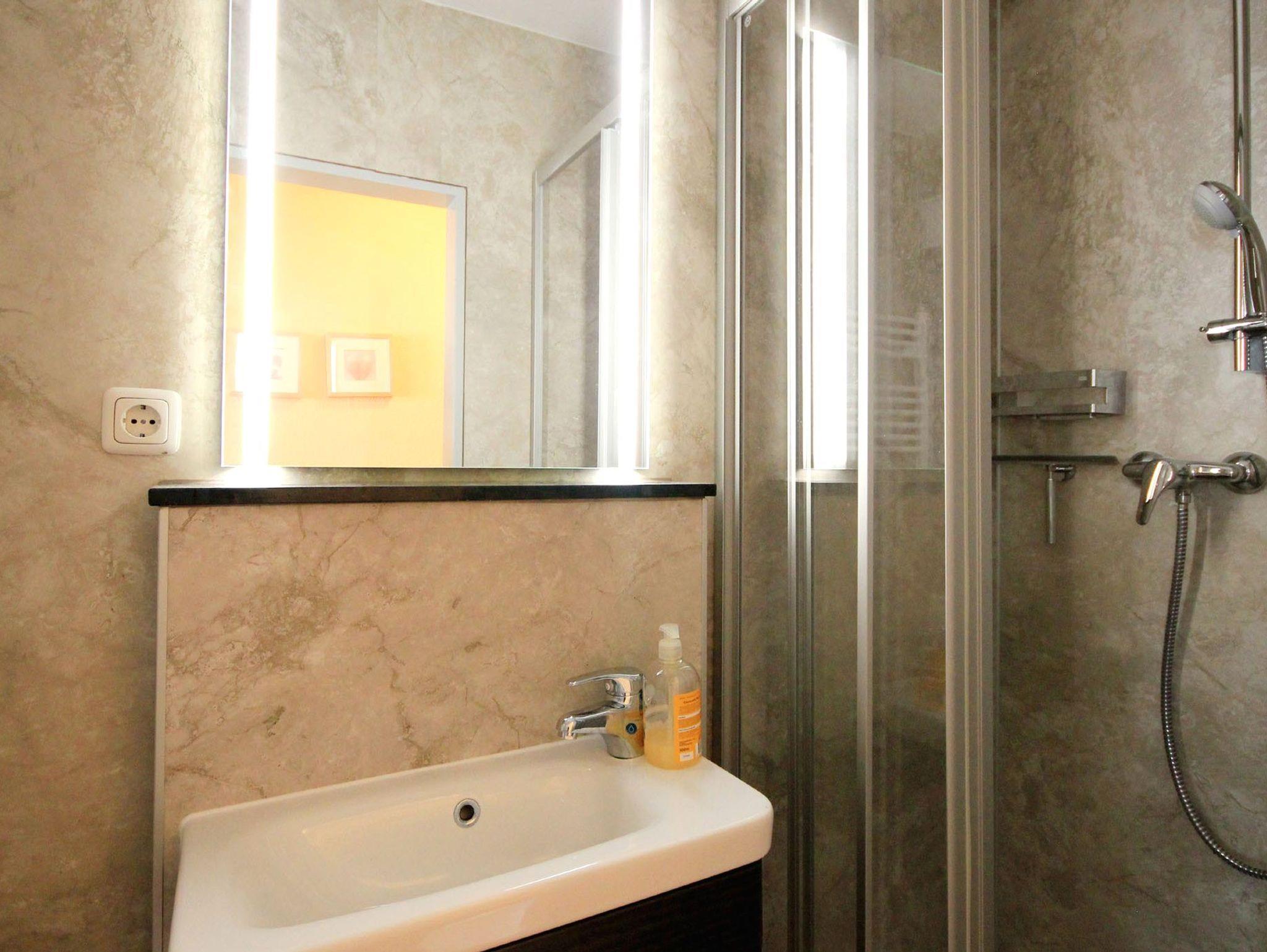 Die beiden Schlafräume sind jeweils mit einem Doppelbett und Kleiderschrank ausgestattet. Im Hauptschlafzimmer finden Sie einen zusätzlichem TV. Das kleinere Schlafzimmer verfügt über einen Schreibtisch und ein fusshohes großes Fenster (franz. Balkon). Beide Schlafzimmer sind durch die elektrischen Außenjalousien verdunkelbar. Die Badezimmer verfügen jeweils über Waschtisch, Dusche und WC. Die Küchenzeile beinhaltet u.a. einen Geschirrspüler, Kochfeld, Kaffeemaschine, Wasserkocher und Toaster.
