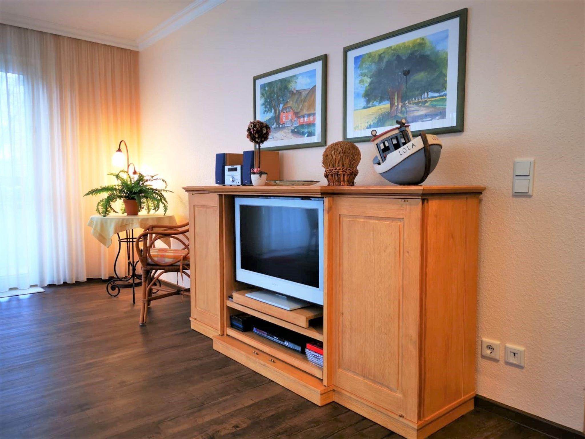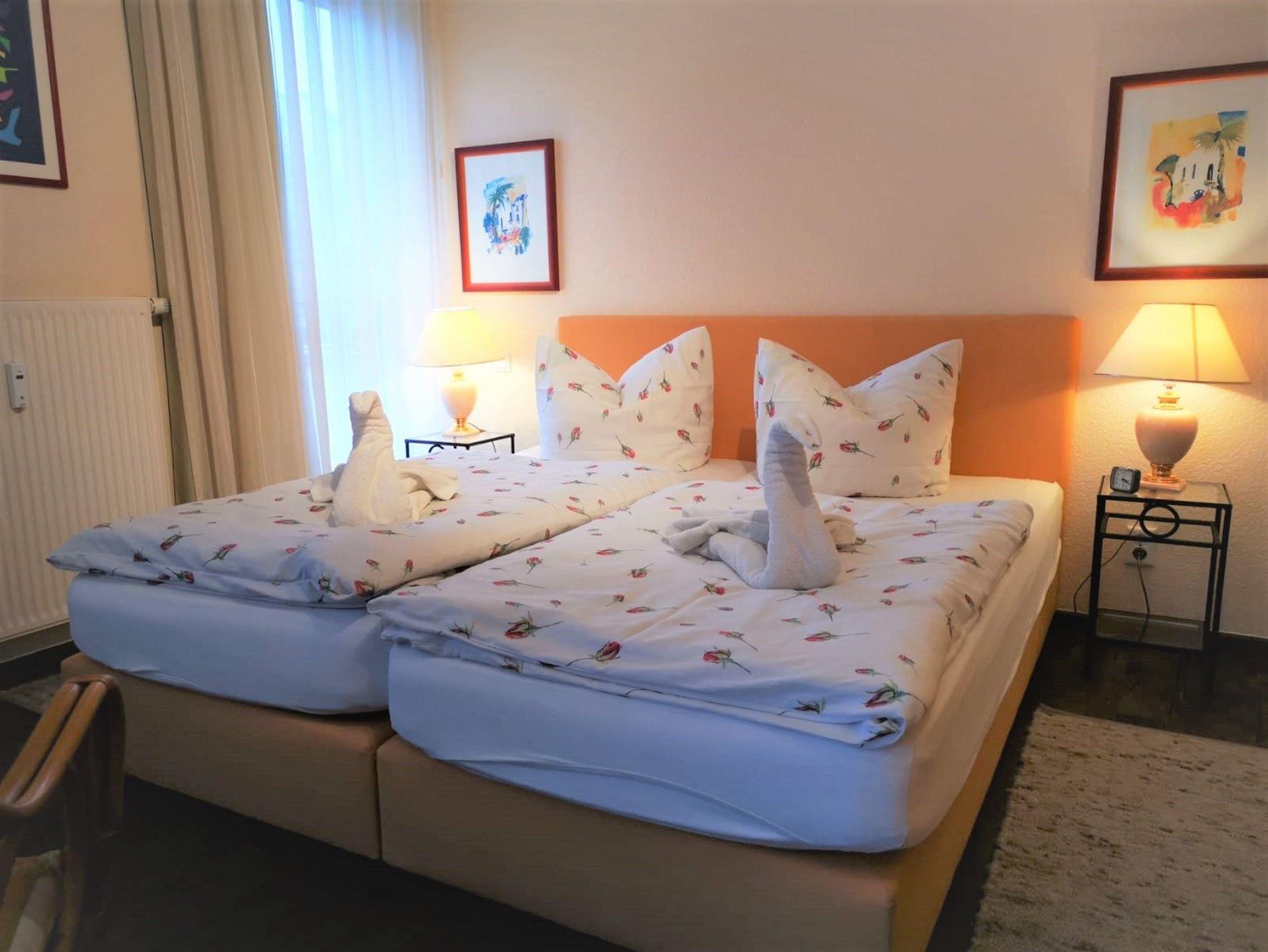Die stilvoll eingerichtete 2-Raum-Wohnung im 1. Obergeschoss der Villa Maria bietet auf ca. 65m² großzügigen Komfort für zwei bis drei Personen. Das separate Schlafzimmer ist mit einem gemütlichen Doppelbett ausgestattet, während im Wohnzimmer ein bequemes Schlafsofa als zusätzliche Aufbettung zur Verfügung steht ideal für eine dritte Person oder entspannte Stunden beim Lesen oder Fernsehen.