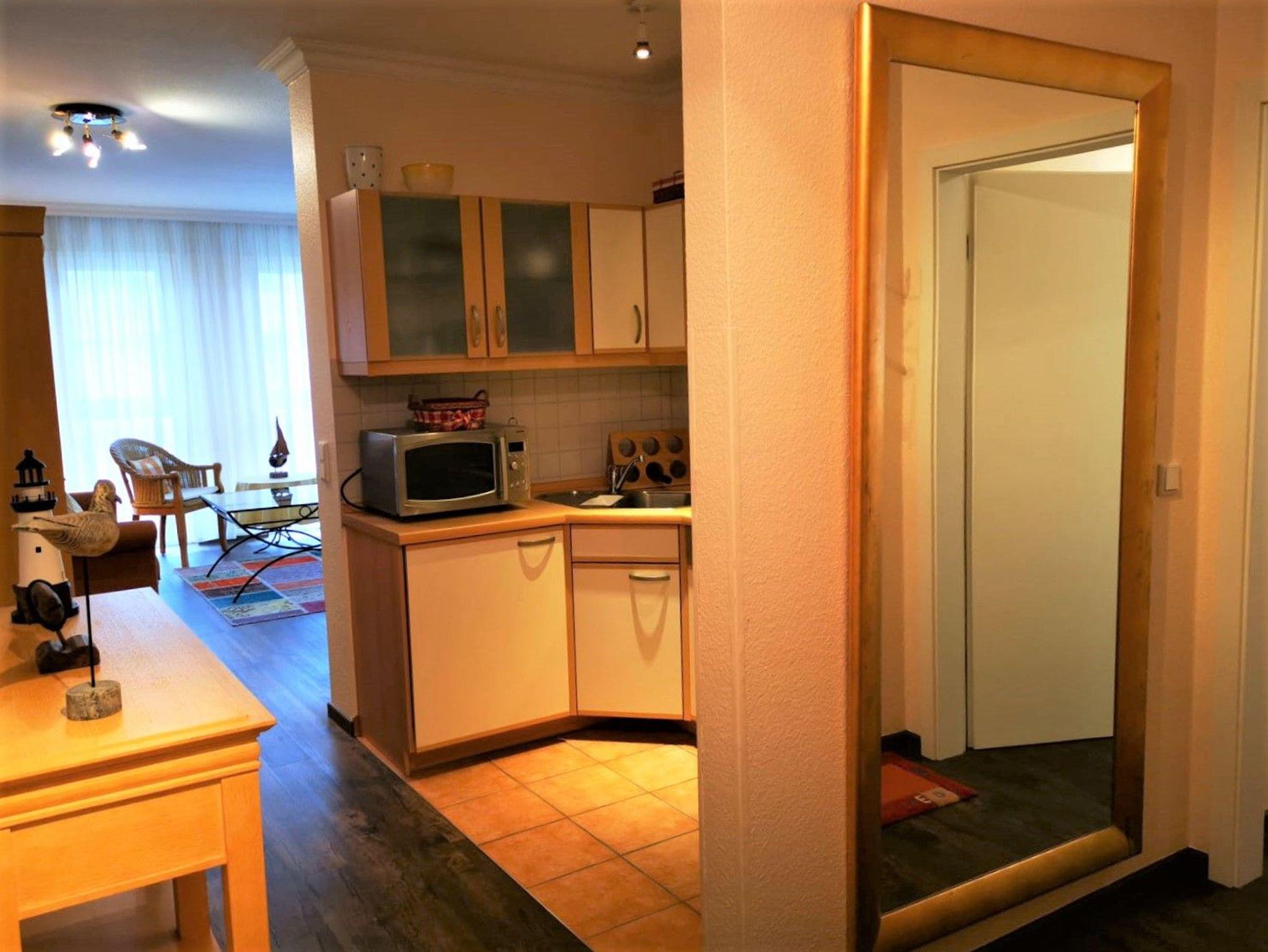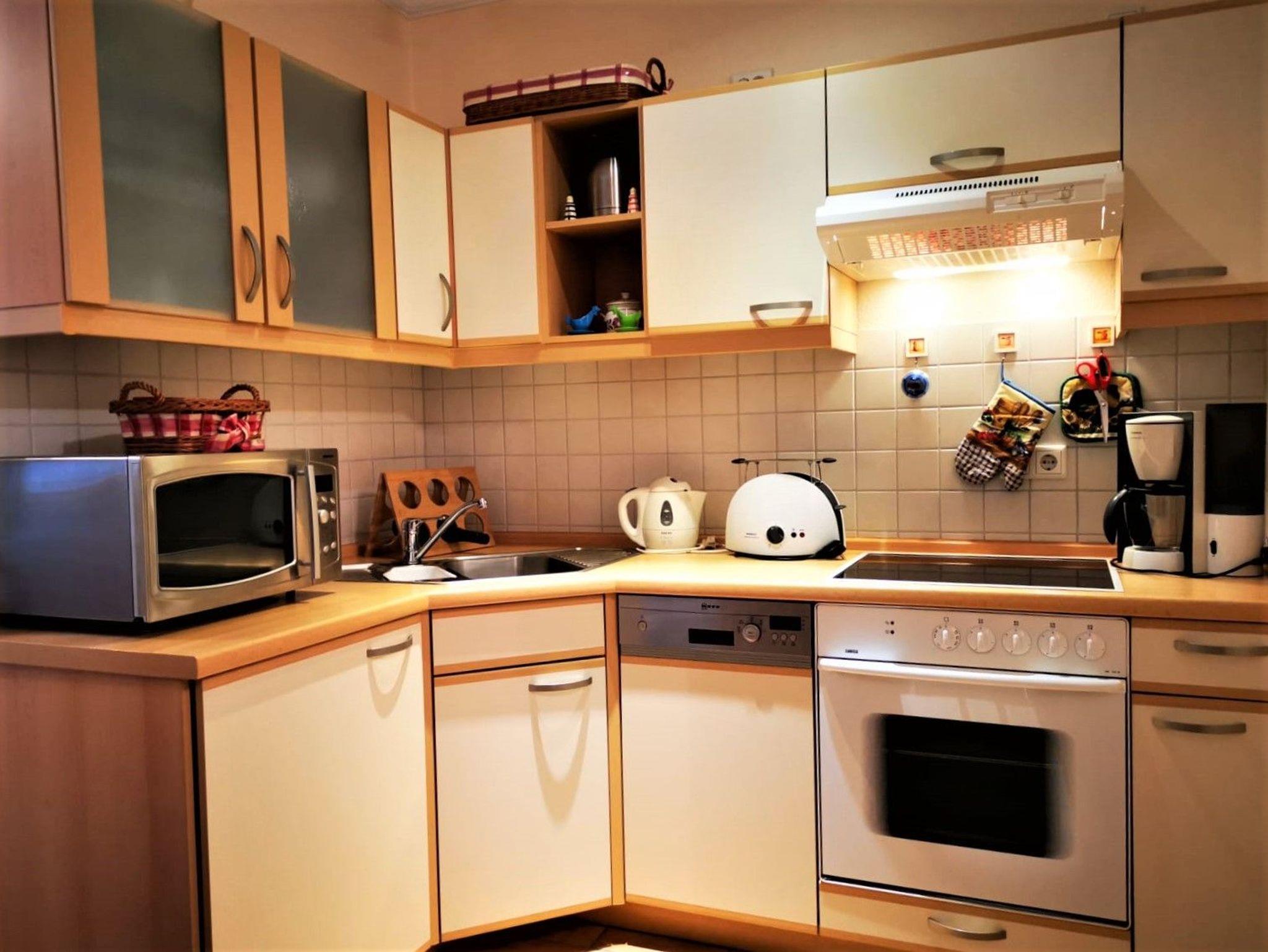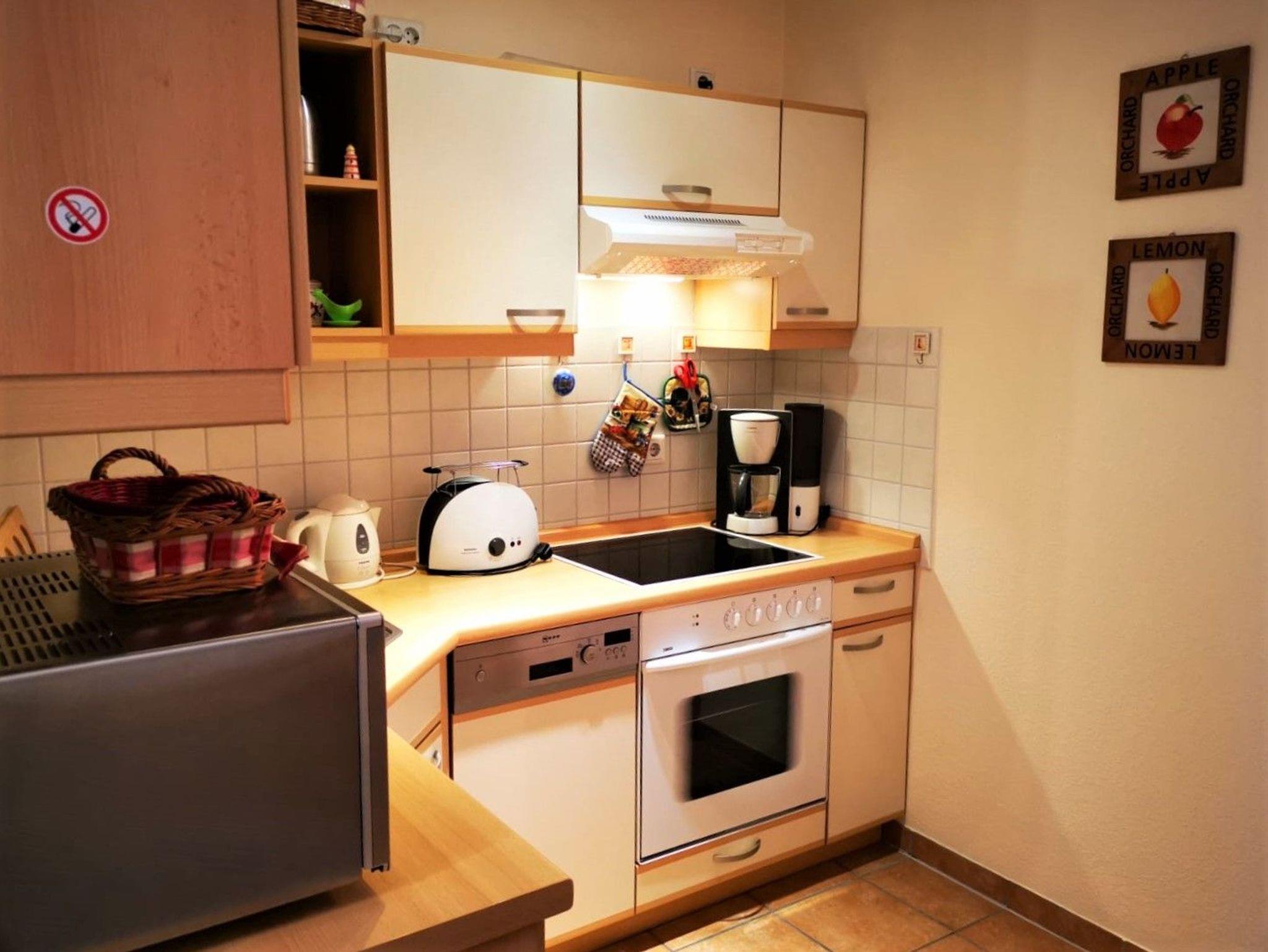 Die offene Küche ist voll ausgestattet und lässt keine Wünsche offen: Cerankochfeld, Backofen, Mikrowelle, Geschirrspüler, Kühlschrank sowie alle nötigen Küchenutensilien machen das Kochen zum Vergnügen. Der angrenzende Essbereich bietet Platz für gemeinsame Mahlzeiten oder einen ausgedehnten Frühstücksstart in den Tag.