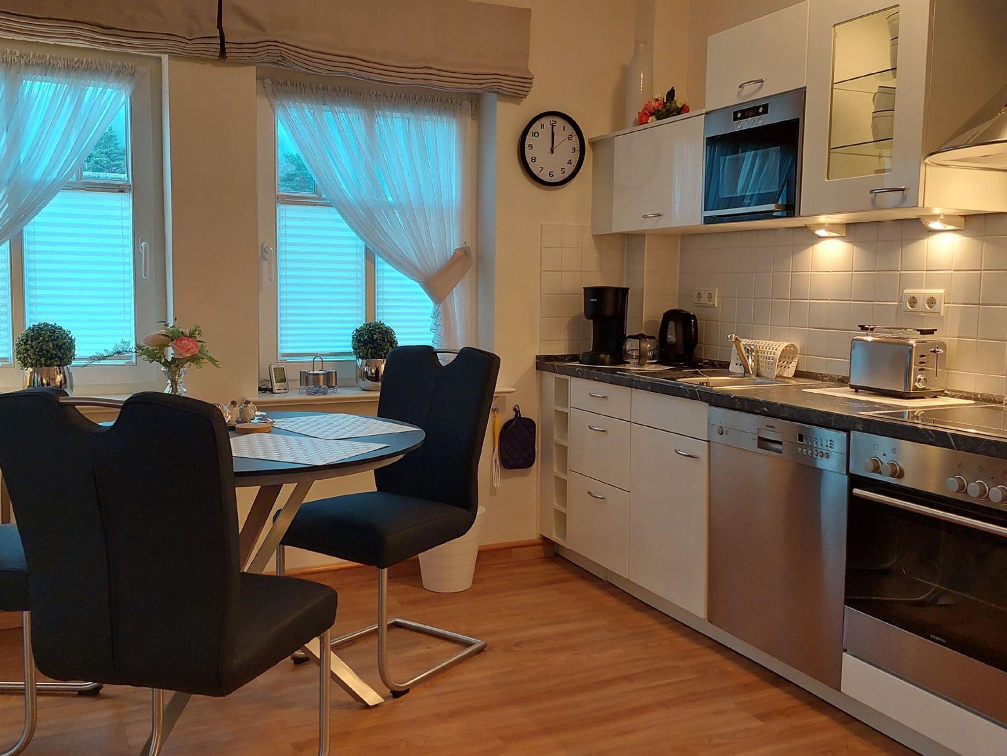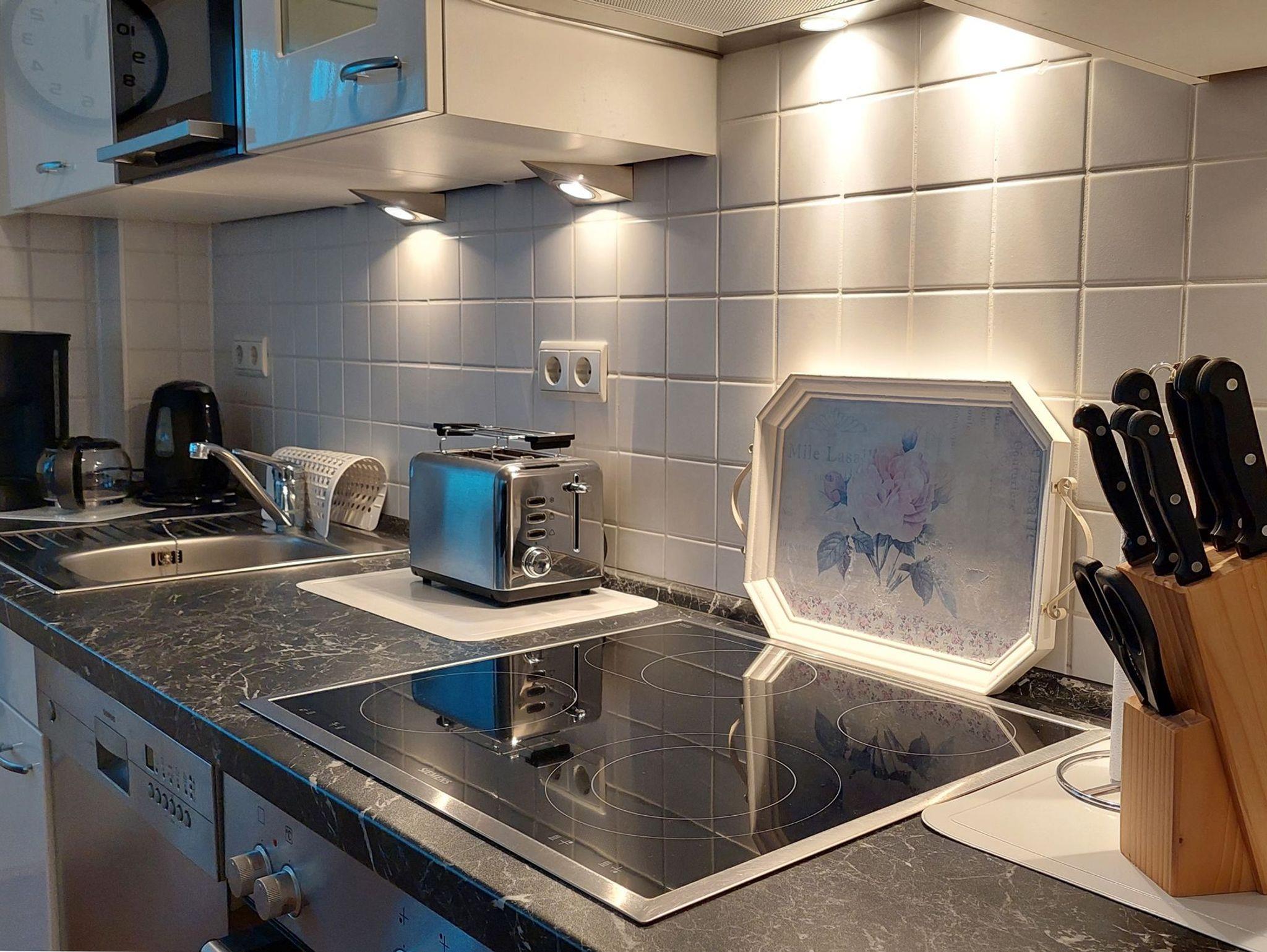 Die Küche ist mit Backofen, Kühl-/Gefrierkombination, Geschirrspüler, Mikrowelle, Kaffeemaschine, Toaster, Wasserkocher und anderen diversen Küchenhelfern komplett ausgestattet.