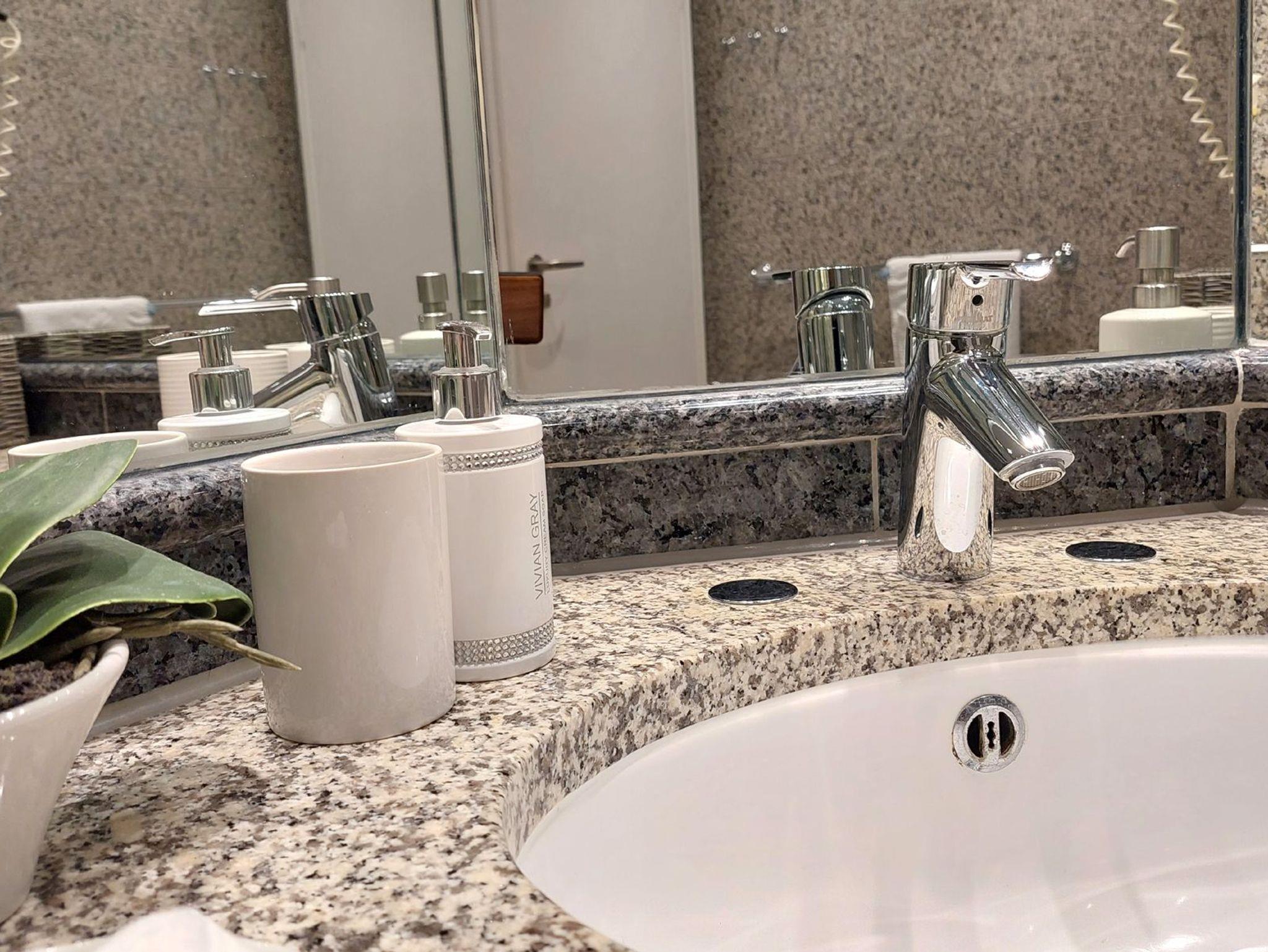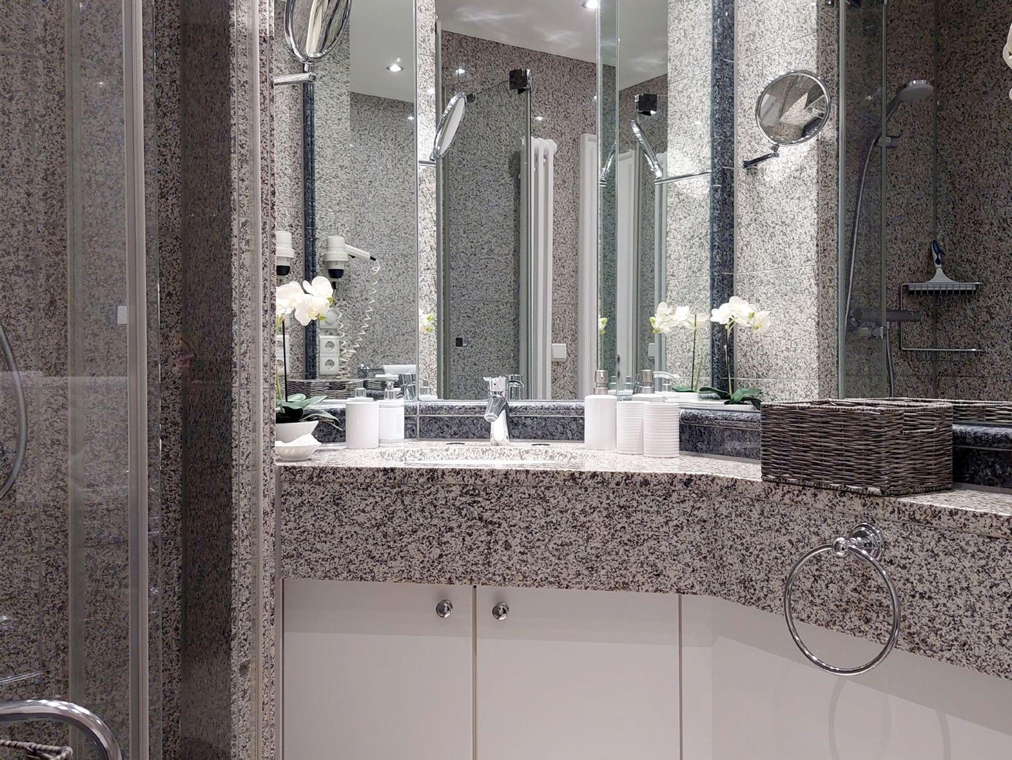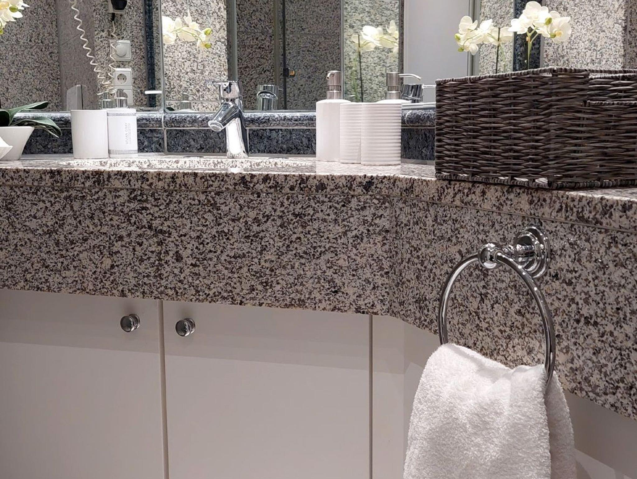Das mit Granit geflieste Badezimmer umfasst eine Dusche, Waschtisch, WC, Kosmetikspiegel und Fön.