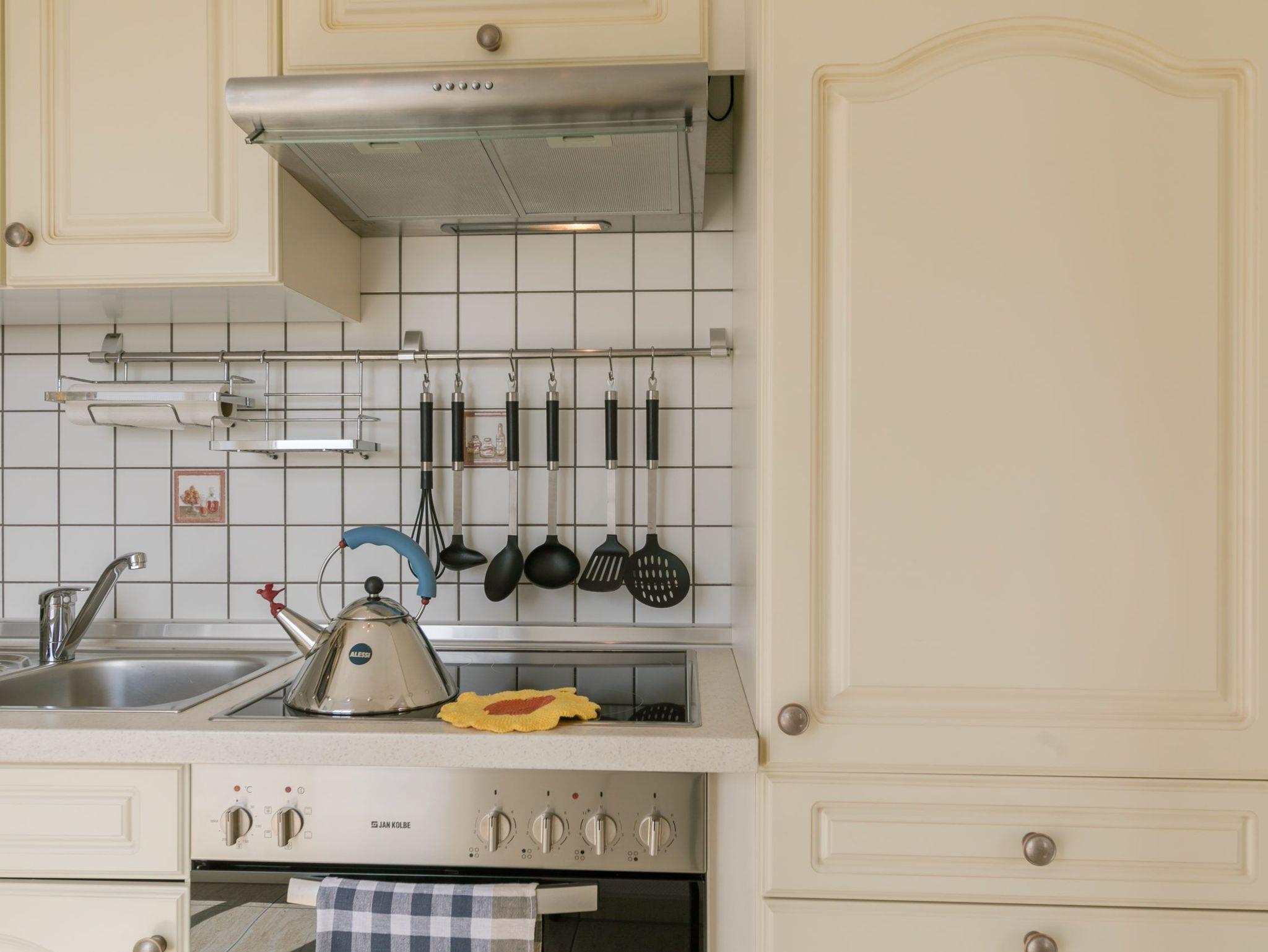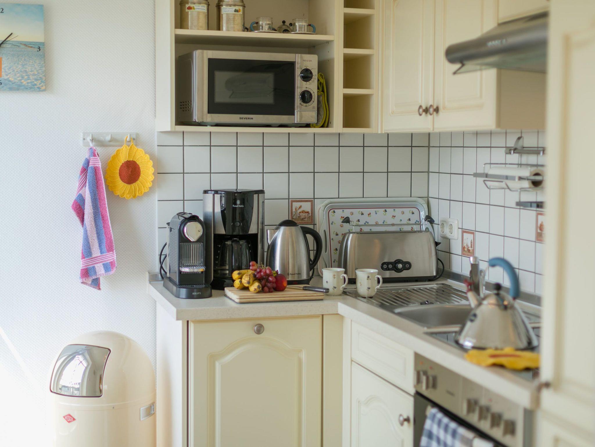 An den Wohnbereich grenzt eine sehr gut eingerichtete Küchenzeile an (Geschirrspüler, Kühlschrank mit Gefrierfach, Cerankochfeld, Backofen, Mikrowelle, Nespresso-Maschine mit Milchaufschäumer + zusätzliche Kaffeemaschine, Toaster, Wasserkocher, hochwertiges Porzellan, vollständiges Kaffee- und Essservice etc.).