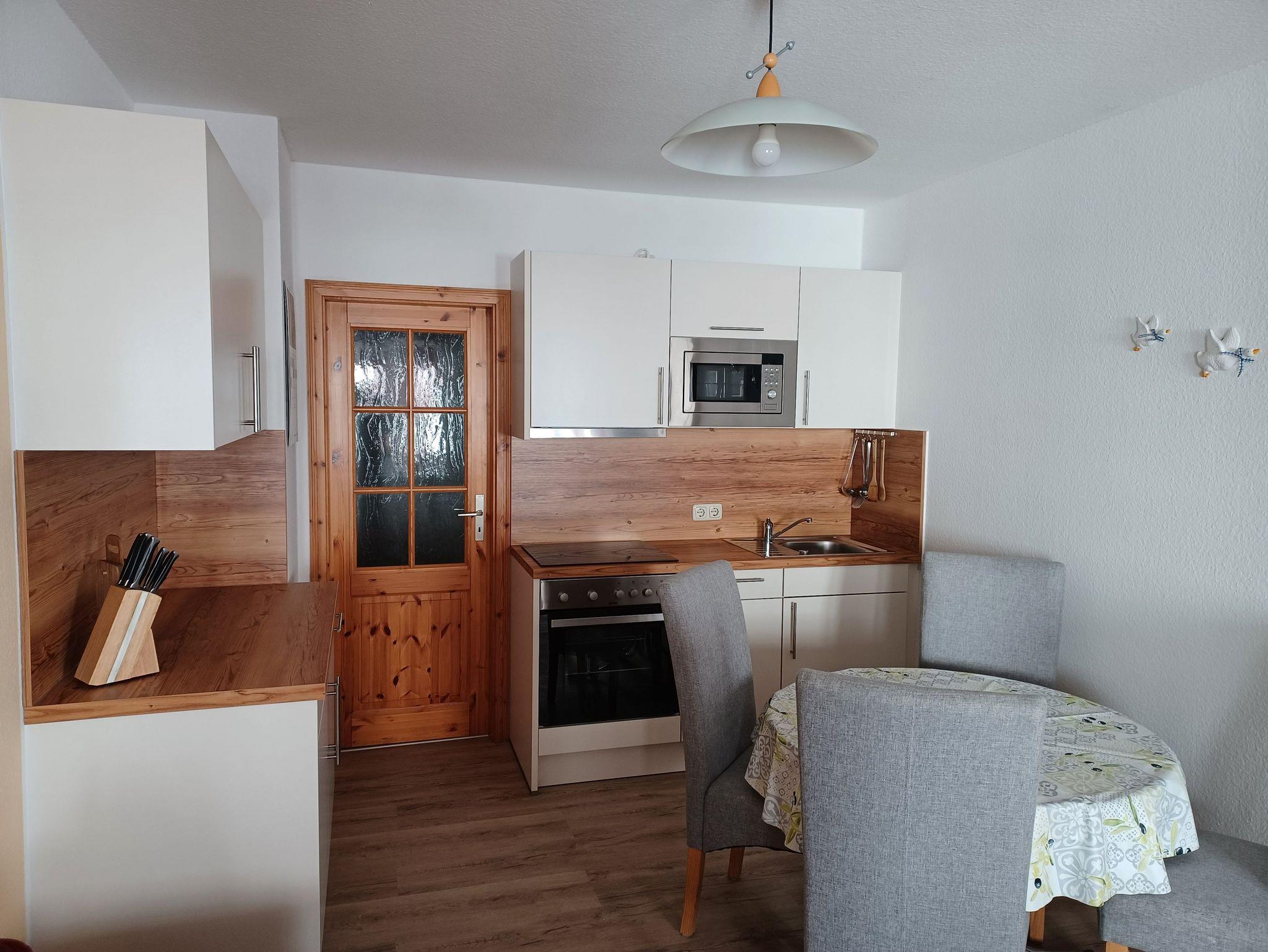 Wohnküche als Durchgangszimmer (ca.16 m²) mit integriertem verglasten Balkon (4 m²), Ausziehcouch für 2 Pers. 1,60 m x 2,0 m, Eßtisch für 4 Personen, Küchenzeile mit Kühlschrank, Cerankochfeld mit Backofen, Spüle, Mikrowelle, Geschirrspüler, Kaffeemaschine, Wasserkocher, Toaster, Geschirr, Flachbild TV, Radio. Flur und Duschbad mit je 4m².