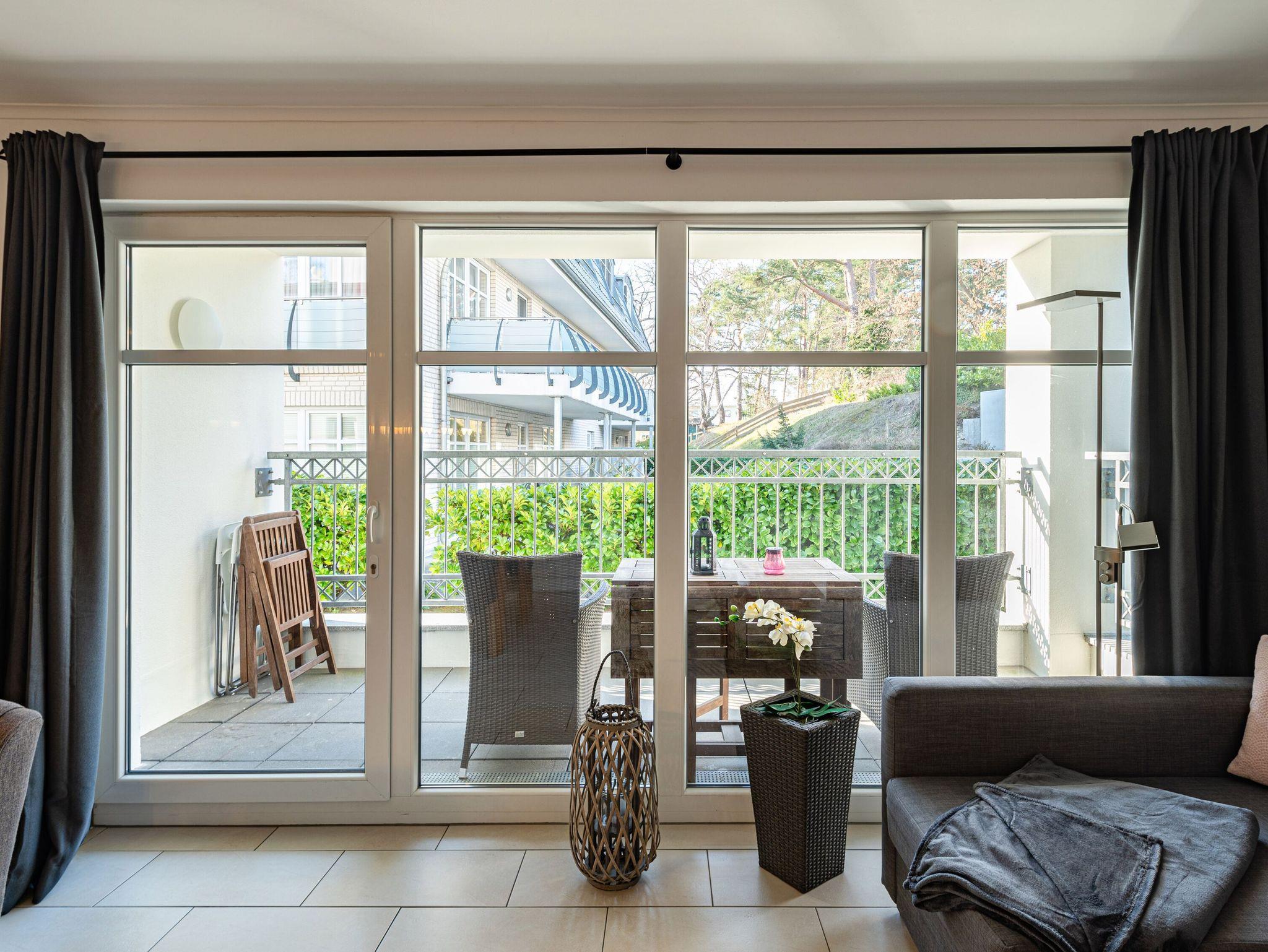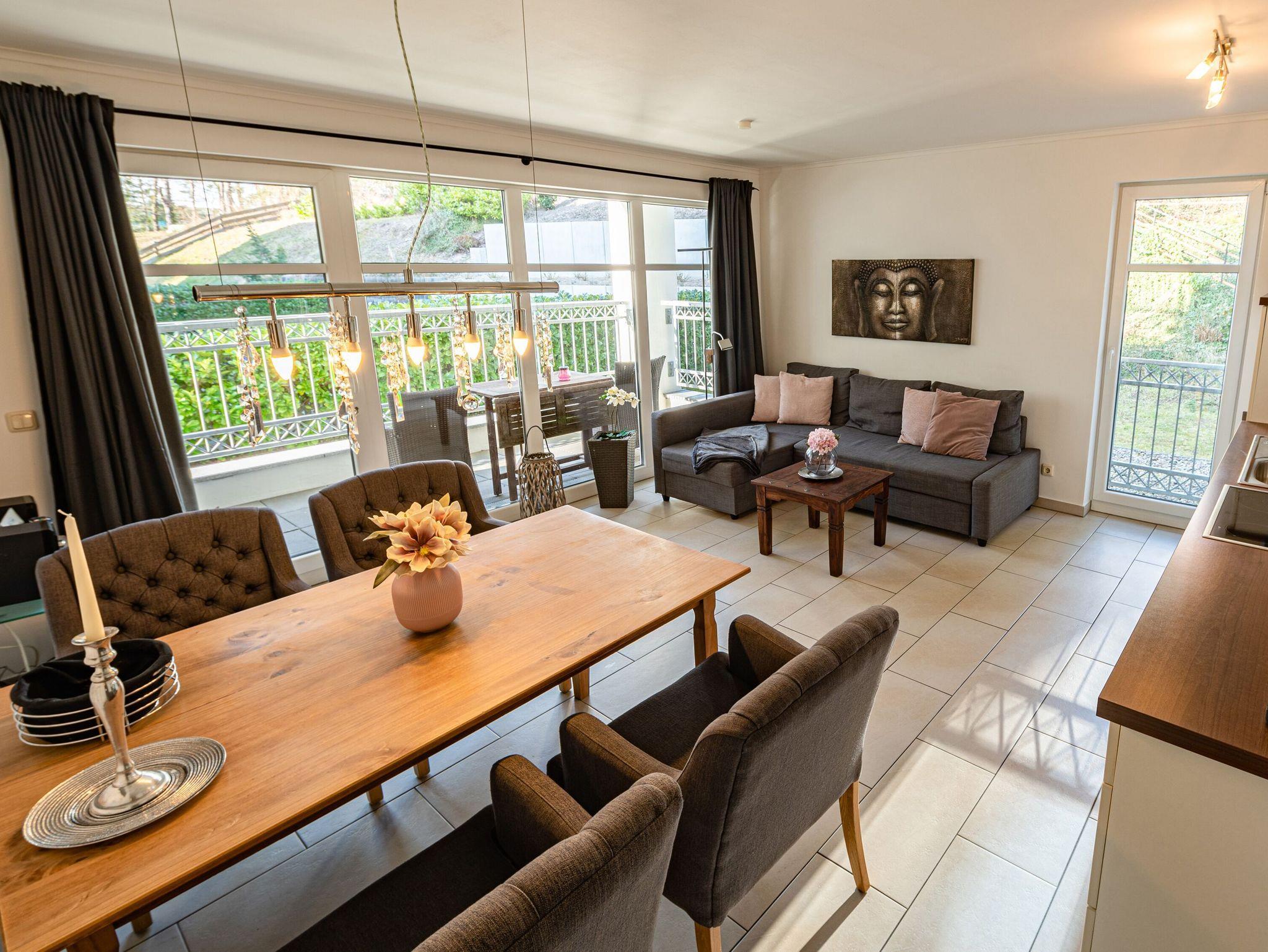 Speisen können Sie am großen Esstisch im Wohnzimmer. Bei starkem Wind aus Nordost hören Sie hier sogar die Wogen der Ostsee rauschen, deren herrlicher Sandstrand von der Dünenresidenz Königin Augusta nur ca. 350 Meter Fußweg entfernt liegt.