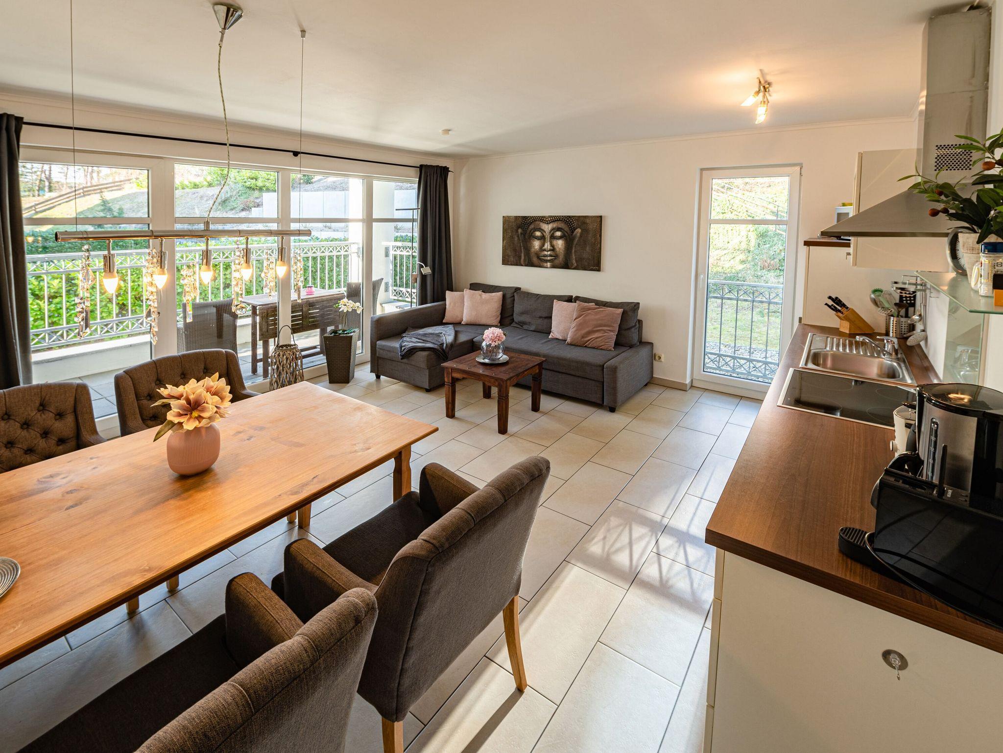 Die moderne Wohnküche ist bestens ausgestattet, damit Sie sich bequem selbst bekochen können. So stehen Ihnen hier u.a. ein Ceranherd mit Backofen und Dunstabzugshaube, ein Kühlschrank mit Gefrierfach, eine Spülmaschine, eine Mikrowelle, eine Filterkaffeemaschine, eine Kapselkaffeemaschine, ein Toaster sowie ein Wasserkocher und diverses Kleininventar zur Verfügung. Bis zum nächsten Einkaufsmarkt mit Bäcker sind es übrigens nur knapp 400 Meter.