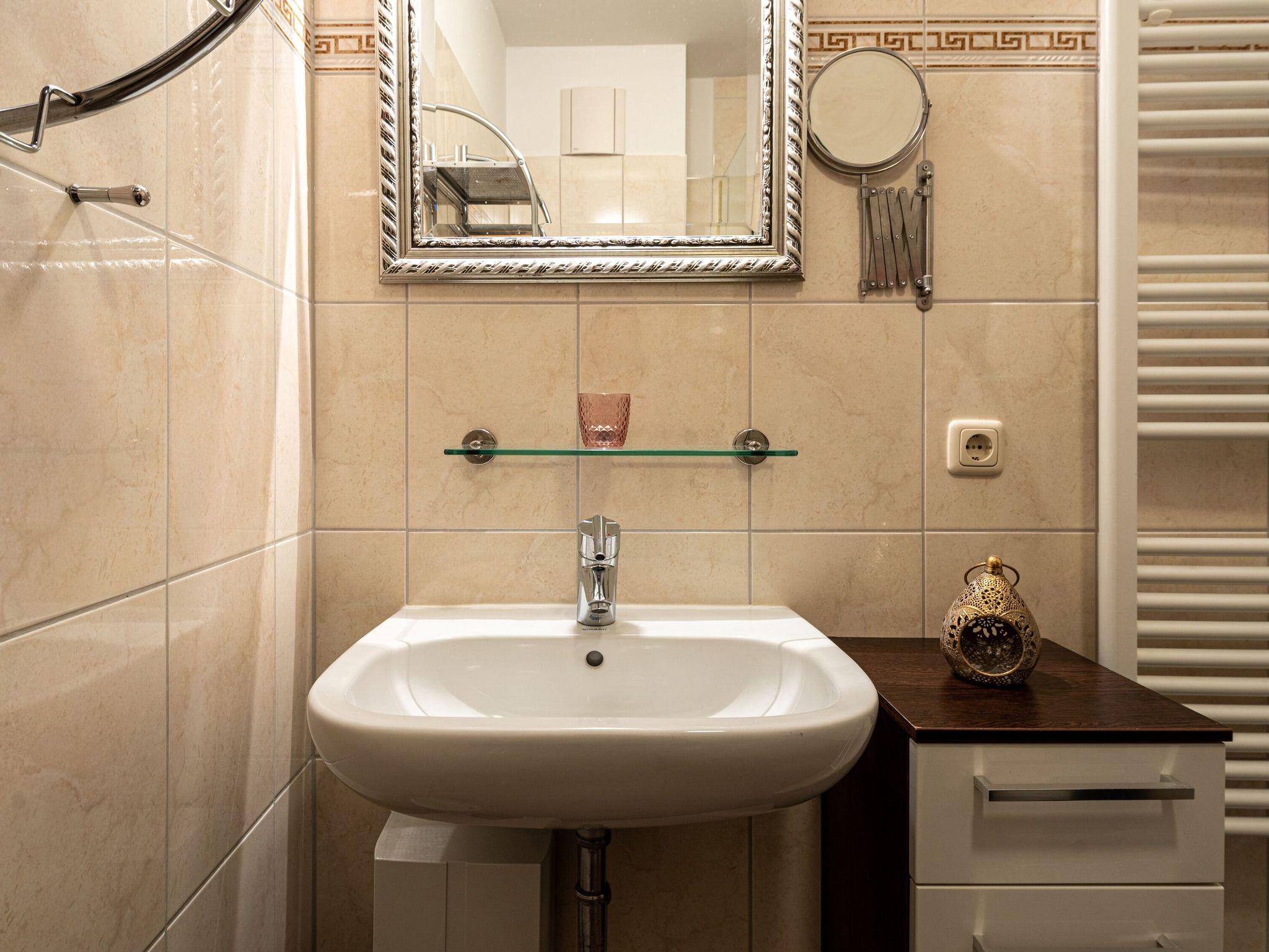 Komplettiert wird Ihr Urlaubsdomizil durch das Badezimmer mit Dusche/WC, Waschbecken, Kosmetikspiegel und Fön.