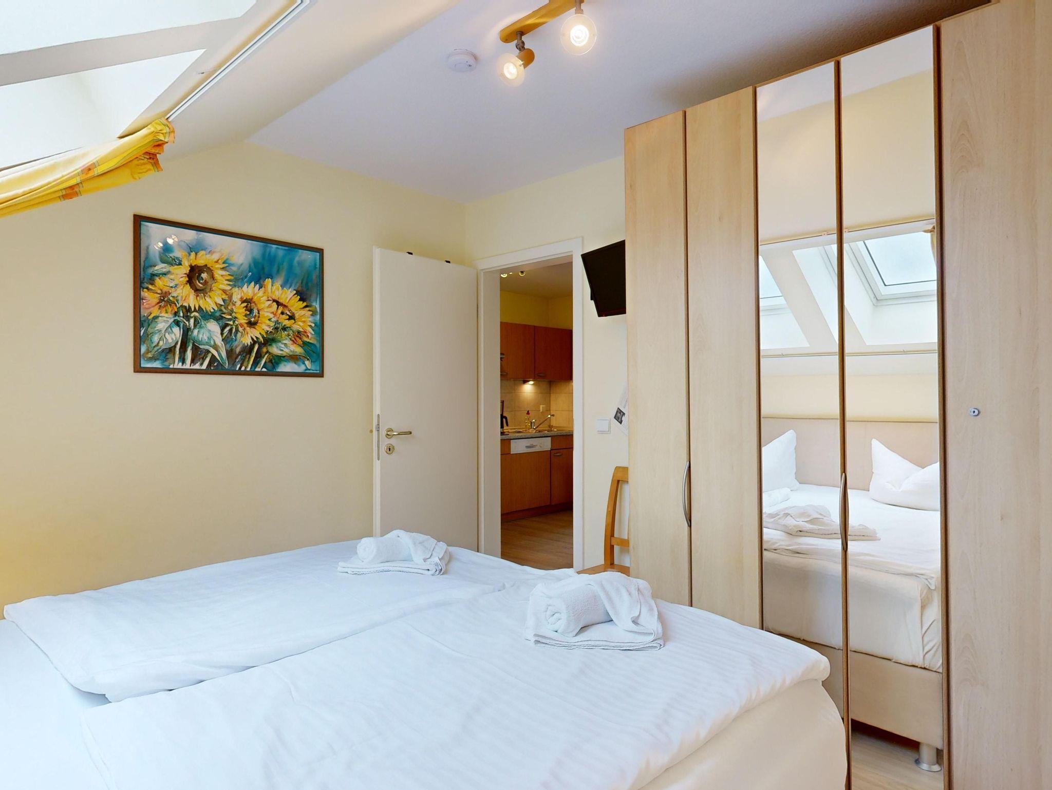 ? 1 Schlafzimmer mit einem Doppelbett und Kleiderschrank