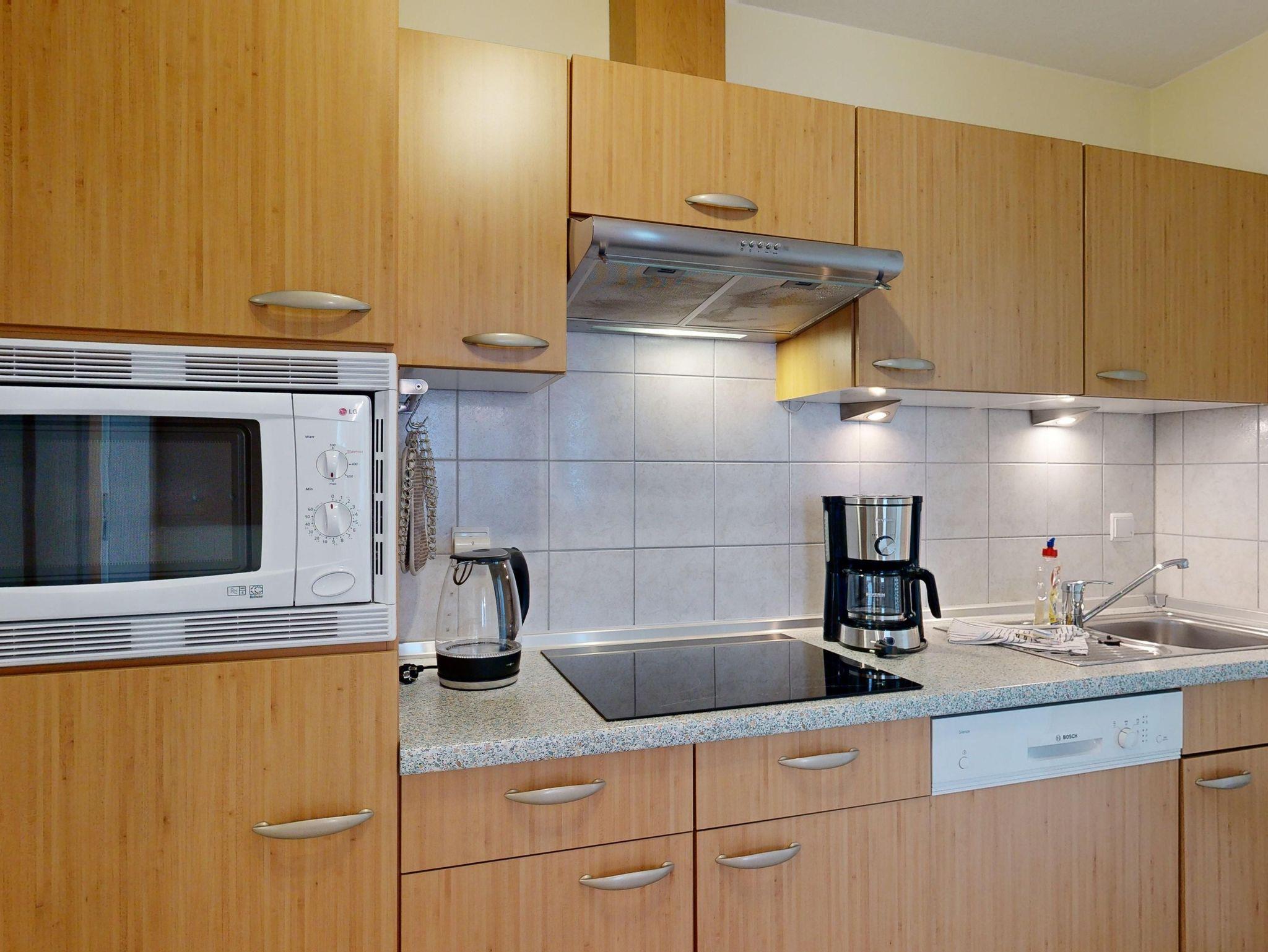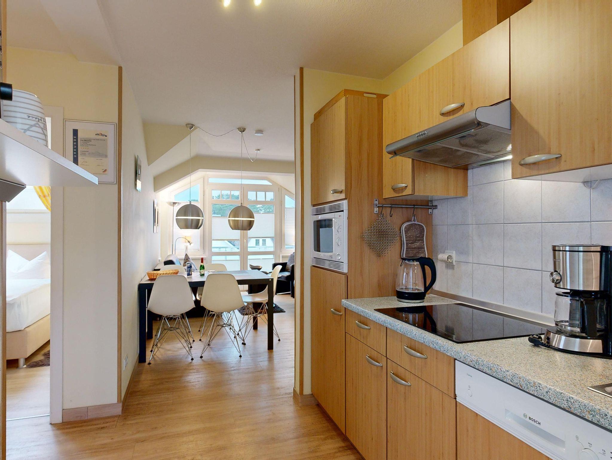 ? separate gut ausgestattete Küche mit einem Induktionskochfeld, Spülmaschine, Mikrowelle, Kaffeekapselmaschine, Wasserkocher, Toaster