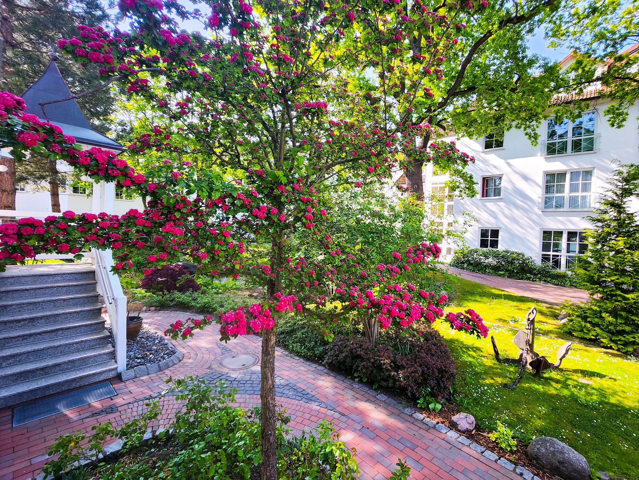 Die Ferienwohnungen liegen in einem kleinen Park mit altem Baumbestand und einem Gartenteich mit Springbrunnen. Bänke und überdachte Freisitze in den gepflegten Gartenanlagen laden zum Verweilen ein.