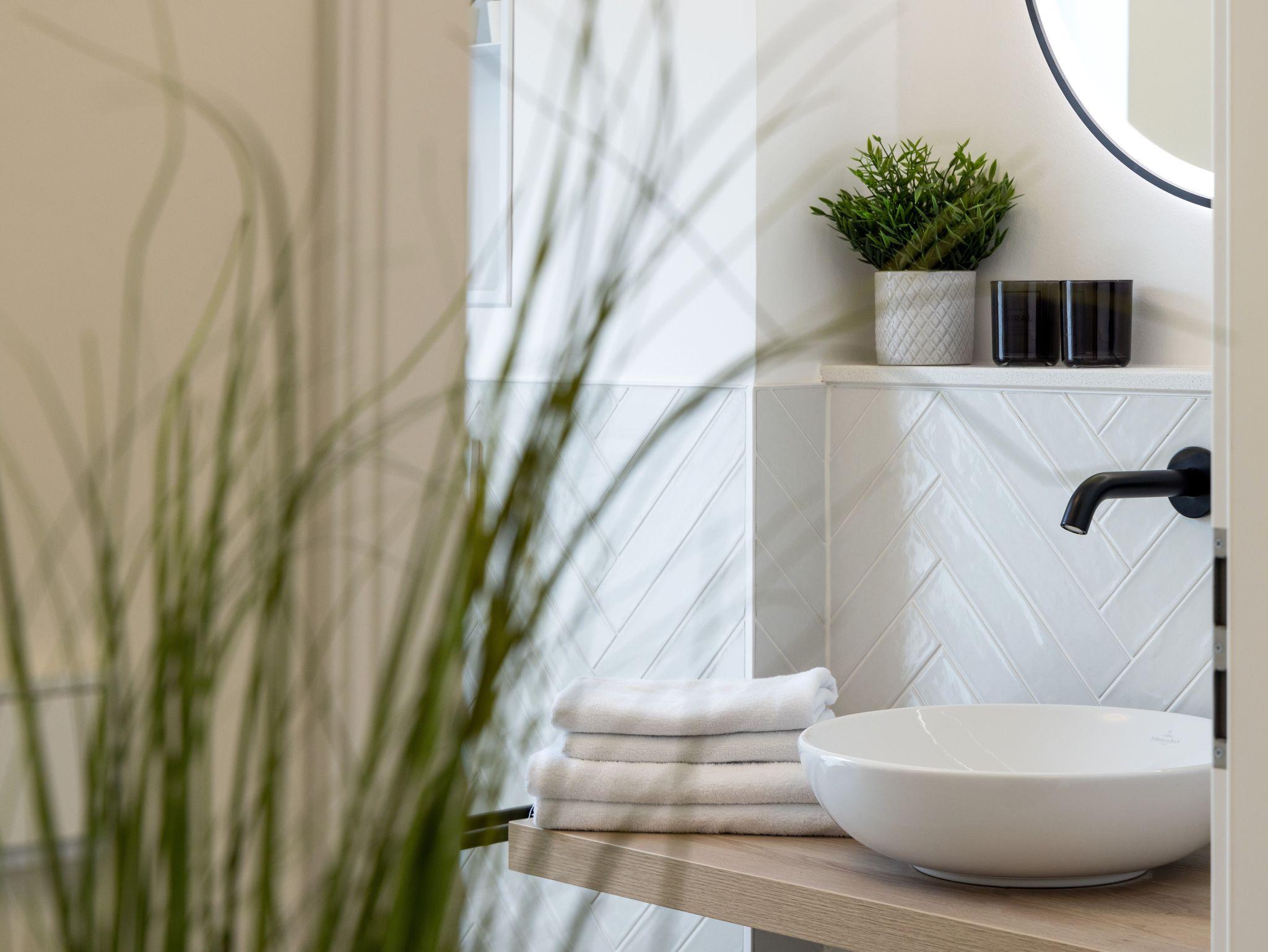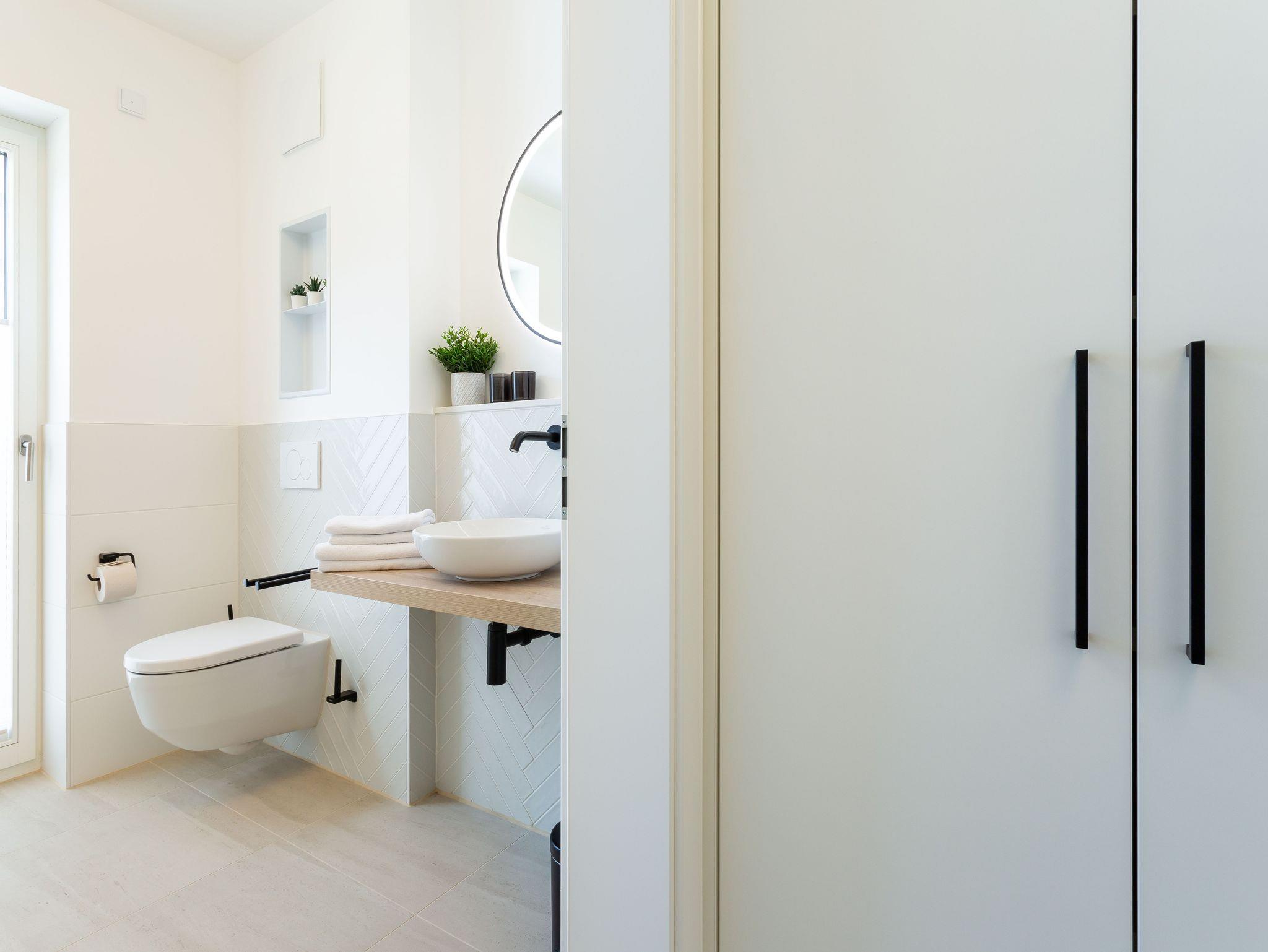 Das sonderangefertigte Inventar des Bades (5,45 m²) ist erstklassig und besticht durch seine Optik.