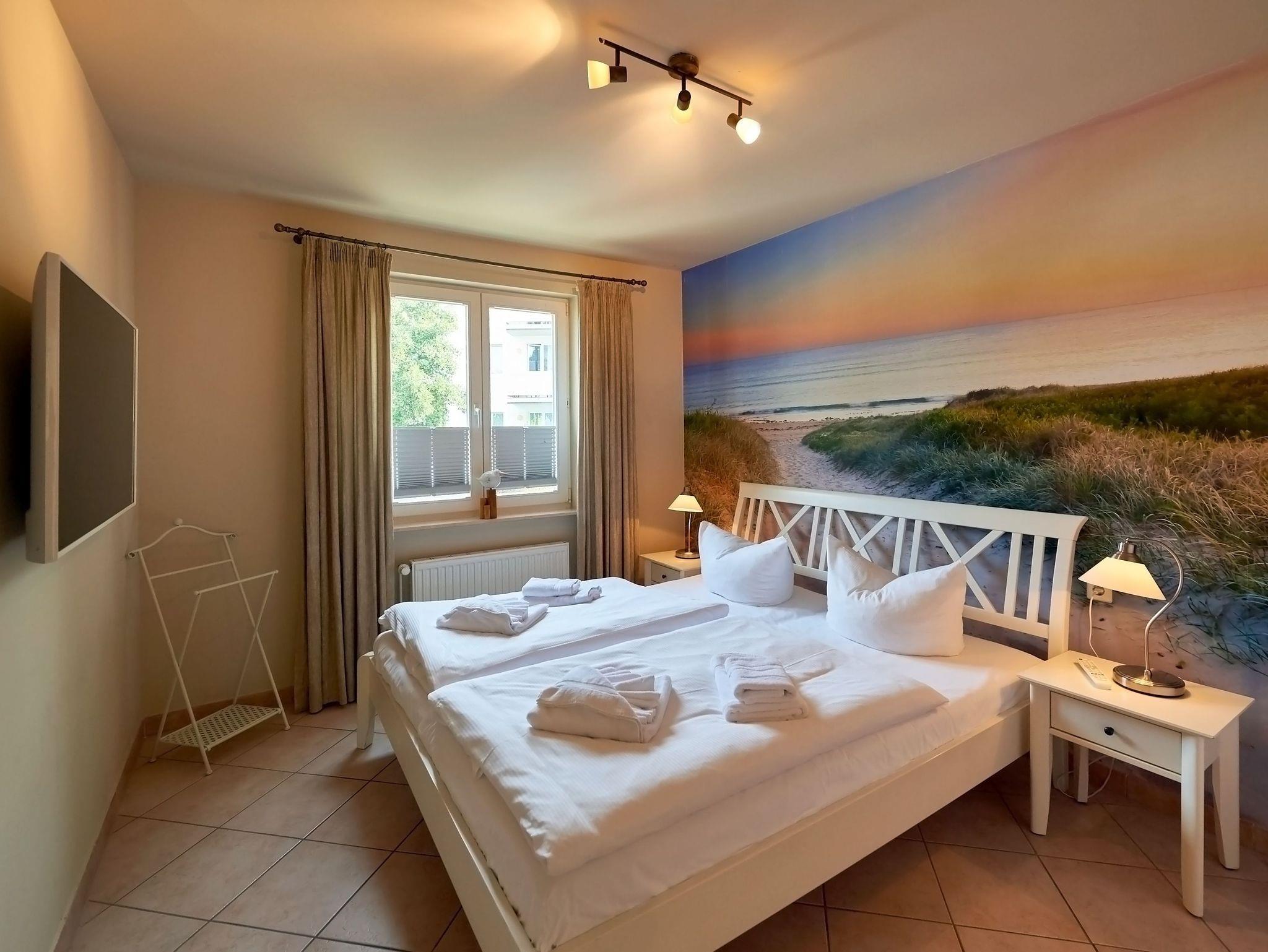 Das Appartement verfügt weiterhin über ein Schlafzimmer mit einem Doppelbett (1,80x200m) und ausreichend Stauraum im großen Kleiderschrank sowie einen weiteren Fernseher.