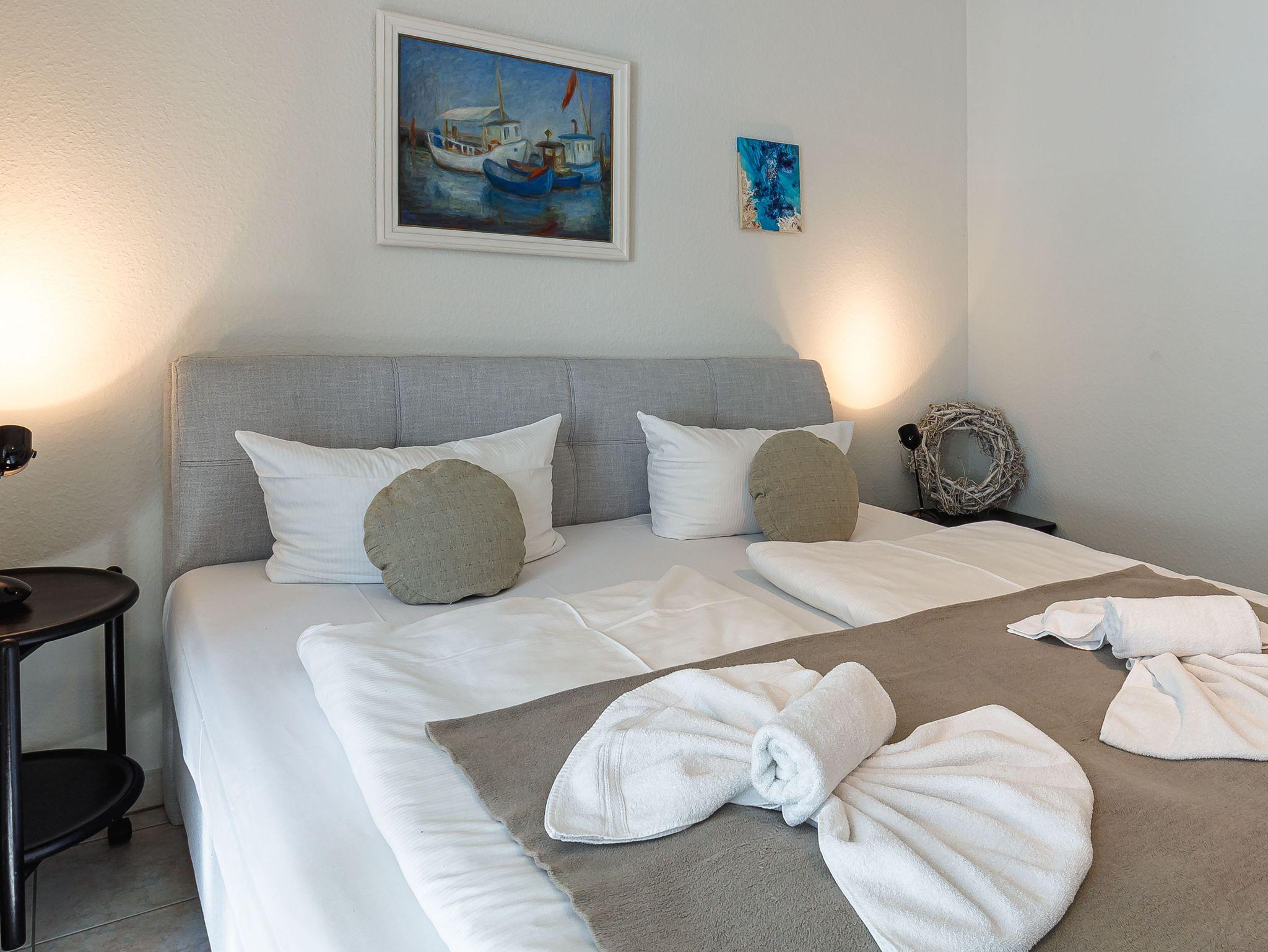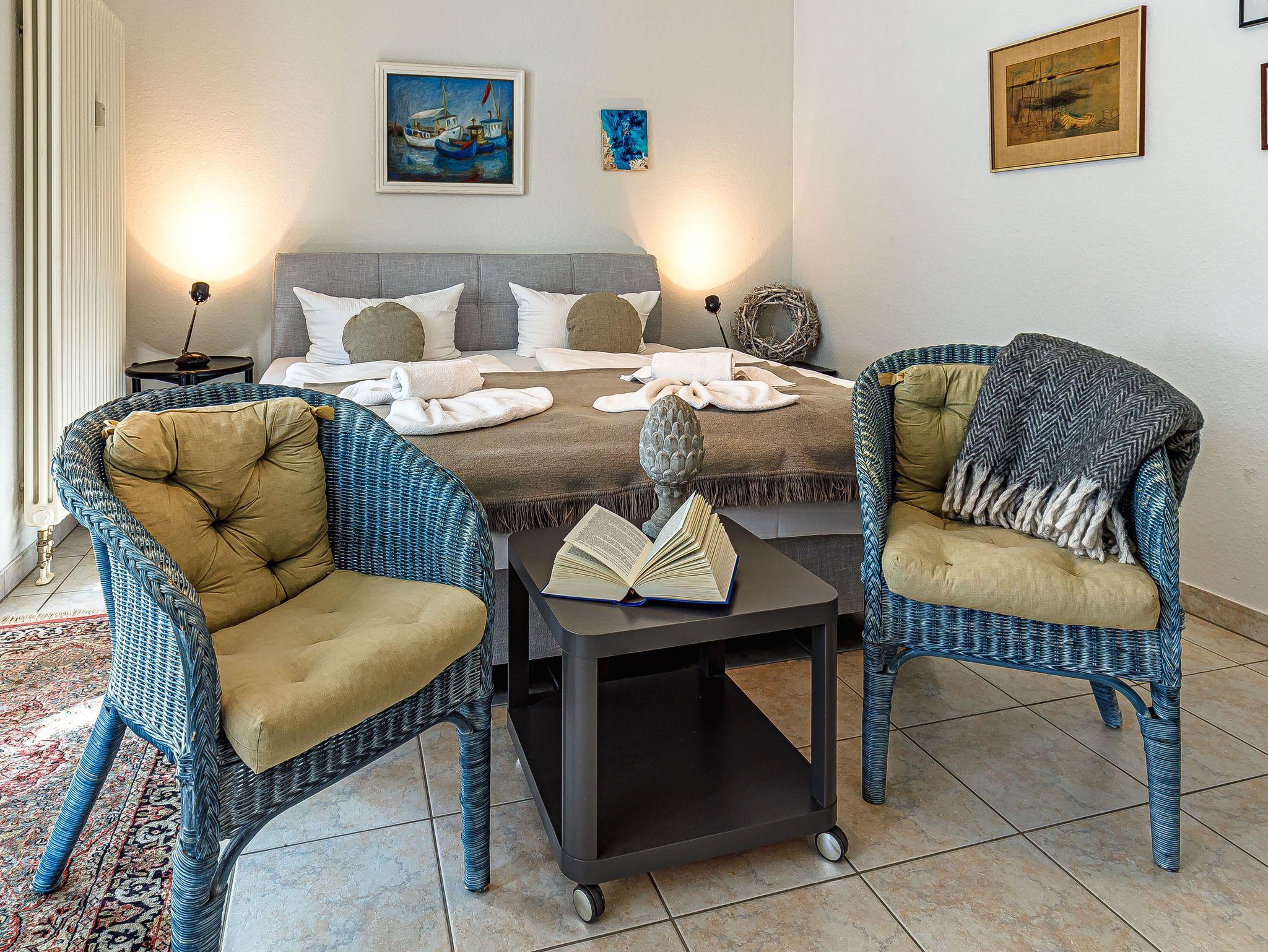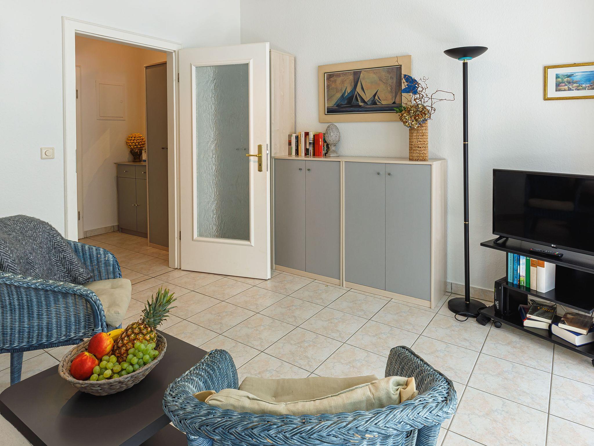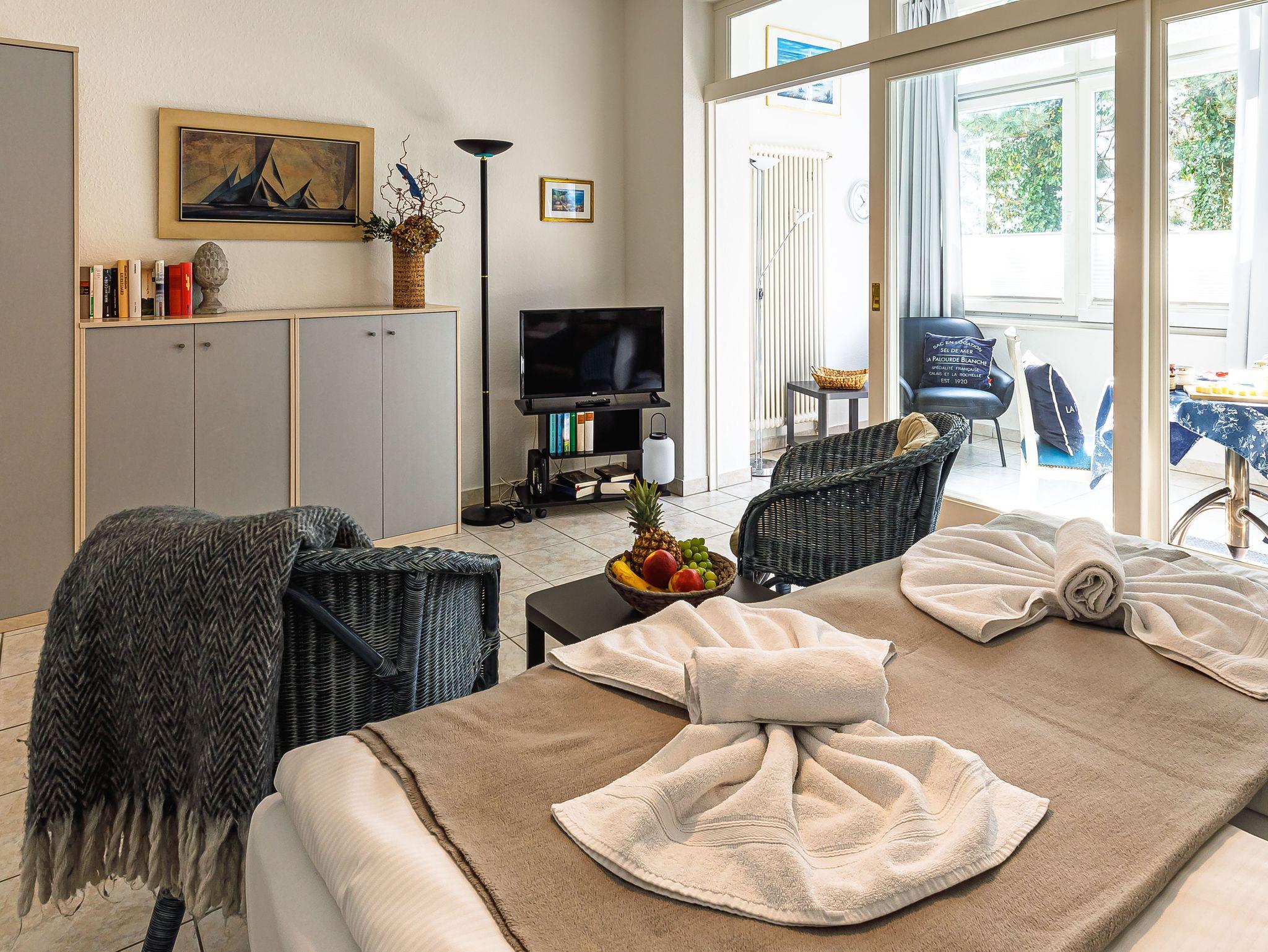 Nettes kleines Apartment für Zwei in bester Strandlage direkt an der Binzer Strandpromenade. Wohn-Schlafraum mit TV, Sitzecke und Doppelbett.