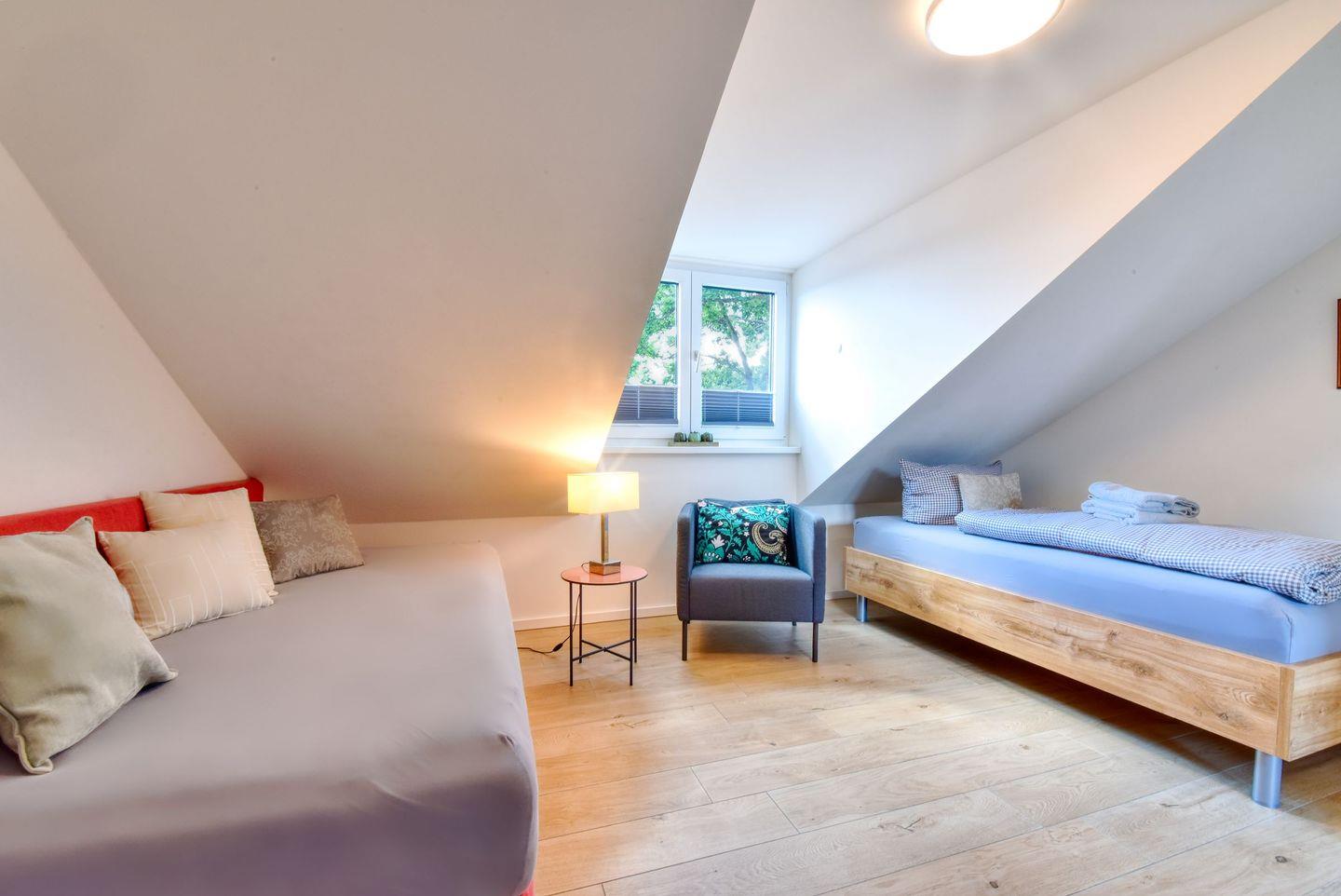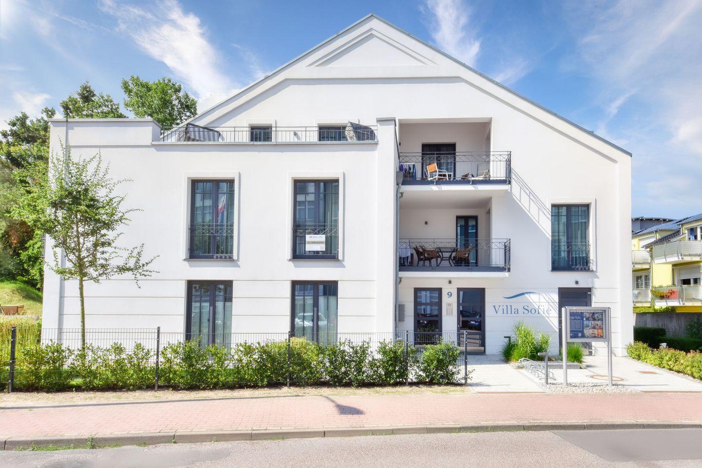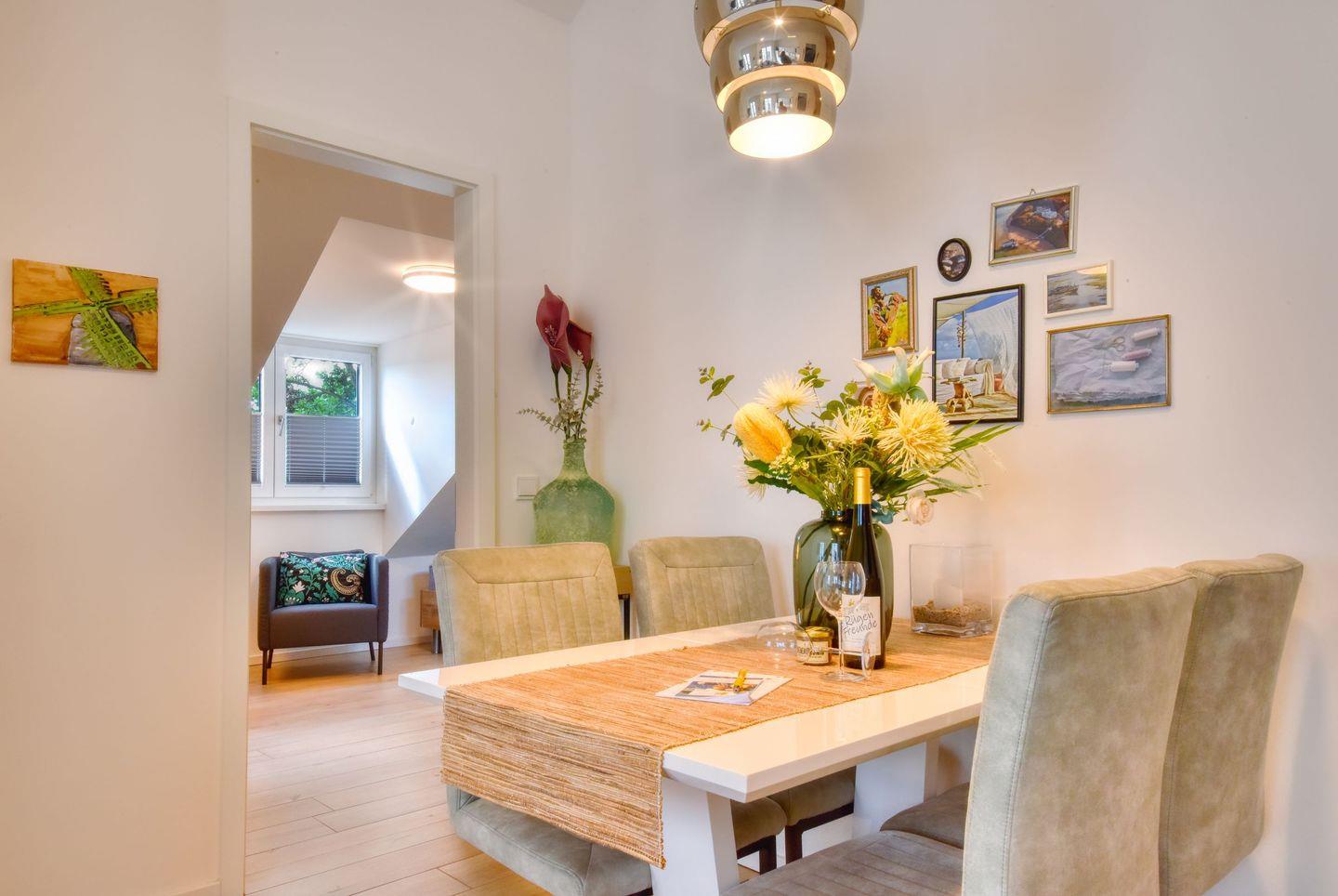 Genießen Sie den Komfort und die Dachterrassenidylle des Appartements 'Strandkorb' in der Villa Sofie Binz, nur wenige Schritte vom Ostseestrand.