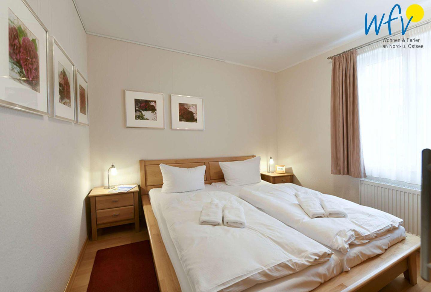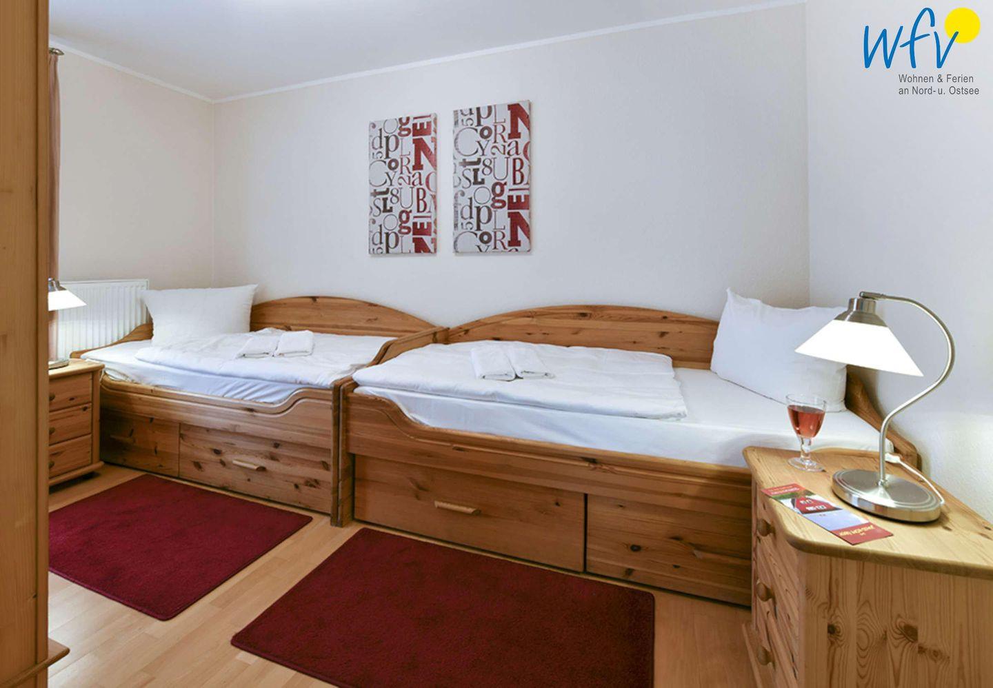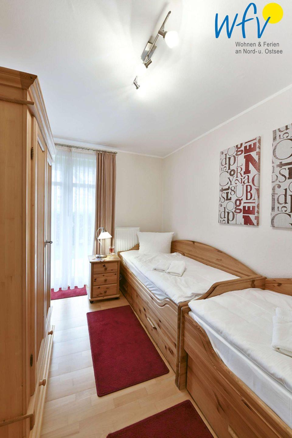 Zwei separate Schlafzimmer sorgen für angenehme Aufteilungsmöglichkeiten. Sie sind mit einem Doppelbett (90 x 200 cm) bzw. zwei Einzelbetten (je 90 x 190 cm) ausgestattet und bieten Platz für vier Personen.