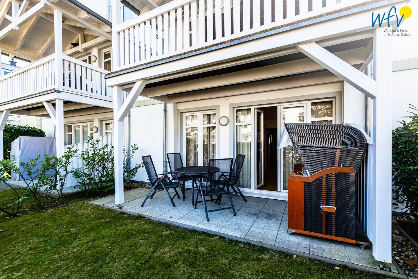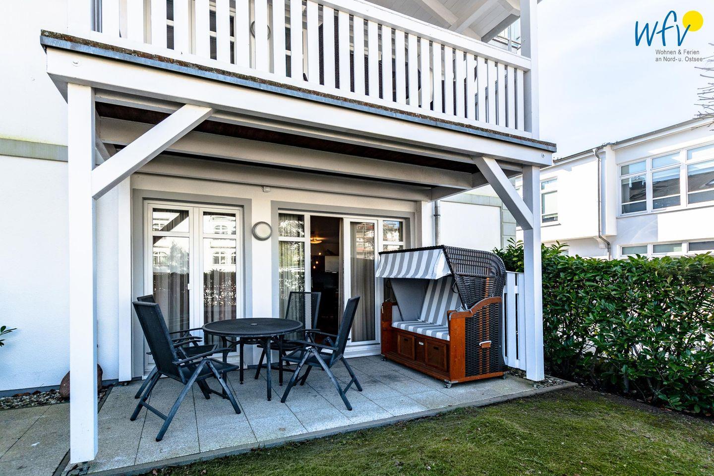 Zu der Rügener Ferienwohnung gehört eine gemütliche Terrasse! Ideal, um wohltuende Ostseeluft zu tanken, mit der Familie zusammenzusitzen und einfach mal die Seele baumeln zu lassen. Hier wartet sogar ein Strandkorb auf Sie!
