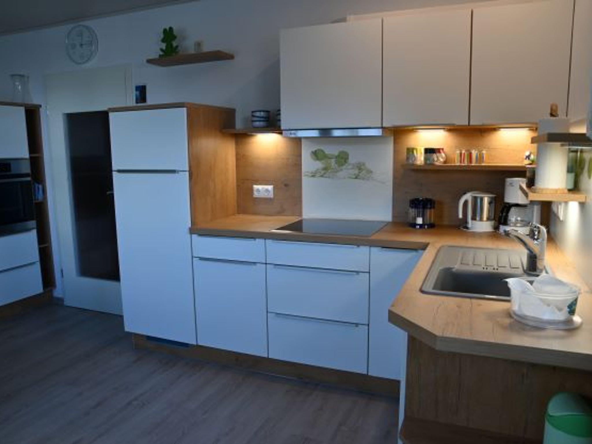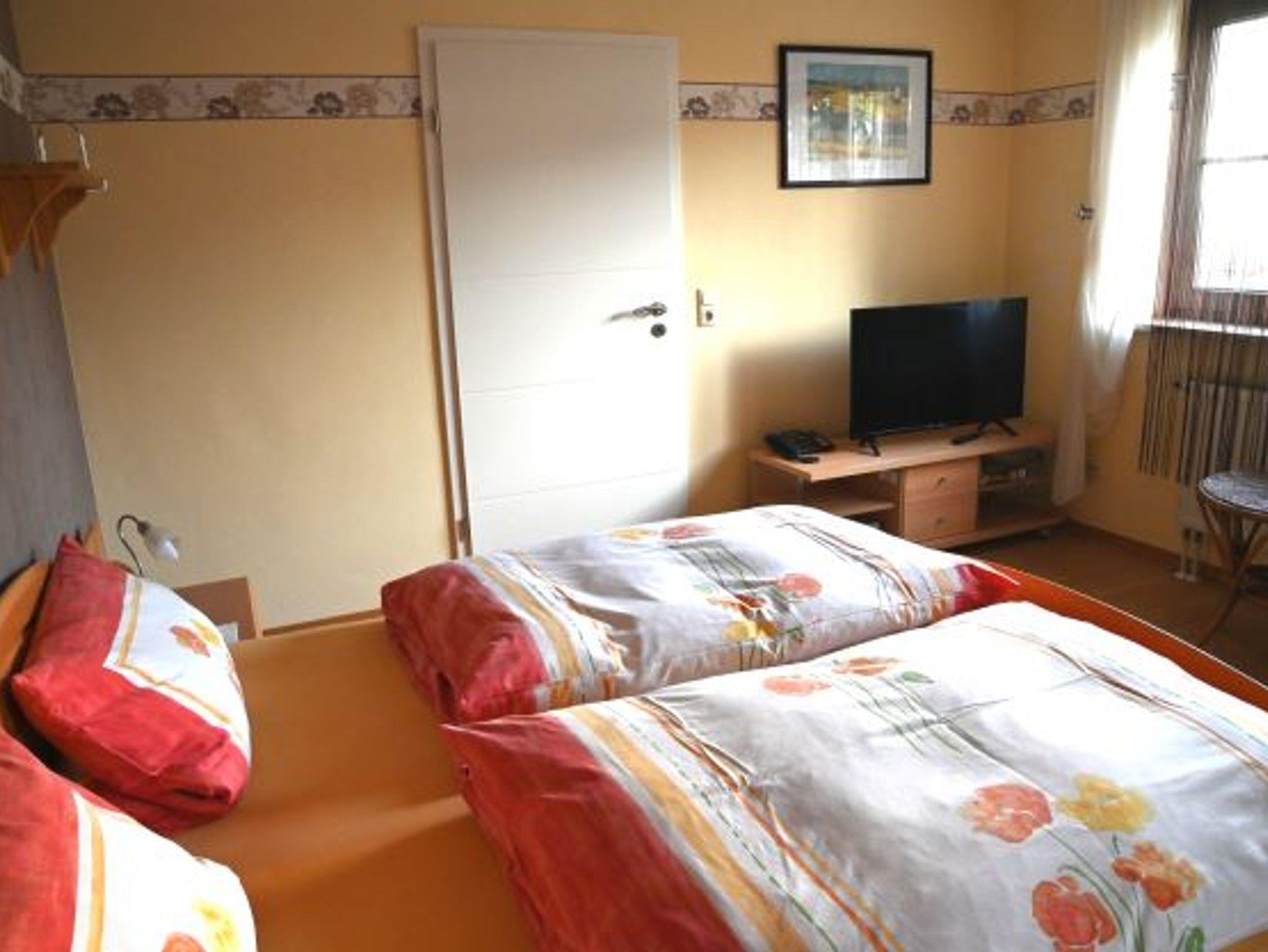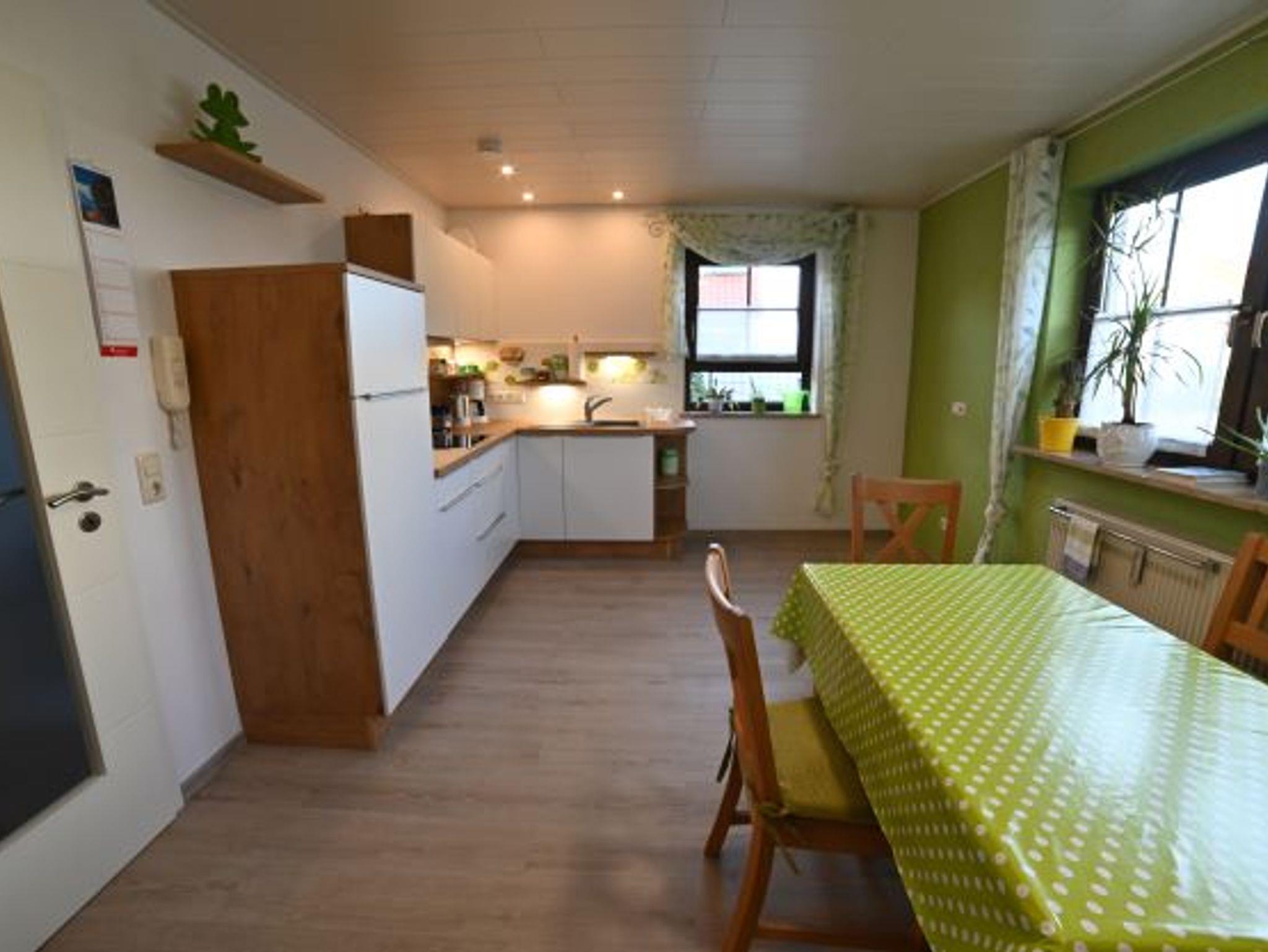 Die Ferienwohnung (40qm) ist bestens geeignet für bis zu 2 Personen. Die Wohnküche ist voll ausgestattet mit Eckbank-Sitzgruppe, Kaffeemaschine, Wasserkocher, Toaster, Rührgerät, Gewürze, Mehl, Zucker, Kaffee und Filtertüten, Spülmittel, Spültücher, Geschirrtücher und CD-Radio. Das Schlafzimmer ist ausgestattet mit einem Doppelbett und großem Kleiderschrank inkl. Kleiderbügel, kleine Sitzgruppe, Fernseher mit digitalem SAT-Anschluss, Telefon mit eigener Rufnummer. Kleinkind-Beistellbett nach Absprache. Bettwäsche und Handtücher sind vorhanden. Das Badezimmer mit Badewanne mit Duschvorhang, Waschtisch-Unterschrank, Spiegelschrank, Fön, Seife und Toilettenpapier rundet das Gesamtbild ab. Im Haus befinden sich eine Waschmaschine und ein Wäschetrockner, welche nach Rücksprache mit genutzt werden können. Parkplatz und WLAN stehen kostenfrei zur Verfügung.