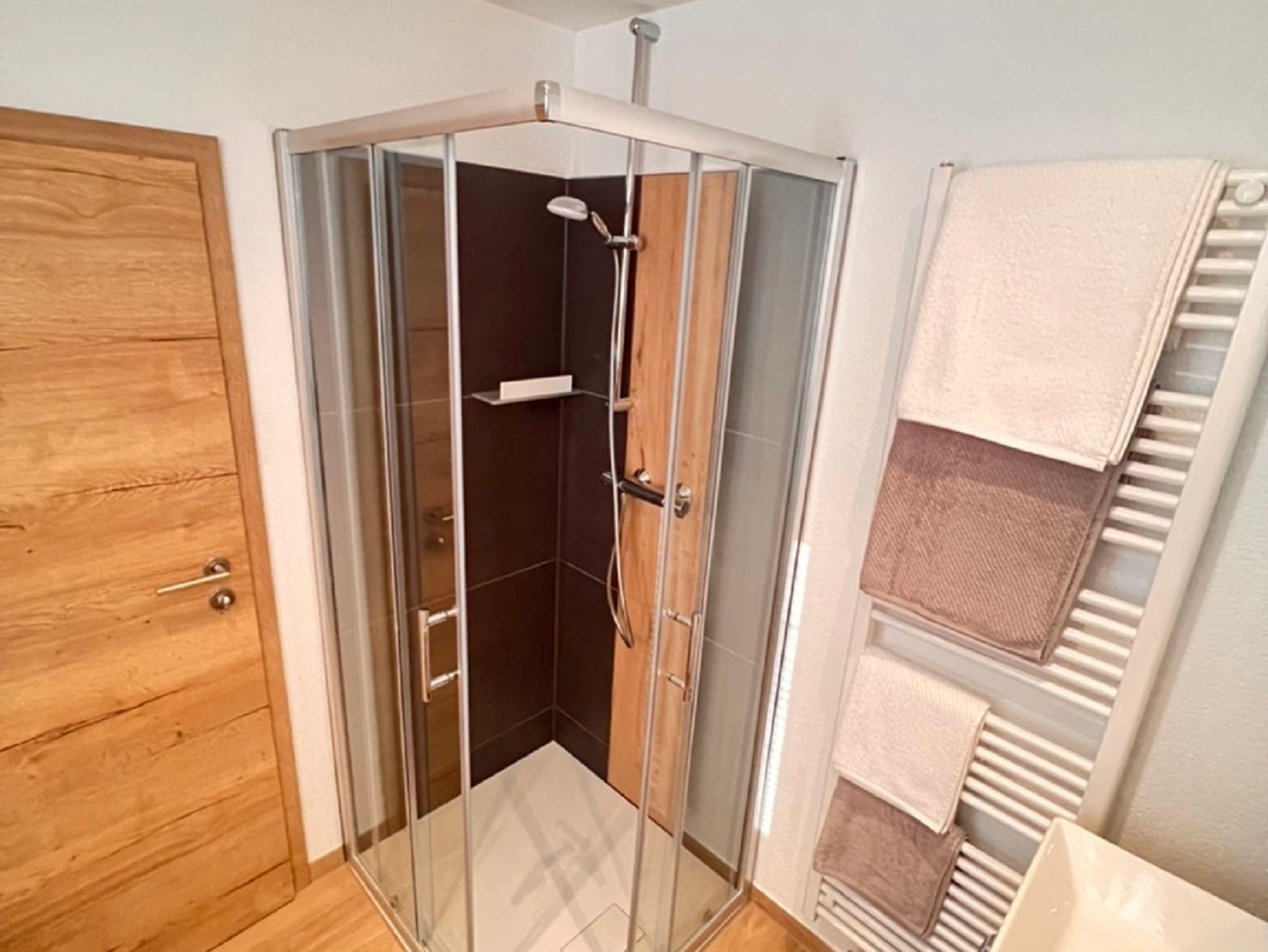 Das Badezimmer ist mit einer Dusche, WC und einem Waschbecken mit Unterschrank ausgestattet.