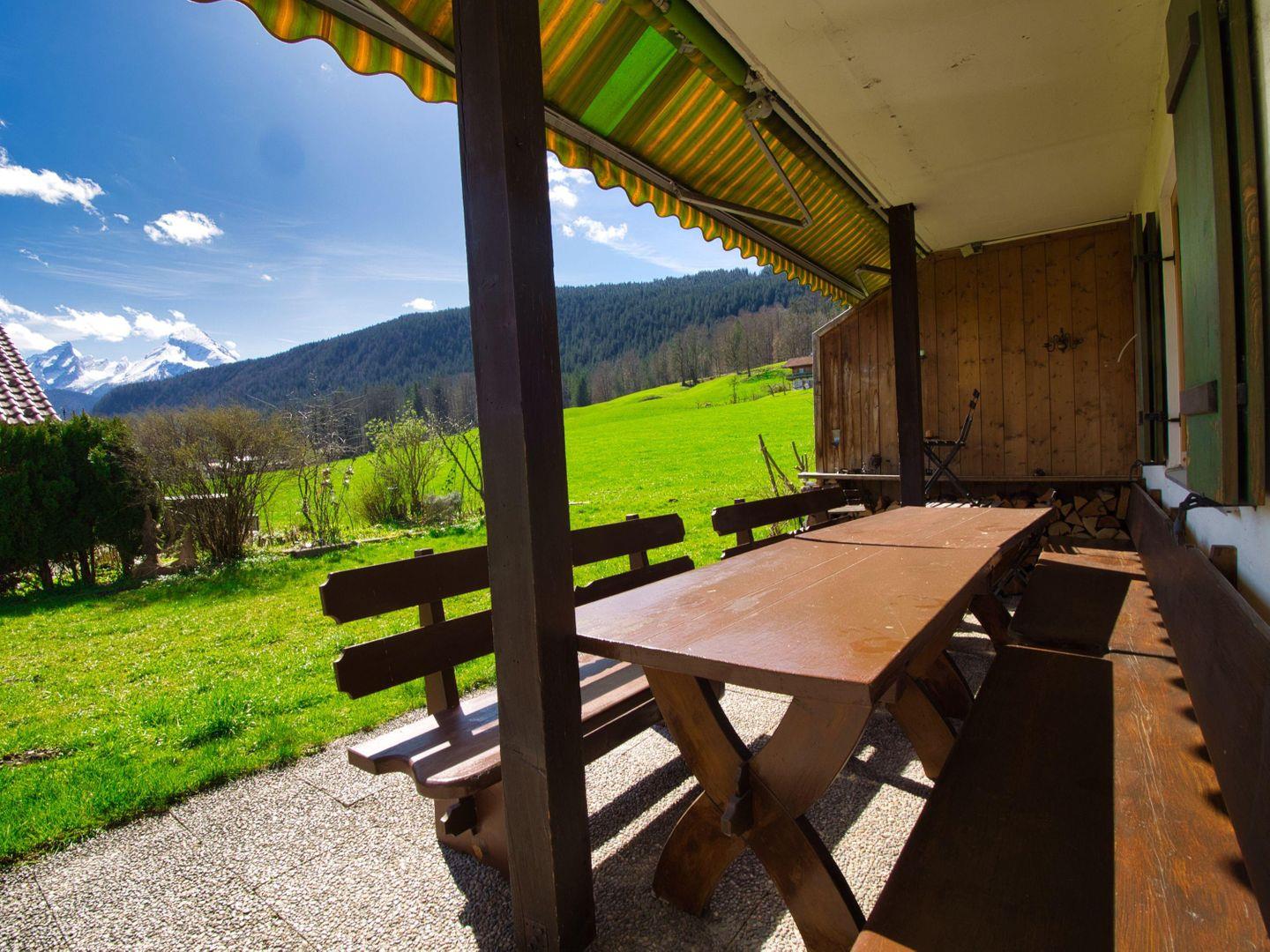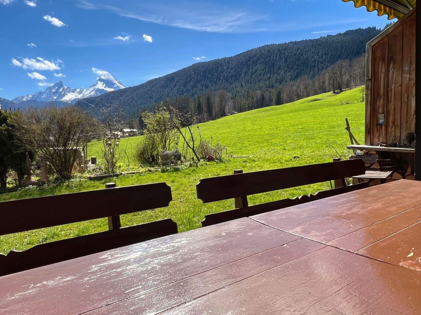Der Garten mit großer Terrasse wird schnell zum Mittelpunkt des Urlaubs. Ob Frühstück im Freien, Spielen mit Kindern oder entspannte Abende – hier genießen Sie Natur pur und den Blick auf die umliegende Bergwelt mit dem Watzmann im Hintergrund. Auch für Gäste mit Hund bietet der Außenbereich viel Freiraum.