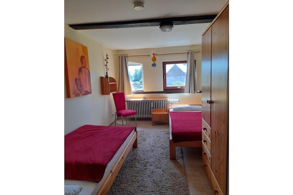 Ferienunterkunft ab 8 Personen Kinderbetten (Zustell), 1 Babybett ) , 6 DZ, 2 große 3 Bett Zimmer, (auf 3 Ebenen) mehrere Duschen/WC, Aufenthaltsraum Aufenthaltsraum mit TV, Kaminofen, DVD, Schlafcouch(ca.35m²), große Küche (gut ausgestattet) Die Anzahl der zur Verfügung gestellten Schlafräume richtet sich nach der Personenzahl. EZ -falls möglich- 10.-EURO Zuschlag pro Nacht. Aufgrund der aktuell stark gestiegenen Unterhaltungs-/Betriebskosten müssen wir unser Gäste leider mit 3,50.-p.P/N (zahlbar bei Anreise vor Ort) beteiligen Außenanlagen mit Wiese, Terrasse etc, generell Alleinbelegung. 5Parkplätze direkt vor dem Haus, weitere in der Nähe Für Ferienworkshops bieten wir einen zusätzlichen wunderschönen Raum f ca. 80m² -Holzboden, Berberteppiche, hell und "sonnendurchflutet"(so sie denn scheint)(separat zu buchen.Dieser Raum steht nicht für Familien-u. Freundestreffen zur Verfügung