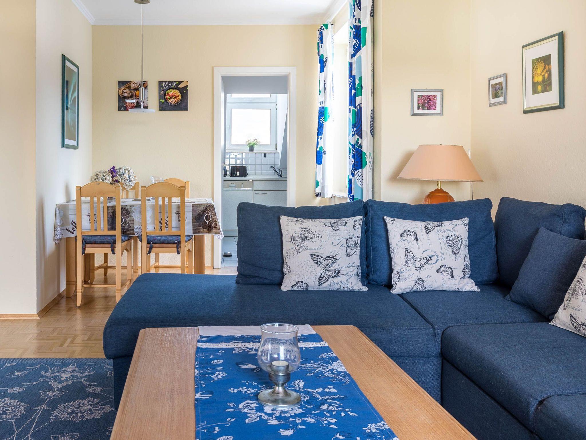 Sie verfügt über einen kombinierten Wohn-/Essbereich mit Zugang zum möblierten Südwest-Balkon. Eine große Sofaecke lädt zum geselligen Miteinander ein. Das Sofa im Wohnbereich kann bei Bedarf ausgezogen werden und so entsteht ein weiterer Schlafplatz (Liegefläche ausgeklappt 130x200cm). Für Ihre Unterhaltung sorgt der TV im Wohnbereich. Entspannen Sie bei einem gemütlichen Fernsehabend und beim Surfen über den hauseigenen WLAN Zugang.