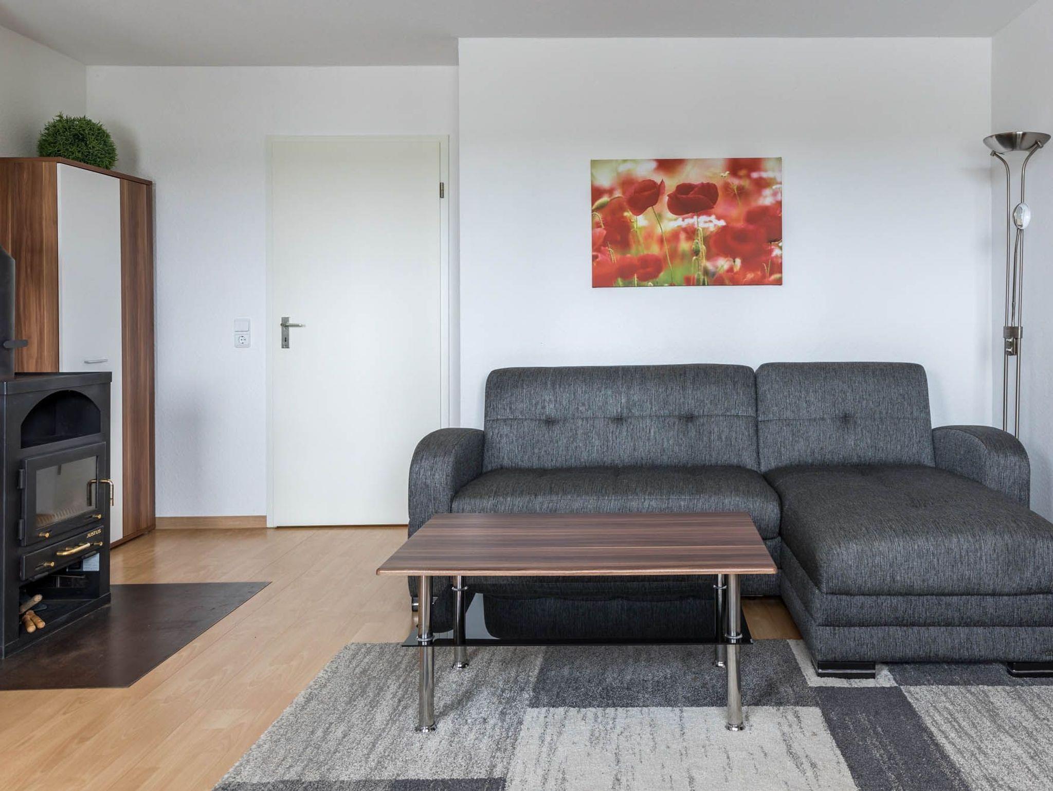 Vom gut ausgestatteten Wohnzimmer mit Kamin im Erdgeschoss gelangen Sie direkt auf die Süd-Terrasse mit Gartenmöbeln. Der schöne Blick auf ein Feld lässt Sie Ihren Ostseeurlaub genießen.