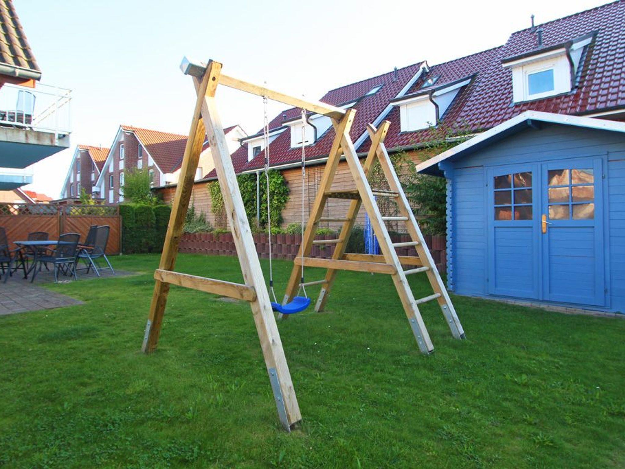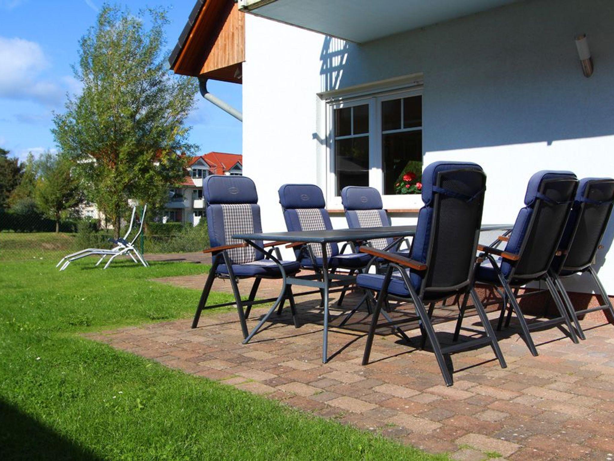 Die großzügige Südterrasse mit angrenzendem Rasengrundstück bietet bequeme Gartenmöbel für 8 Personen, einen Grill sowie einen Blick auf den hauseigenen, kleinen Kinderspielplatz für unsere kleinsten Gäste.