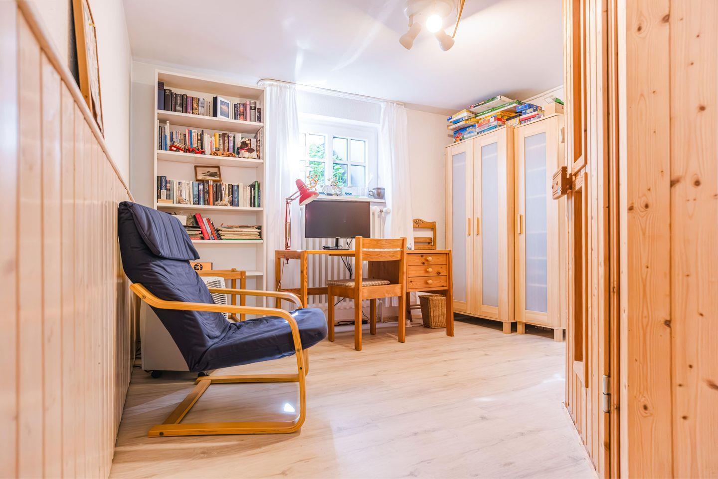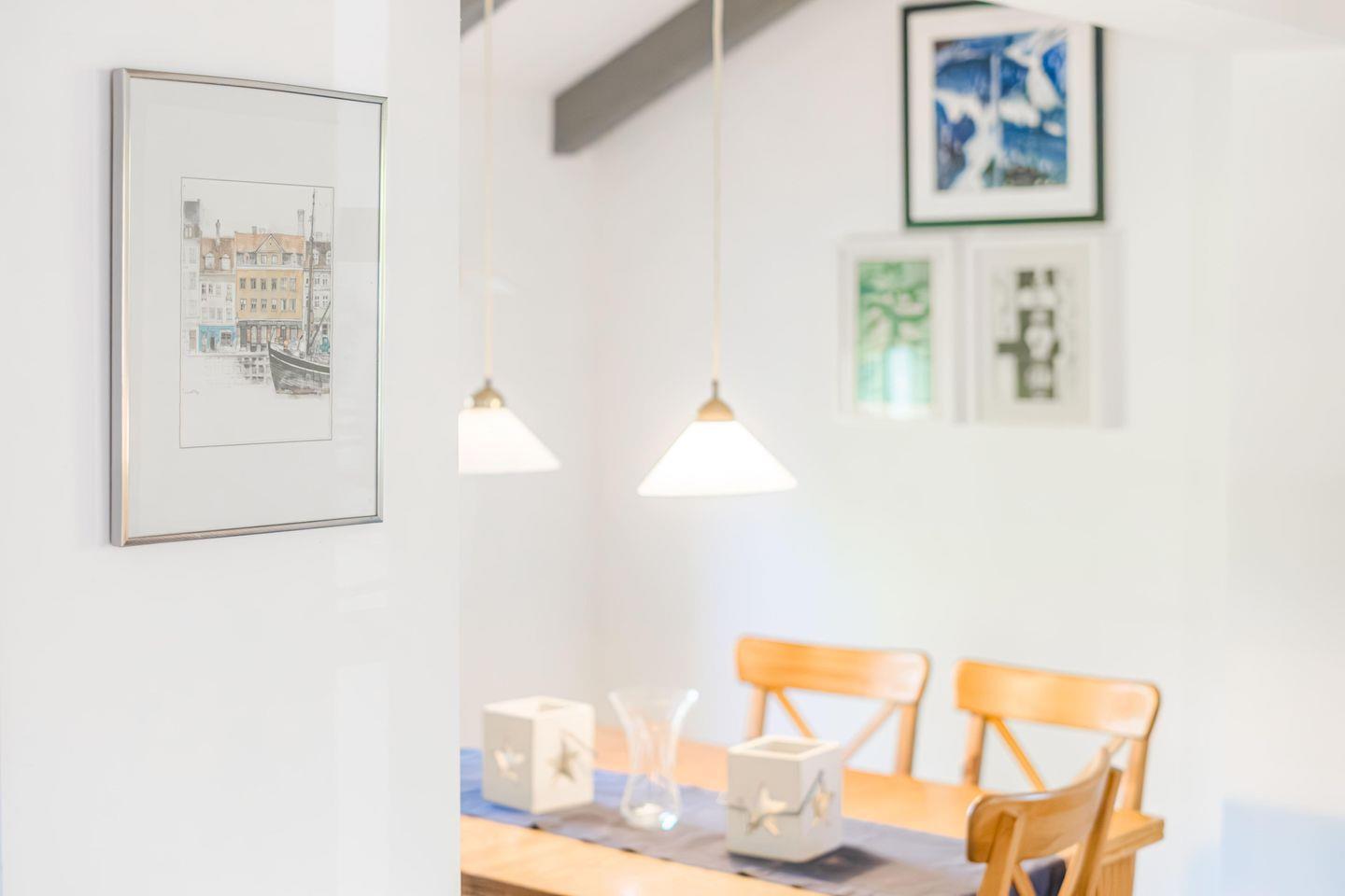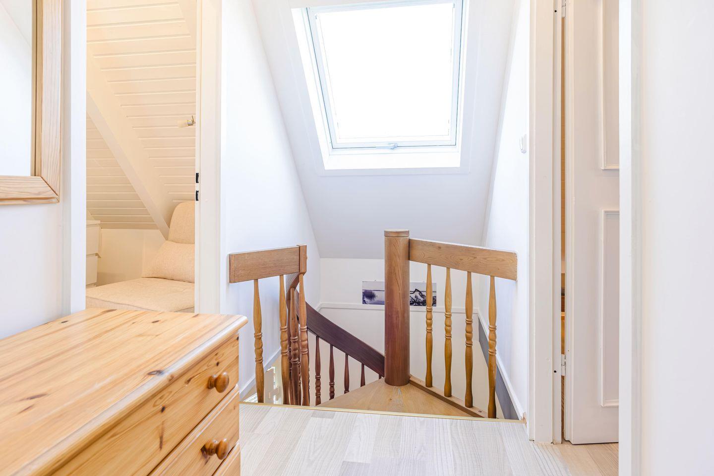 Zwei Schlafräume mit jeweils einem Doppelbett und das Bad befinden sich im Obergeschoss. Das Untergeschoss mit beidseitigem Tageslicht verfügt über einen Schlafraum mit Doppelbett in dem auch ein Schreibtisch zu finden ist. Außerdem ist dort das zweite Bad mit Dusche, WC und Waschmaschine.